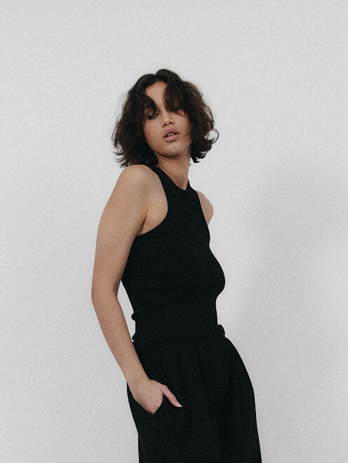 Dopasowana koszulka na ramiączkach typu bokserka. Po bokach zaczepne i mocne wycięcia. Prosty krój idealnie dopasowuje się do sylwetki i delikatnie podkreśla linię ramion. Zabudowany dekolt dopełnia całości. Można ją zestawić zarówno z jeansami jak i z dresami. Świetnie sprawdzi się jako baza pod marynarkę czy kardigan.