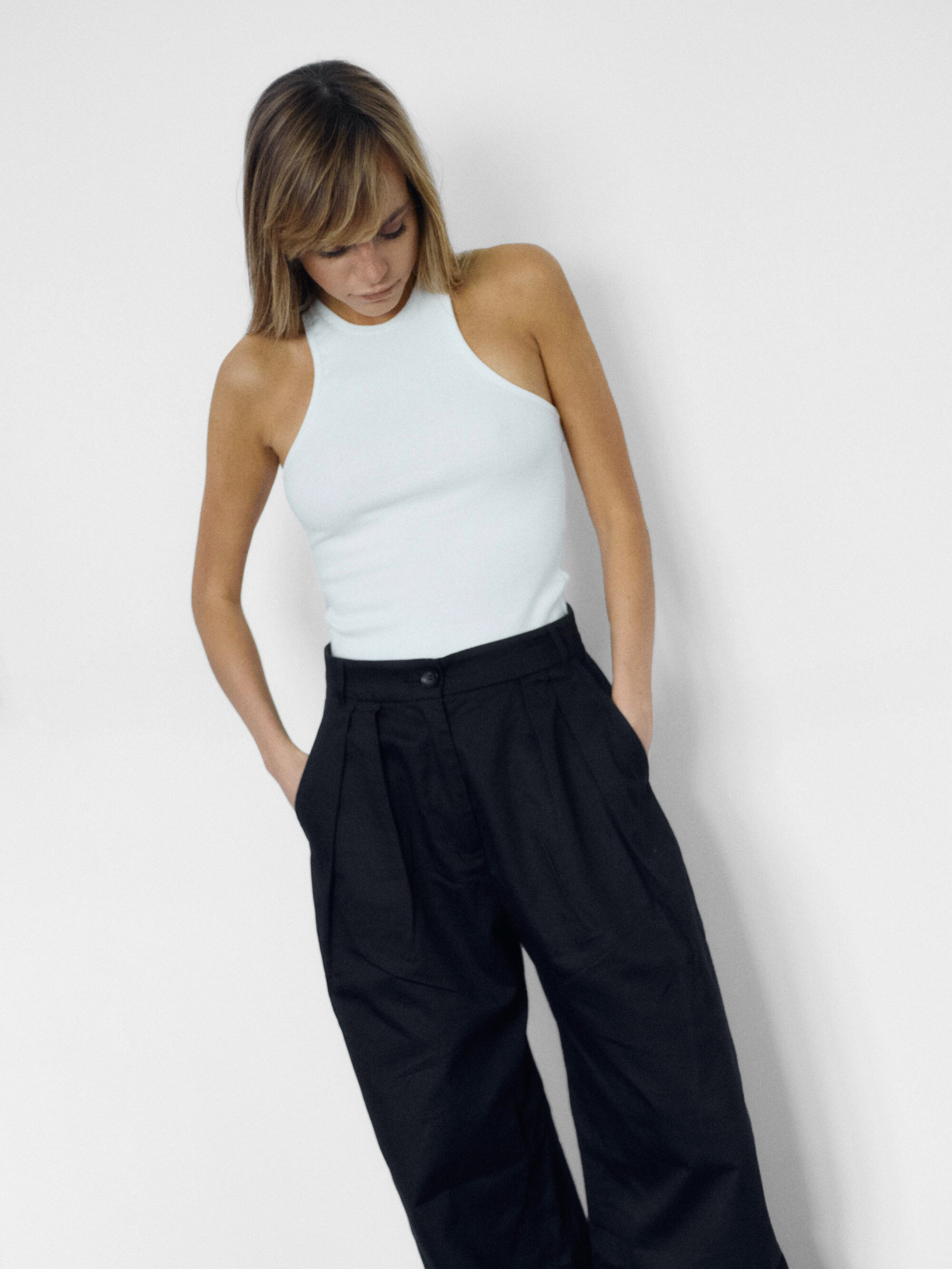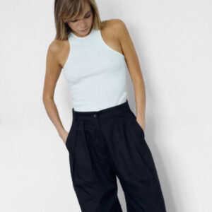 Dopasowana koszulka na ramiączkach typu bokserka. Po bokach zaczepne i mocne wycięcia. Prosty krój idealnie dopasowuje się do sylwetki i delikatnie podkreśla linię ramion. Zabudowany dekolt dopełnia całości. Można ją zestawić zarówno z jeansami jak i z dresami. Świetnie sprawdzi się jako baza pod marynarkę czy kardigan.