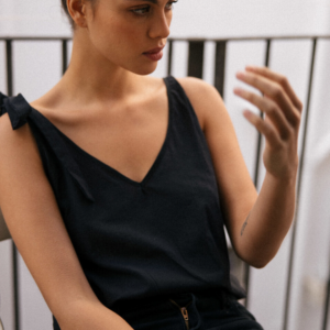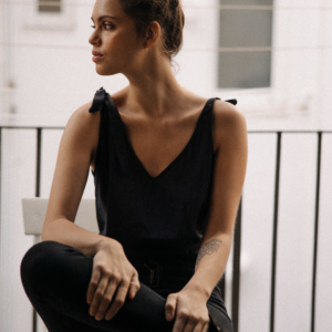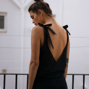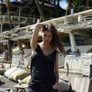 Oversize’owa koszulka typu backless z kolekcji GRLS GO PLACES. Wykonana w 100% z wysokogatunkowej, bardzo cienkiej i zwiewnej bawełny o niskiej gramaturze. Model delikatnie prześwituje, co dodatkowo nadaje mu lekkiego, niezobowiązującego, plażowego charakteru. Szerokie ramiączka zawiązywane są na estetyczne kokardki. Z przodu minimalistyczny dekolt w lekki trójkąt, z tyłu głębokie wycięcie, w kształcie litery V, podkreślające linię pleców. Z prawej strony na dole wszyta mała metka z eko skóry z delikatnie wytłoczonym logo marki.
