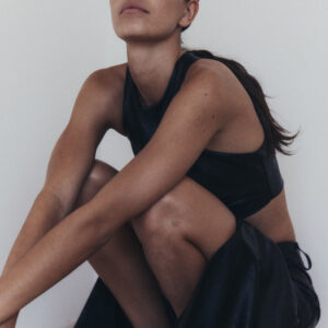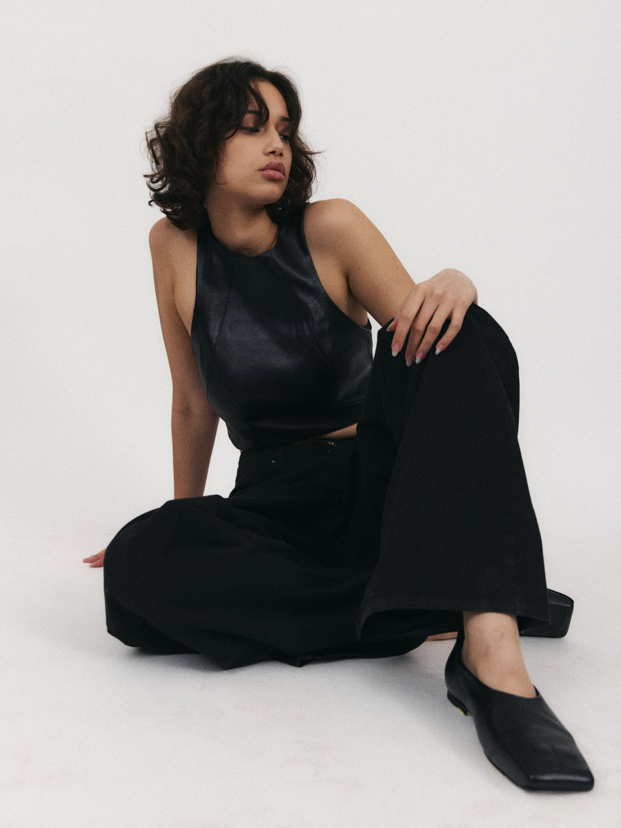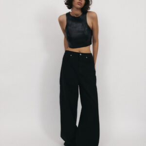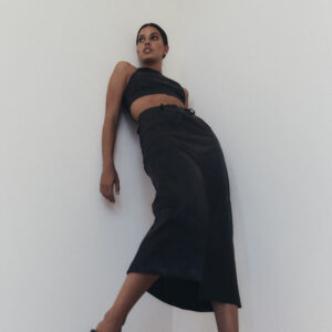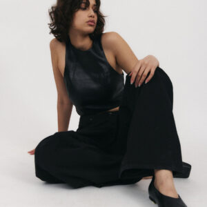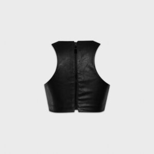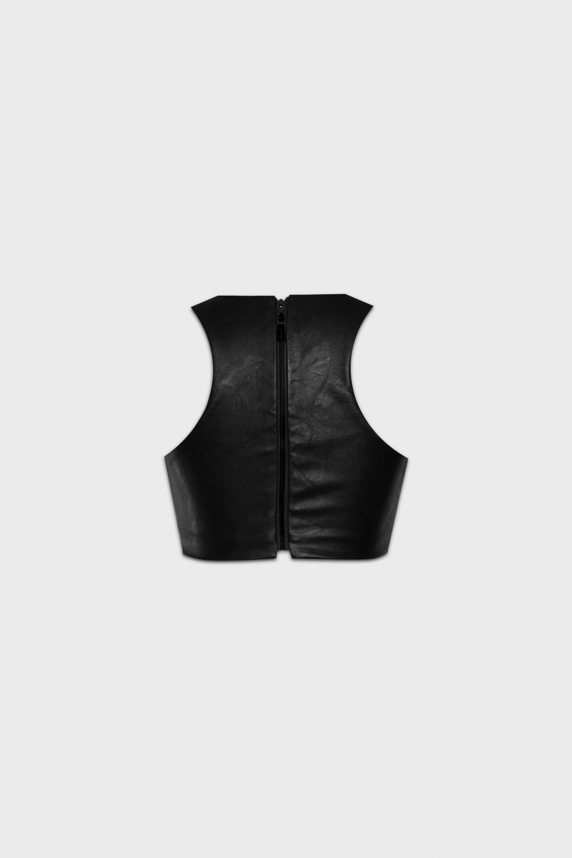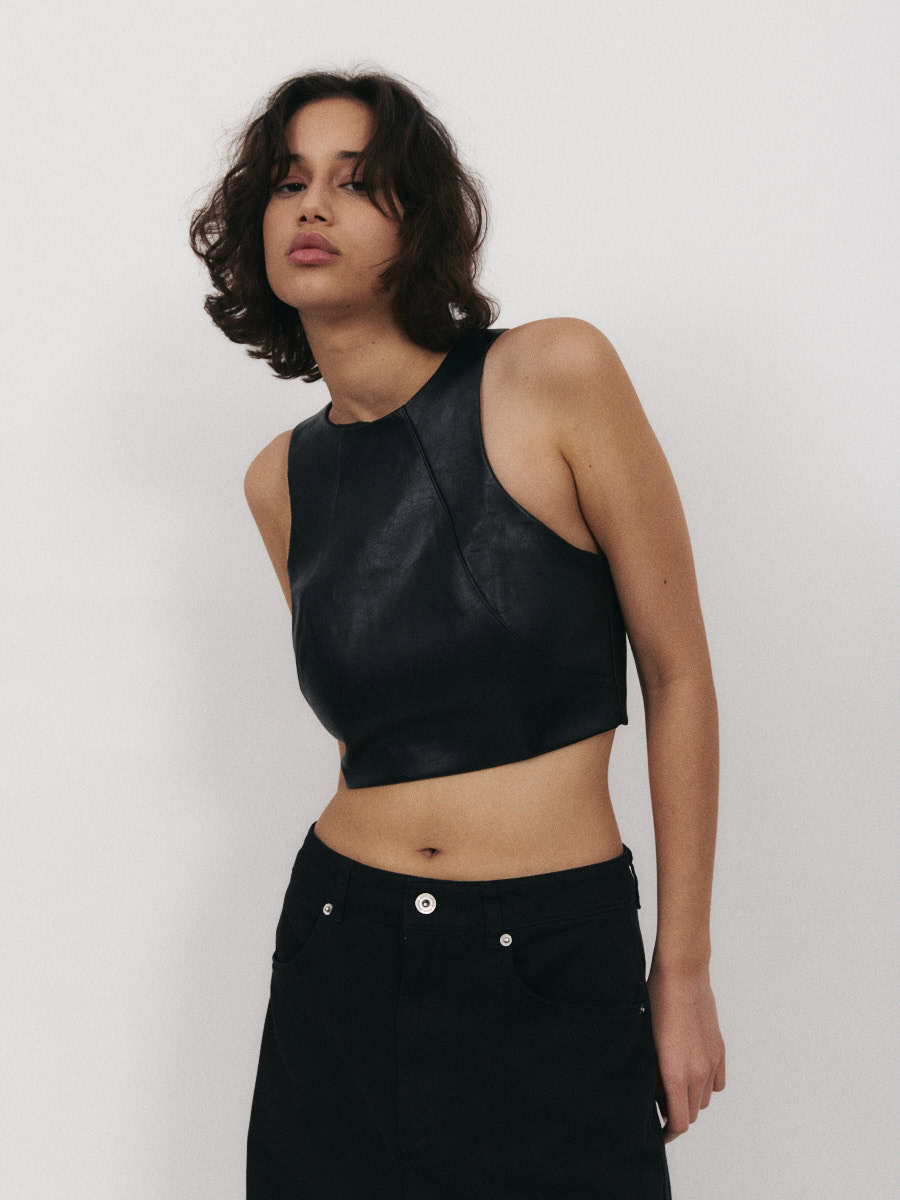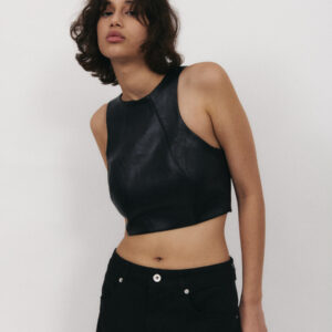 Krótki, dopasowany top typu basic. Zaczepne wycięcia po obu stronach pięknie eksponują ramiona. Zaszewki idealnie podtrzymują i dopasowują się do biustu. Zapinany z tyłu na zamek. Nieoczywisty, odważny krój idealnie sprawdzi się w zestawie z długą spódnicą lub spodniami z wysokim stanem.