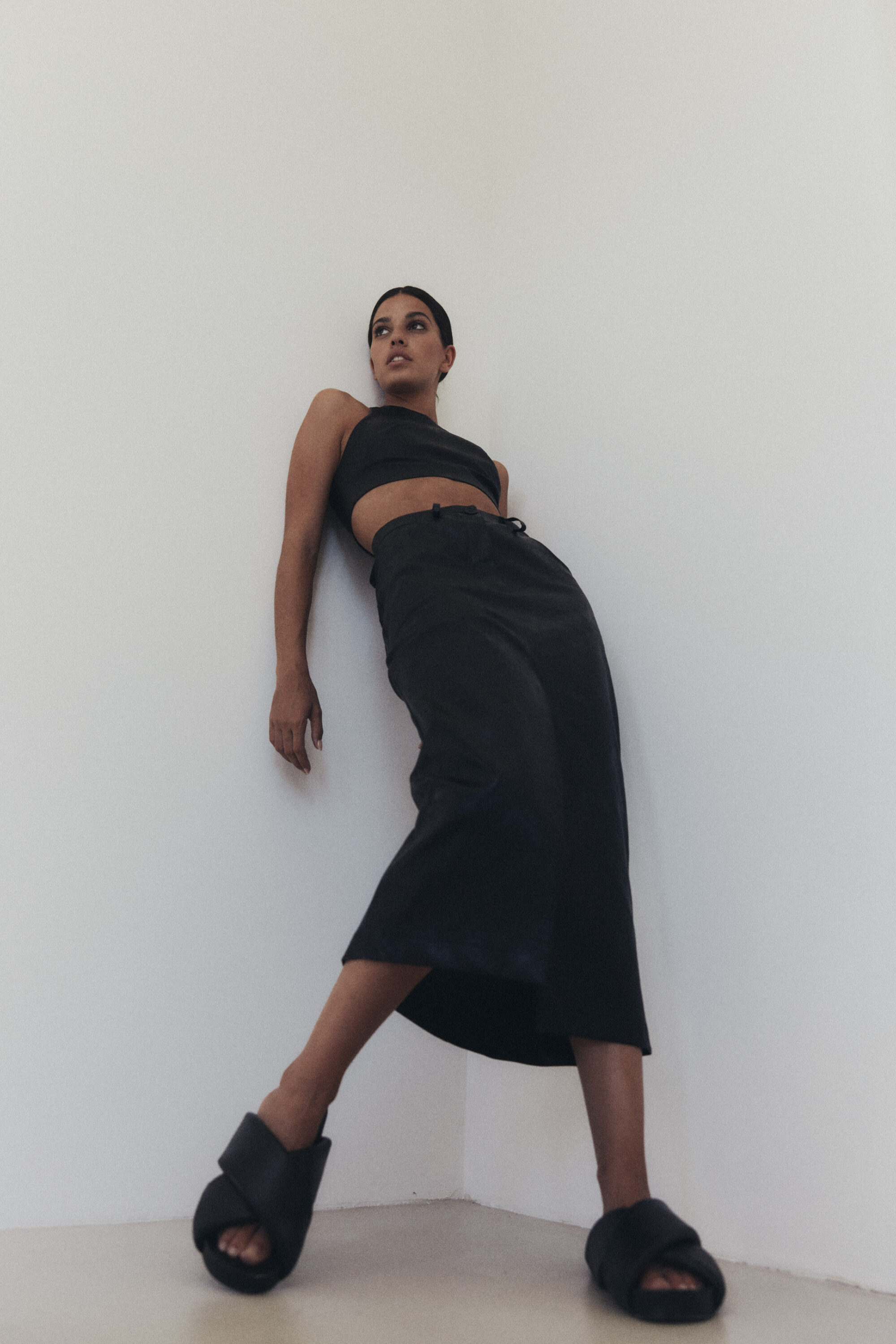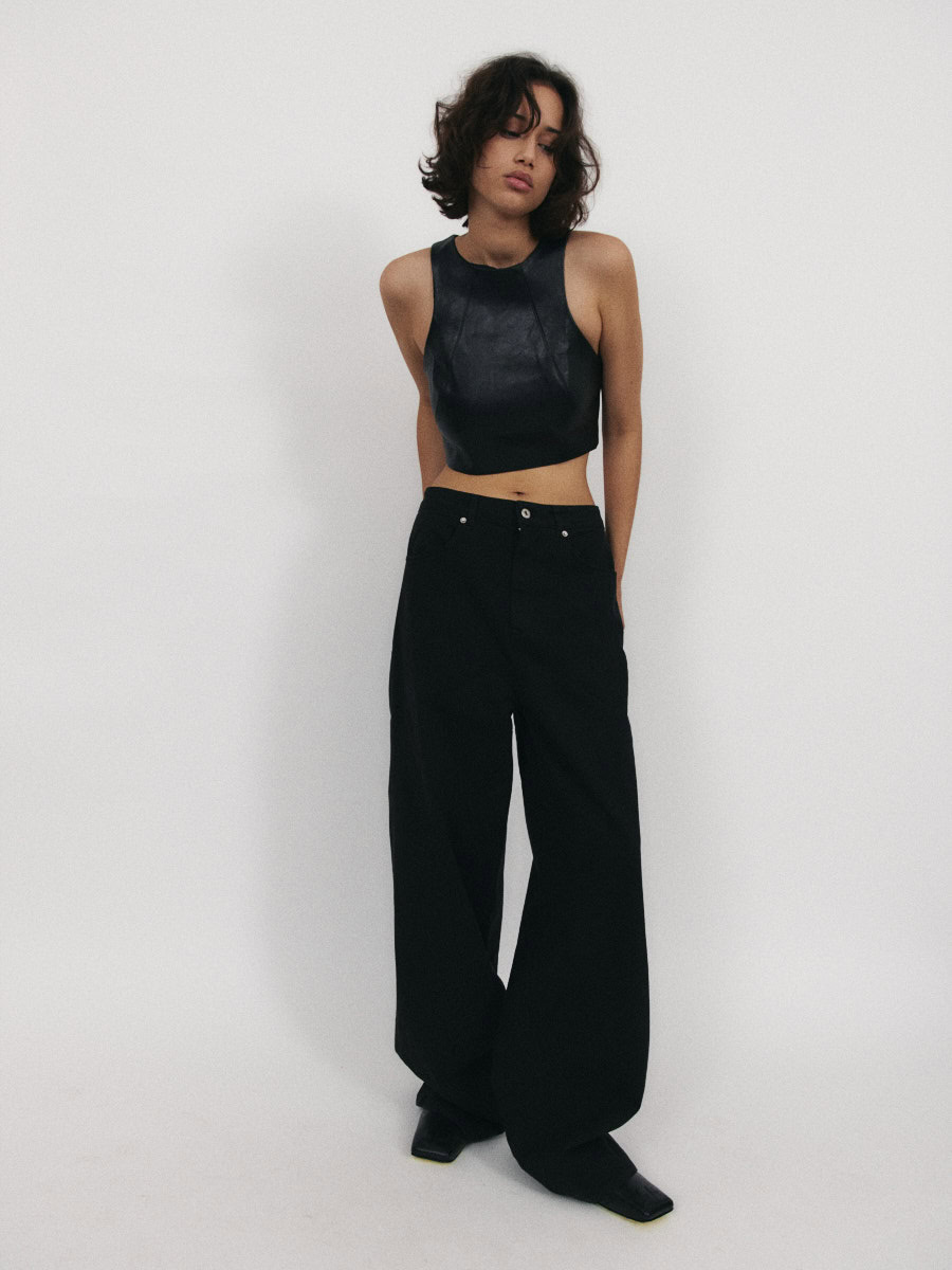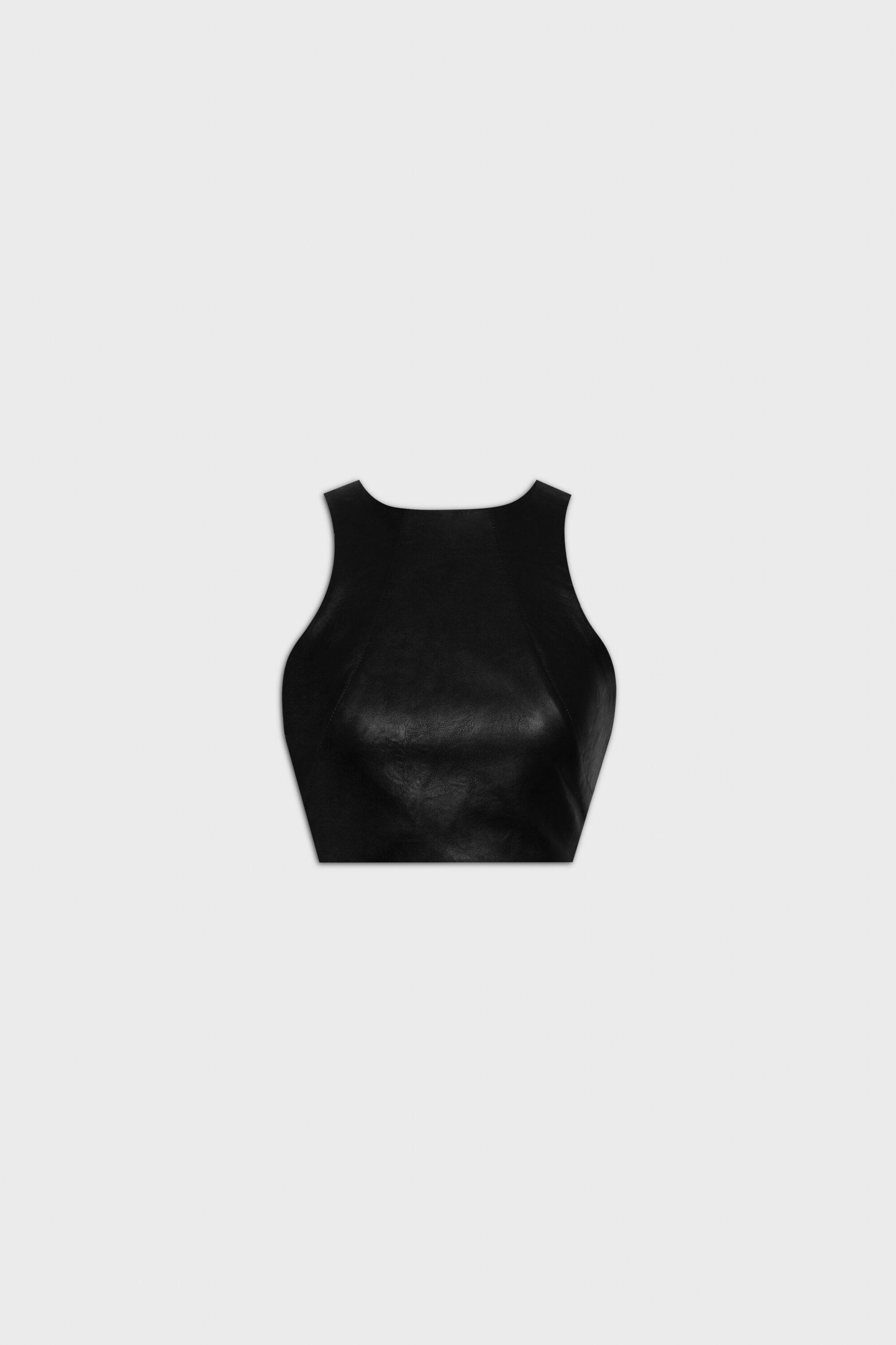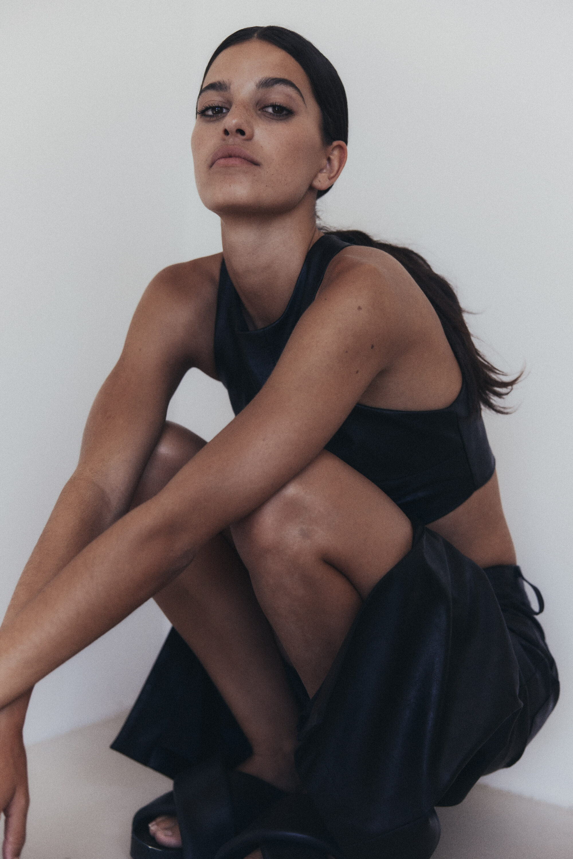 Krótki, dopasowany top typu basic. Zaczepne wycięcia po obu stronach pięknie eksponują ramiona. Zaszewki idealnie podtrzymują i dopasowują się do biustu. Zapinany z tyłu na zamek. Nieoczywisty, odważny krój idealnie sprawdzi się w zestawie z długą spódnicą lub spodniami z wysokim stanem.