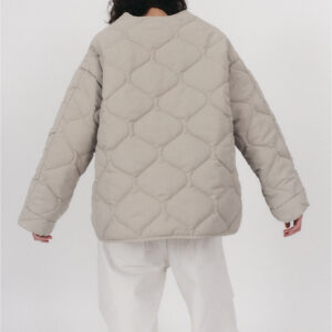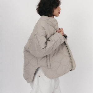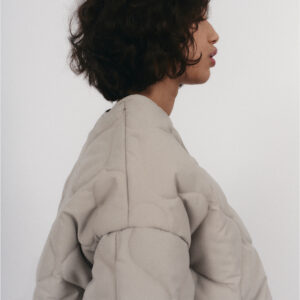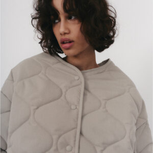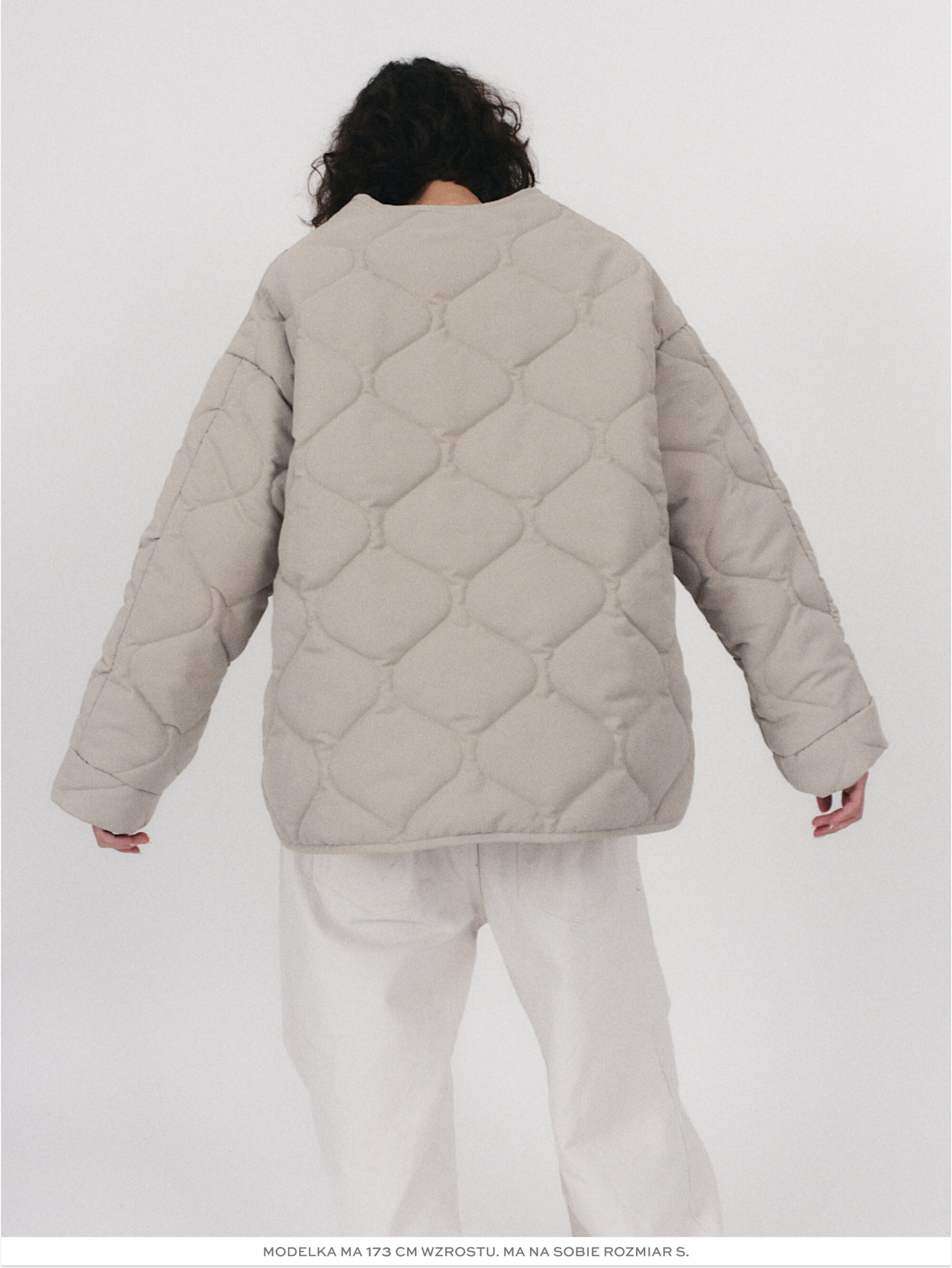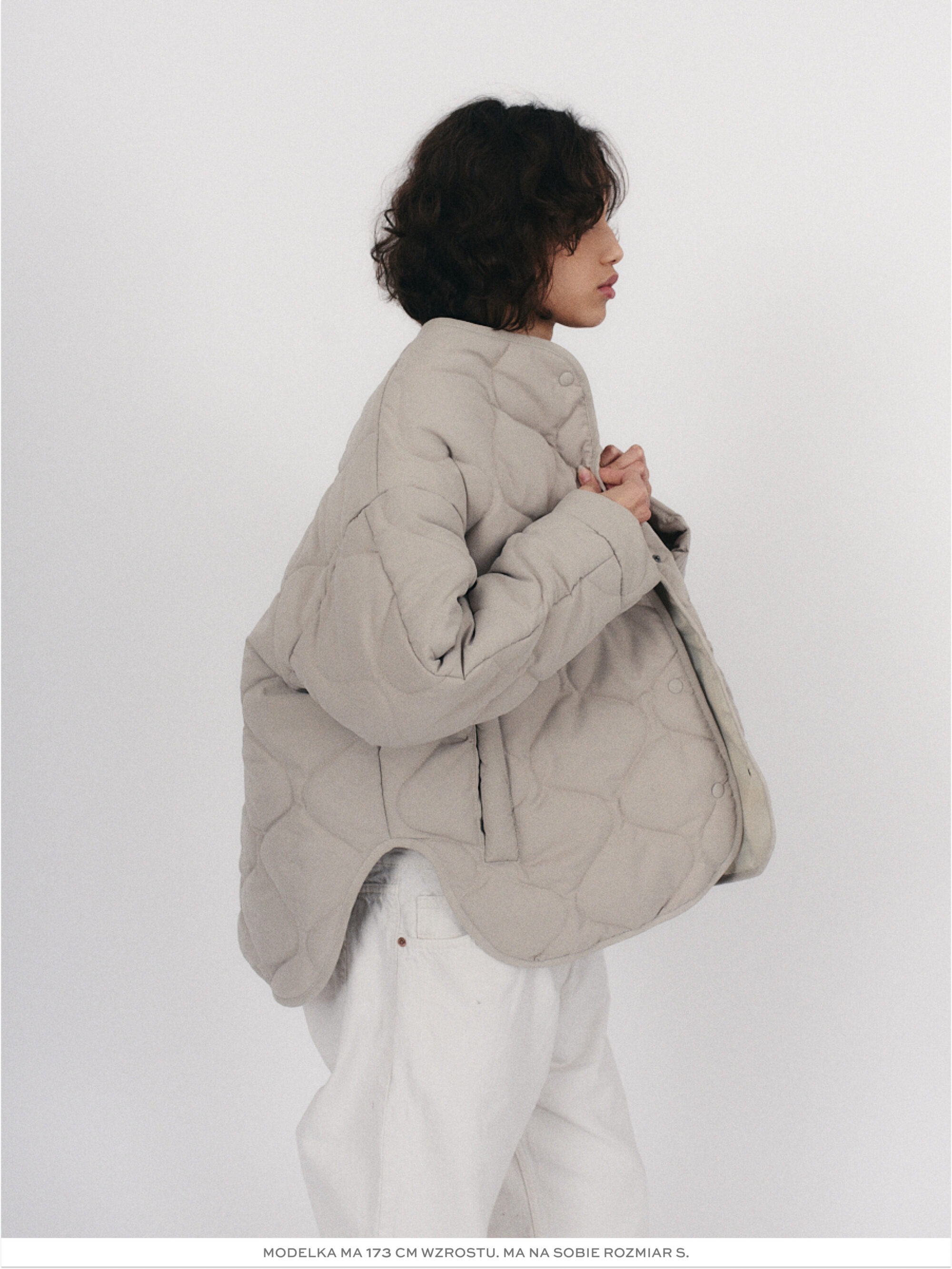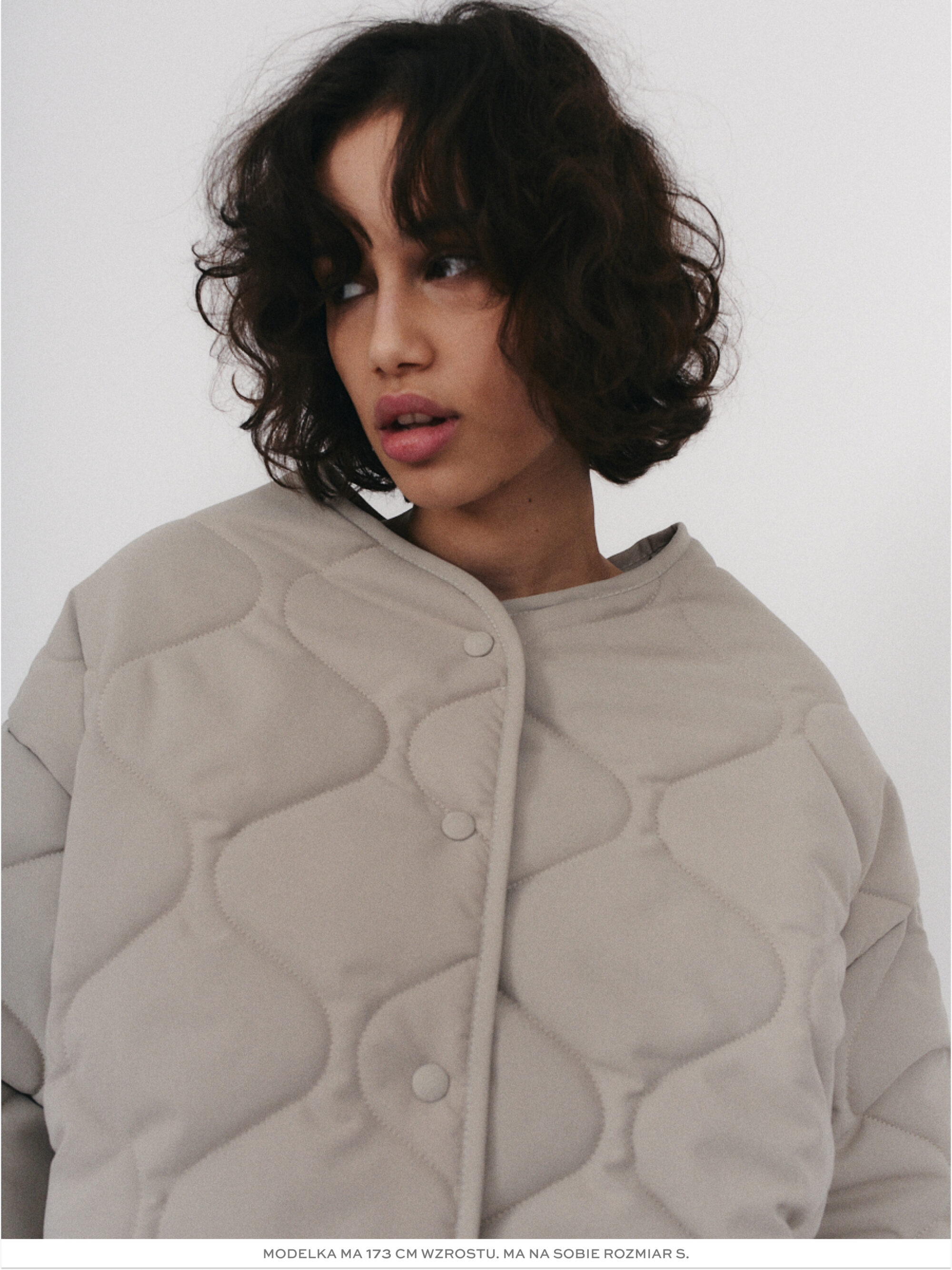 Mocno oversize’owa kurtka zapinana na metalowe guziki obite materiałem w tym samym kolorze. Pikowanie w “cebulki” i matowe wykończenie z meszkiem na wierzchu dopełnia całości – kurtka jest przemiła w dotyku. Posiada dwie głębokie kieszenie po bokach. Świetnie wygląda zarówno do spodni jak i sukienek. Najlepiej sprawdzi się w monochromatycznych zestawach.