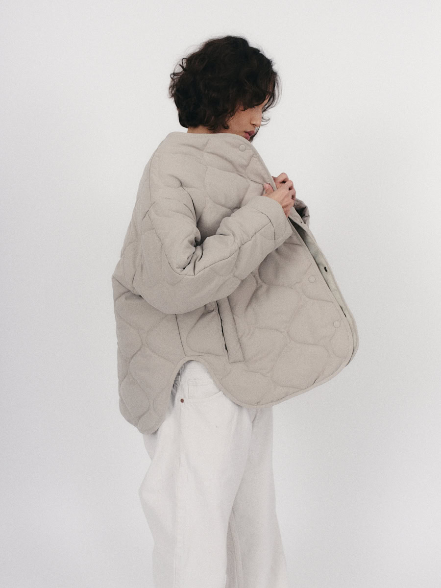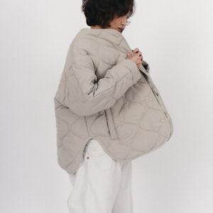 Mocno oversize’owa kurtka zapinana na metalowe guziki obite materiałem w tym samym kolorze. Pikowanie w “cebulki” i matowe wykończenie z meszkiem na wierzchu dopełnia całości – kurtka jest przemiła w dotyku. Posiada dwie głębokie kieszenie po bokach. Świetnie wygląda zarówno do spodni jak i sukienek. Najlepiej sprawdzi się w monochromatycznych zestawach.