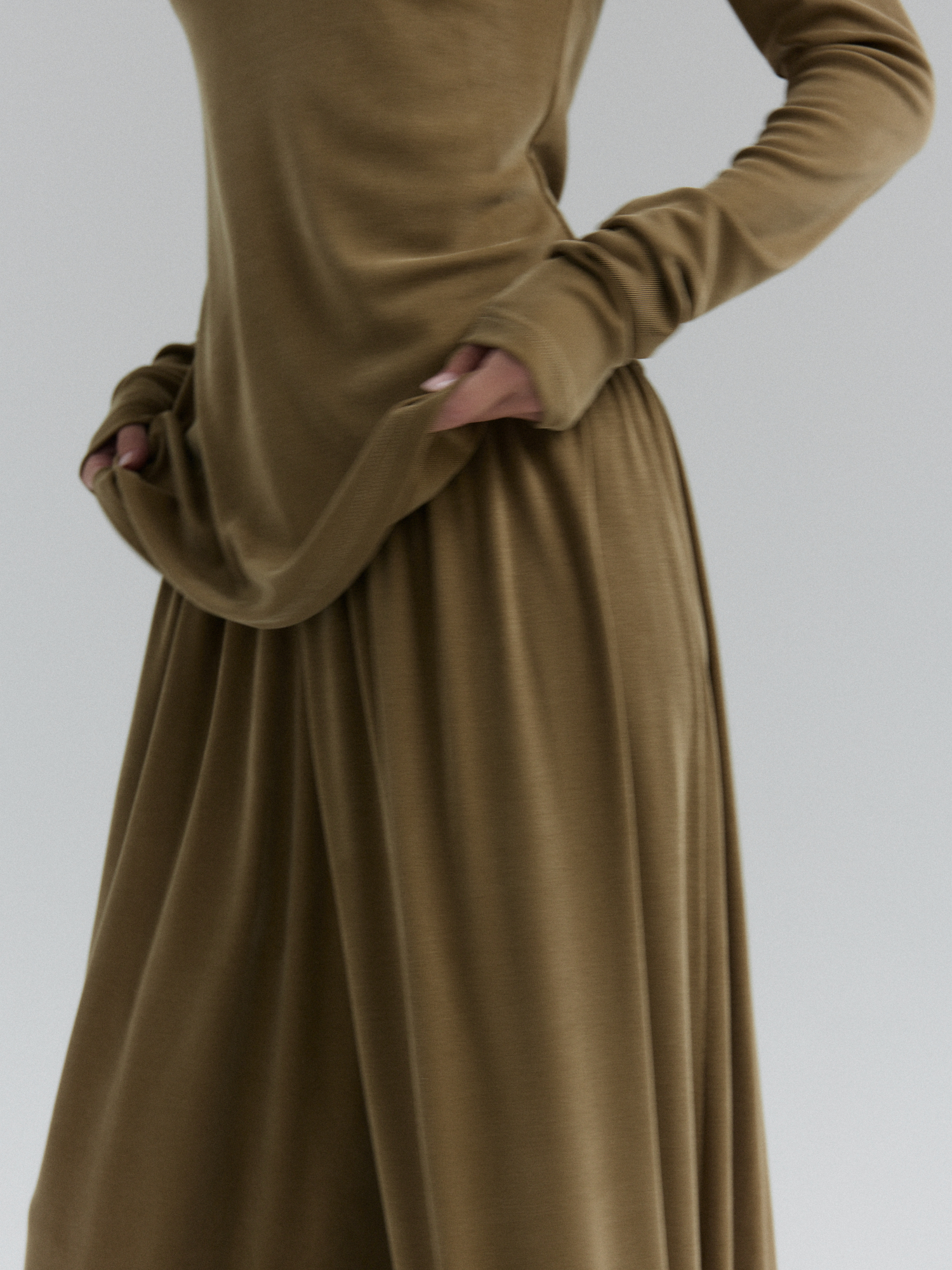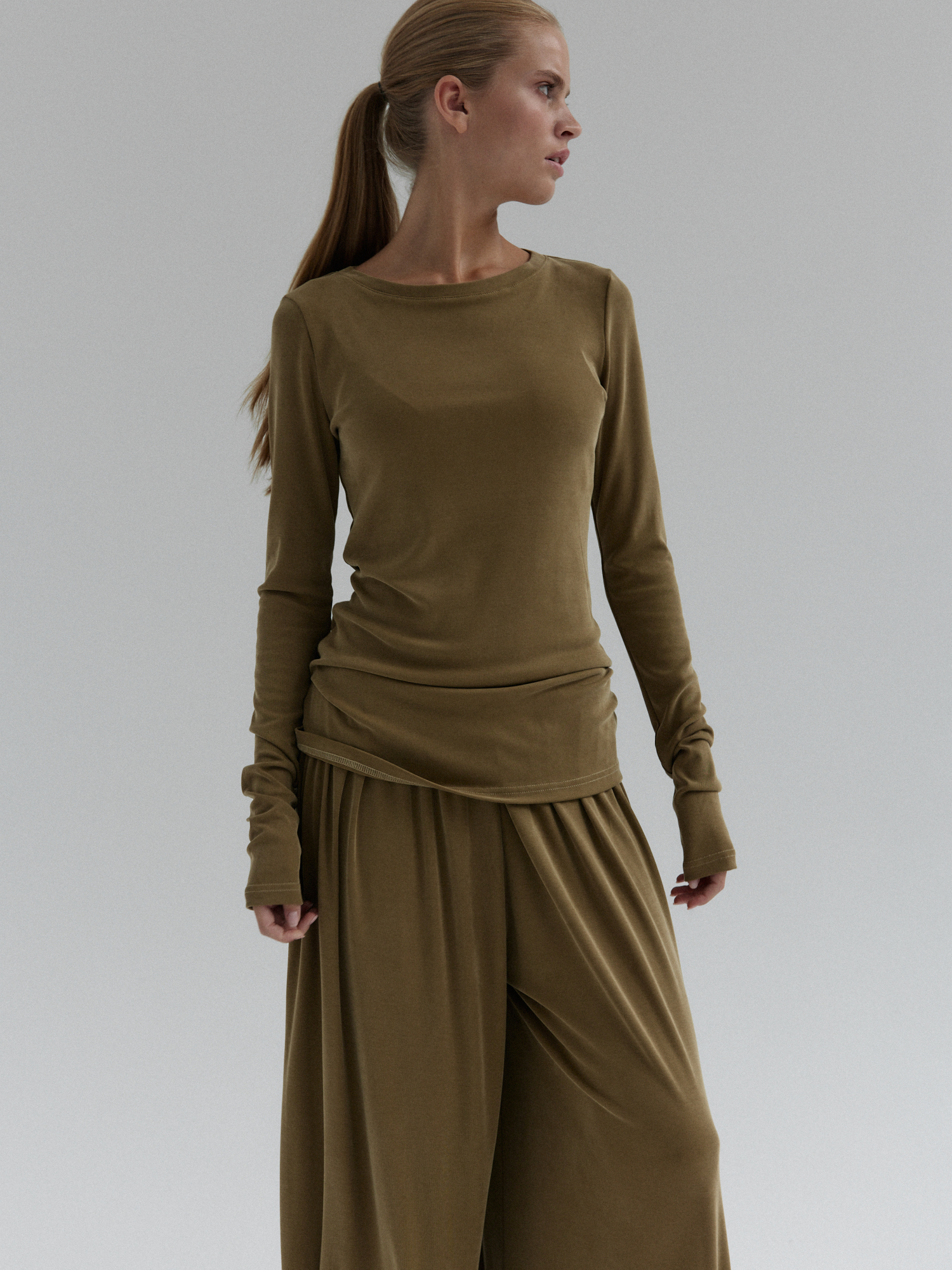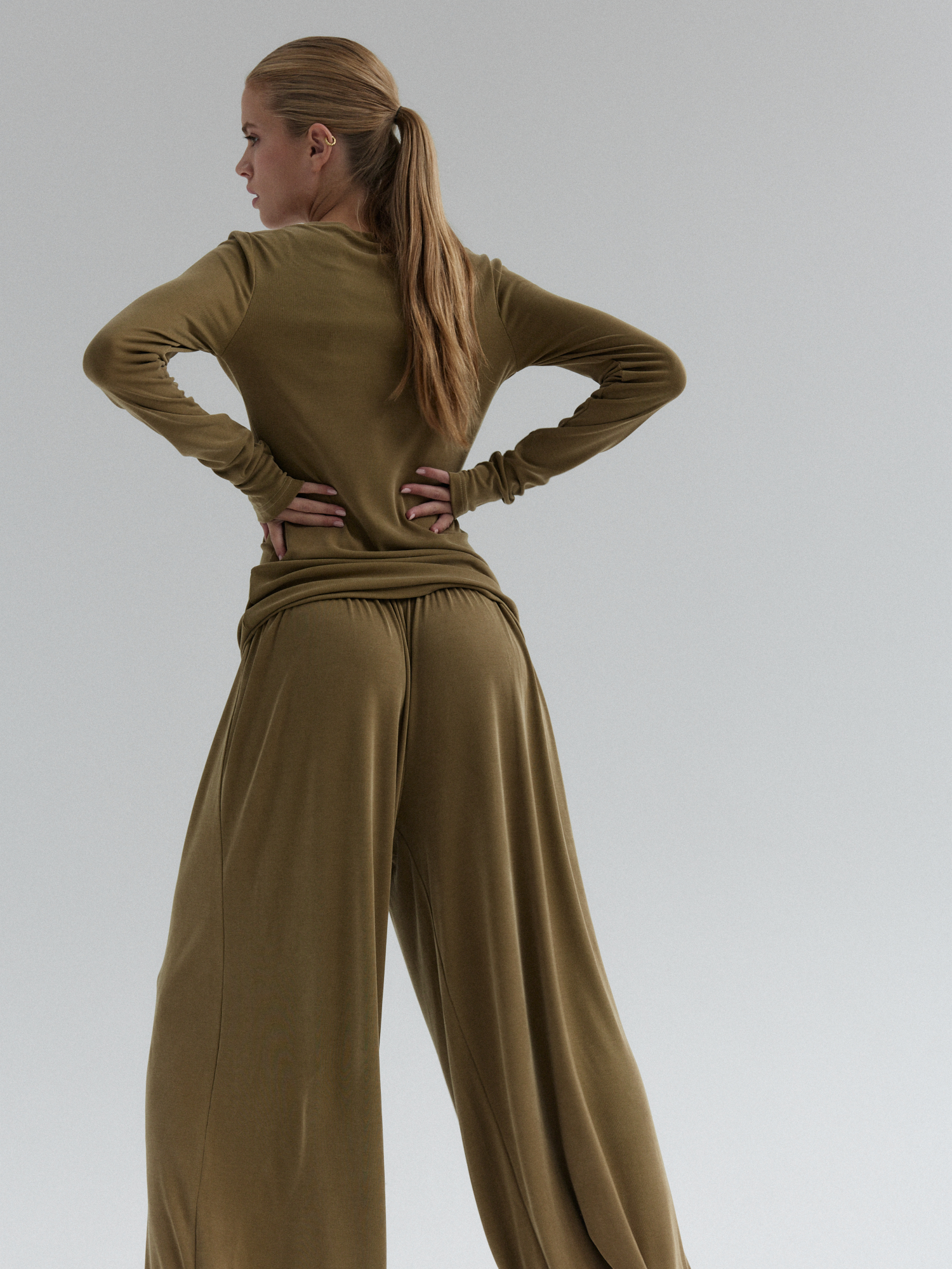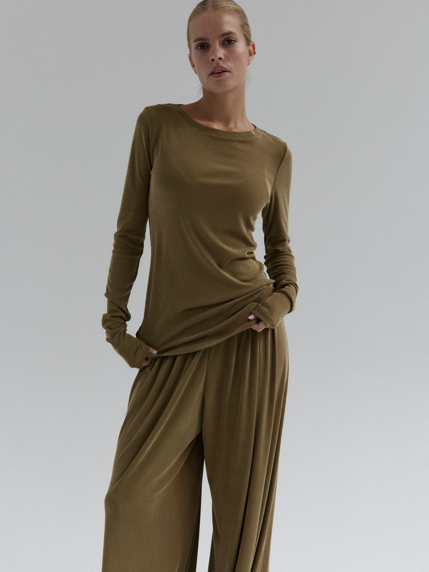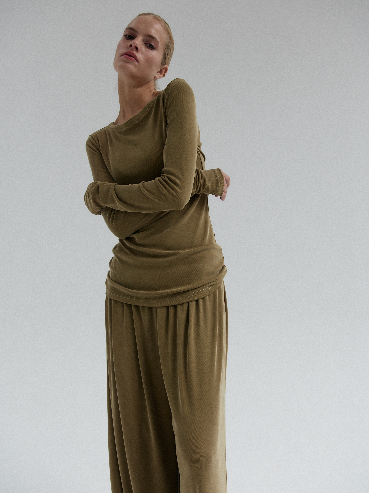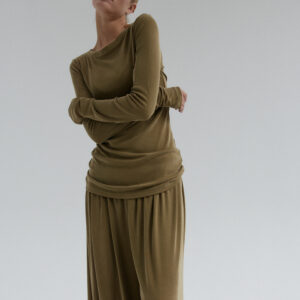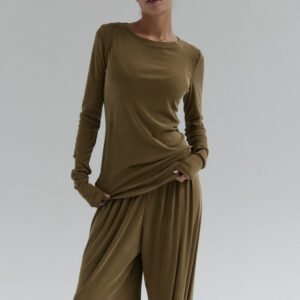 Longsleeve CIEO uszyty jest z wiskozy z dodatkiem poliestru i elastanu. Wykonany z materiału o jedwabistej miękkości, przypominający w dotyku naturalny jedwab, ale łatwiejszy w pielęgnacji i bardziej wytrzymały na codzienne użytkowanie. Jest niezwykle miękki, lejący się, dzięki czemu idealnie dopasowuje się do sylwetki, zapewniając komfort noszenia. Jednocześnie jest odporny na zagniecenia co sprawia, że set CIEO będzie idealną opcją na co dzień.