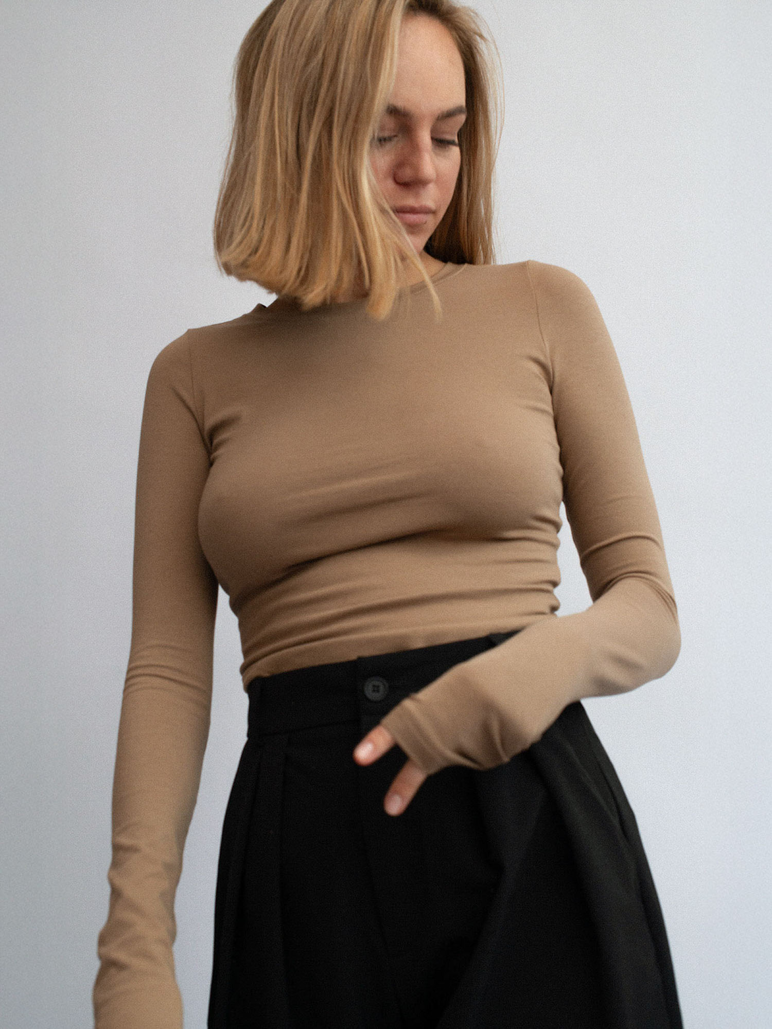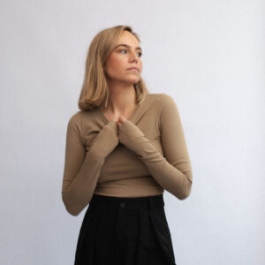Lekko dopasowany longsleeve o klasycznym kroju. Wygodny, minimalistyczny, z zaczepnie przydługimi rękawami. Absolutna baza każdego zestawu. Model doskonały zarówno na co dzień jak i na wieczór. Długość longsleeve’u jest odpowiednia dla każdego rodzaju spodni, jeansów i leginsów. Najlepiej prezentuje się w monochromatycznych zestawach.