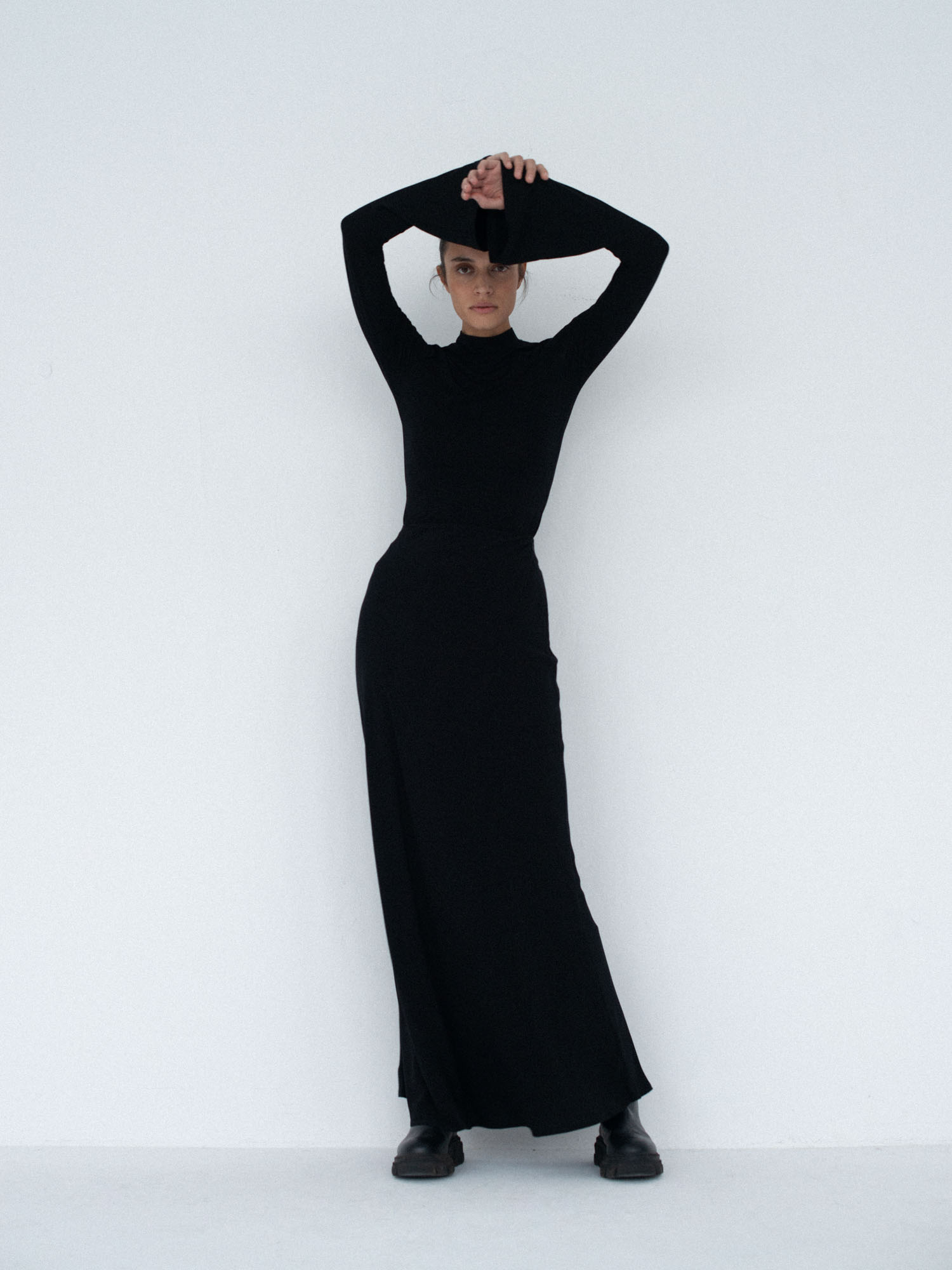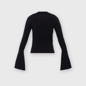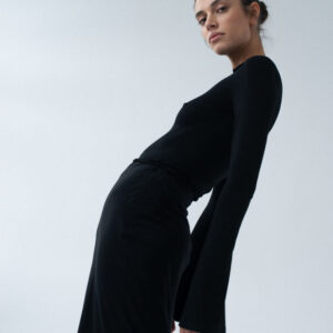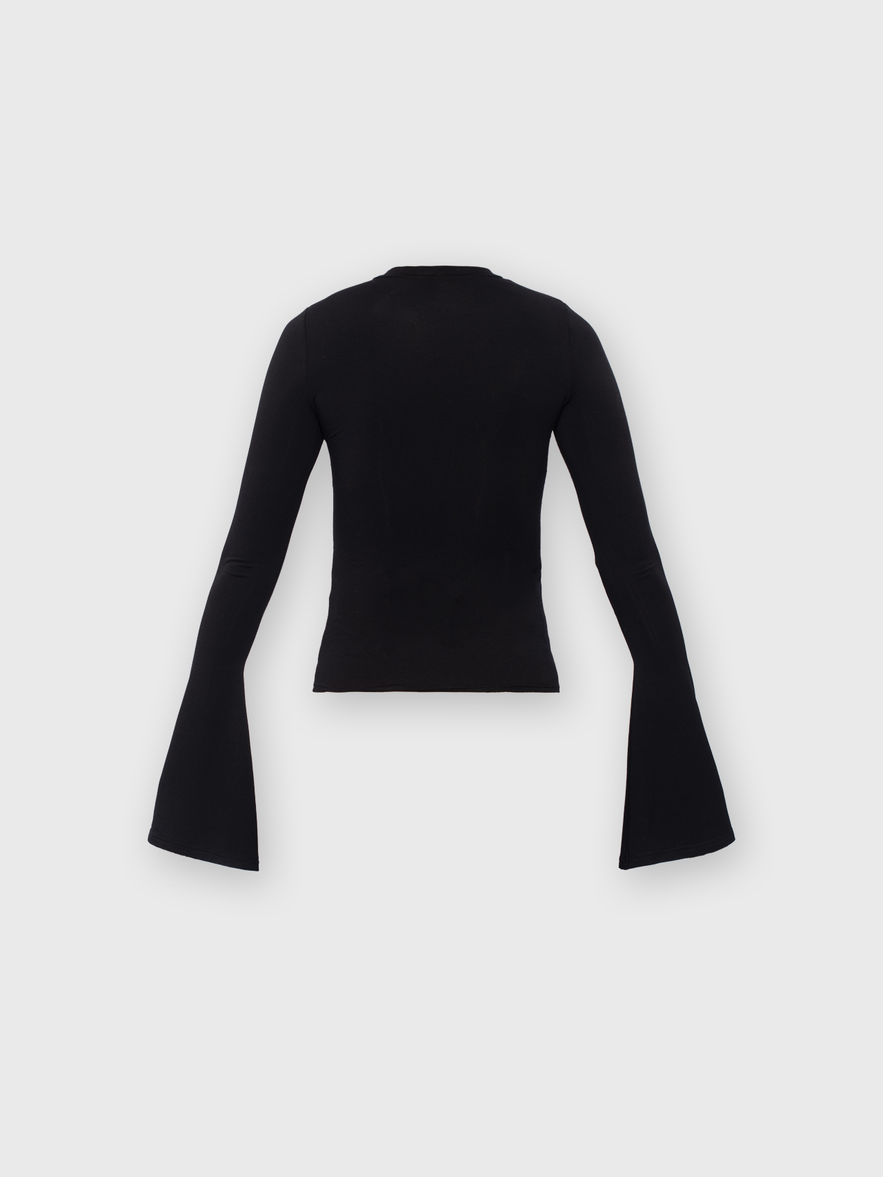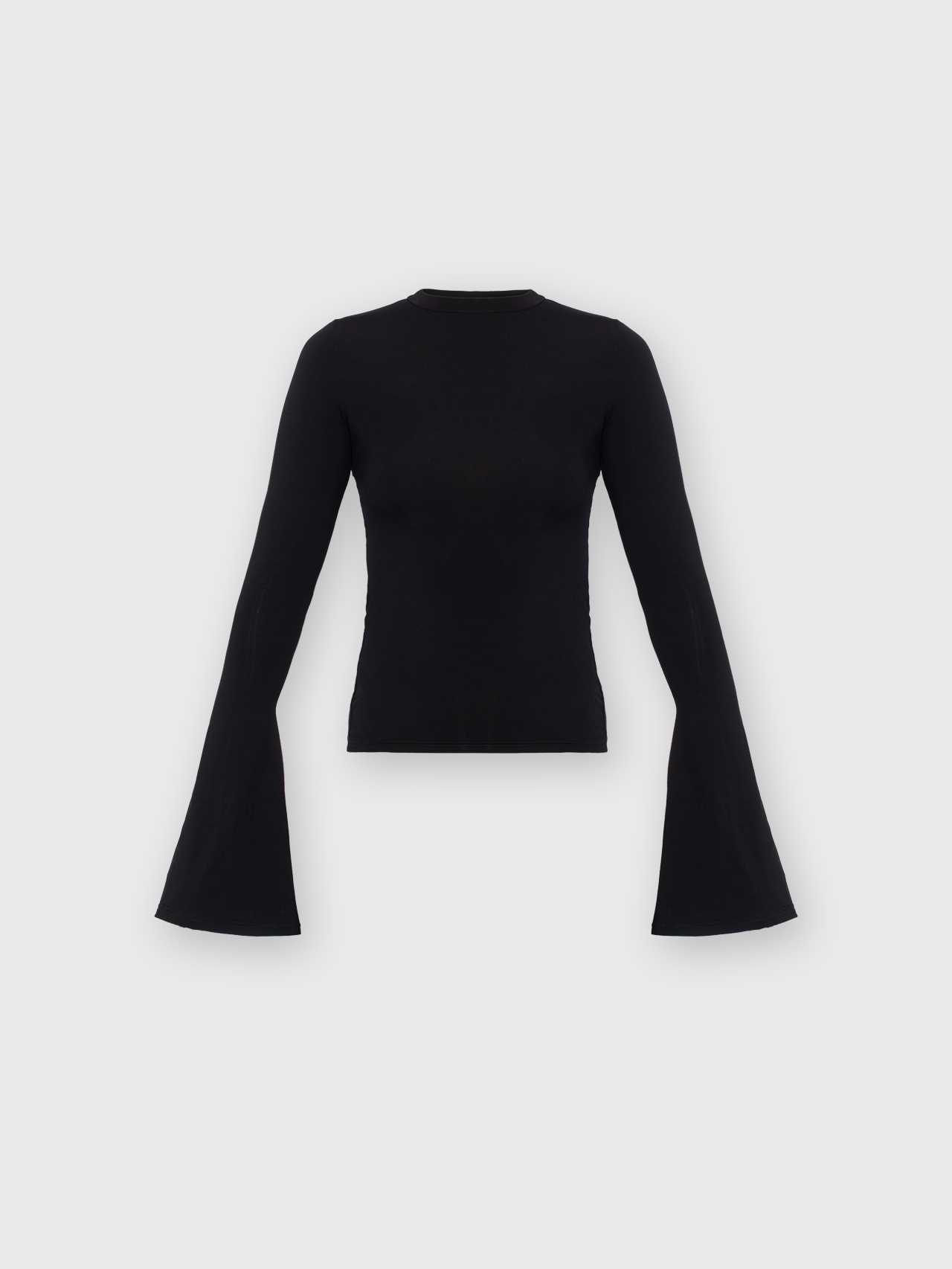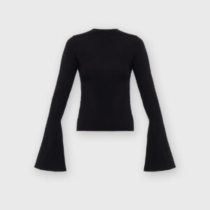 Dopasowany longsleeve o klasycznym kroju ze stójką. Rozszerzane rękawy od połowy przedramienia nadają mu charakteru i subtelnej lekkości. Model wygodny, miękki i minimalistyczny. Stanowi doskonałą bazę wielu stylizacji. Sprawdzi się zarówno na co dzień, jak i na wieczorne wyjścia. Jego długość dobrze komponuje się z różnymi fasonami spodni – od jeansów po legginsy. Najlepiej prezentuje się w monochromatycznych zestawach.