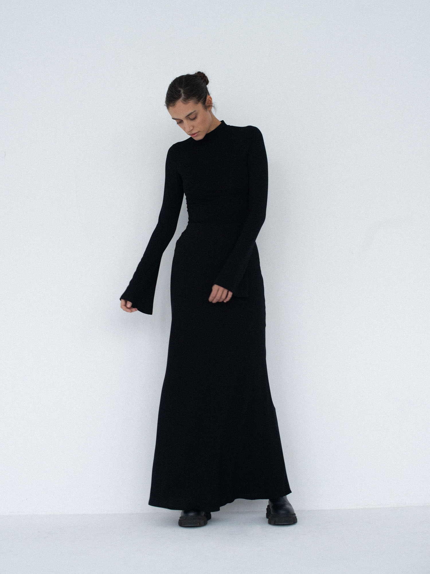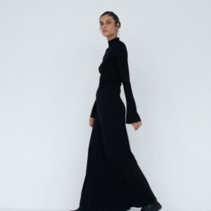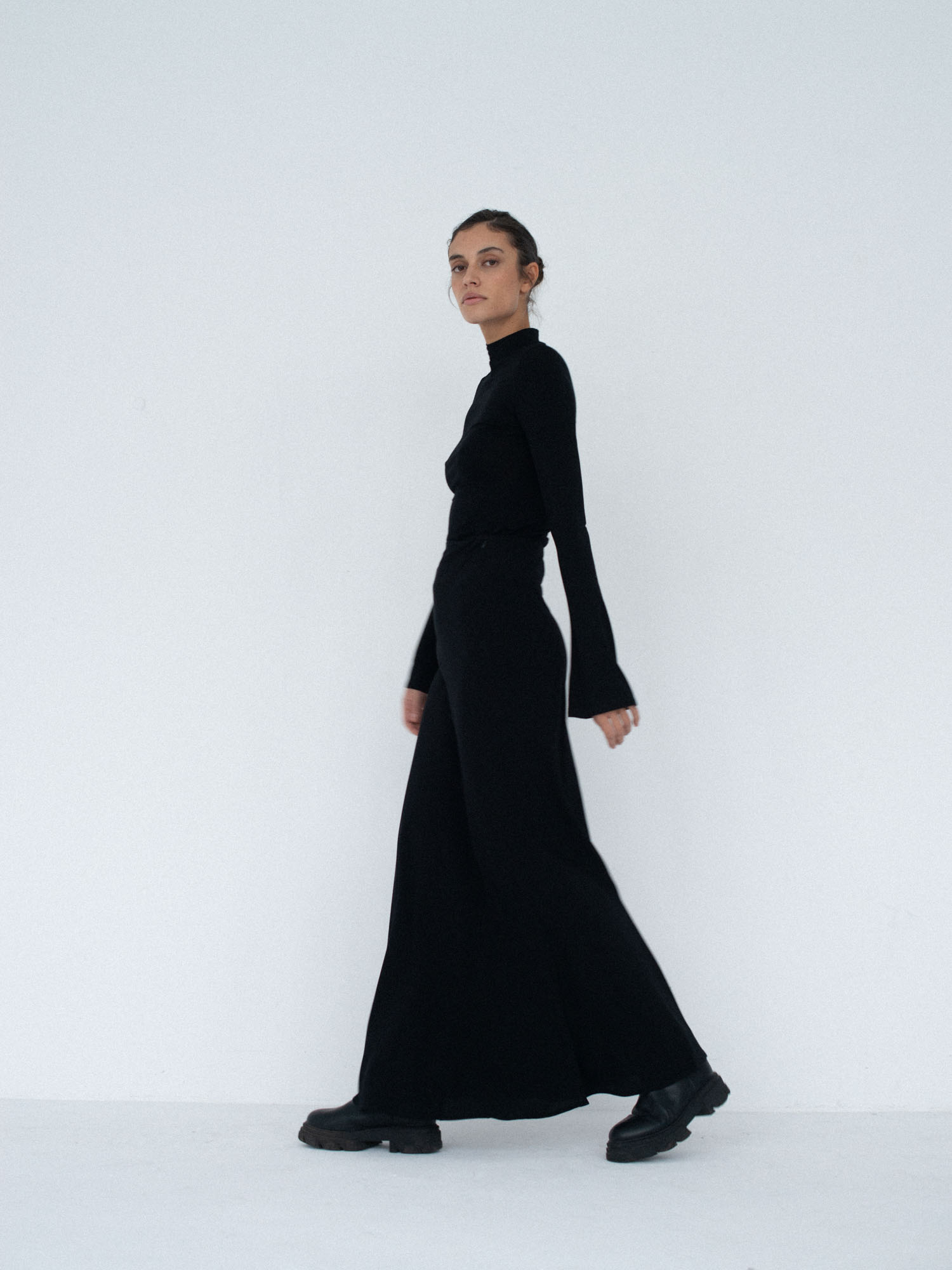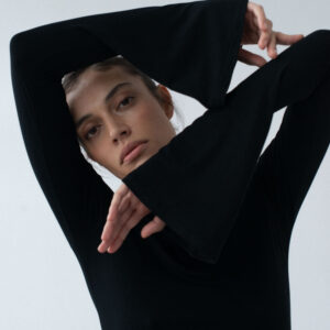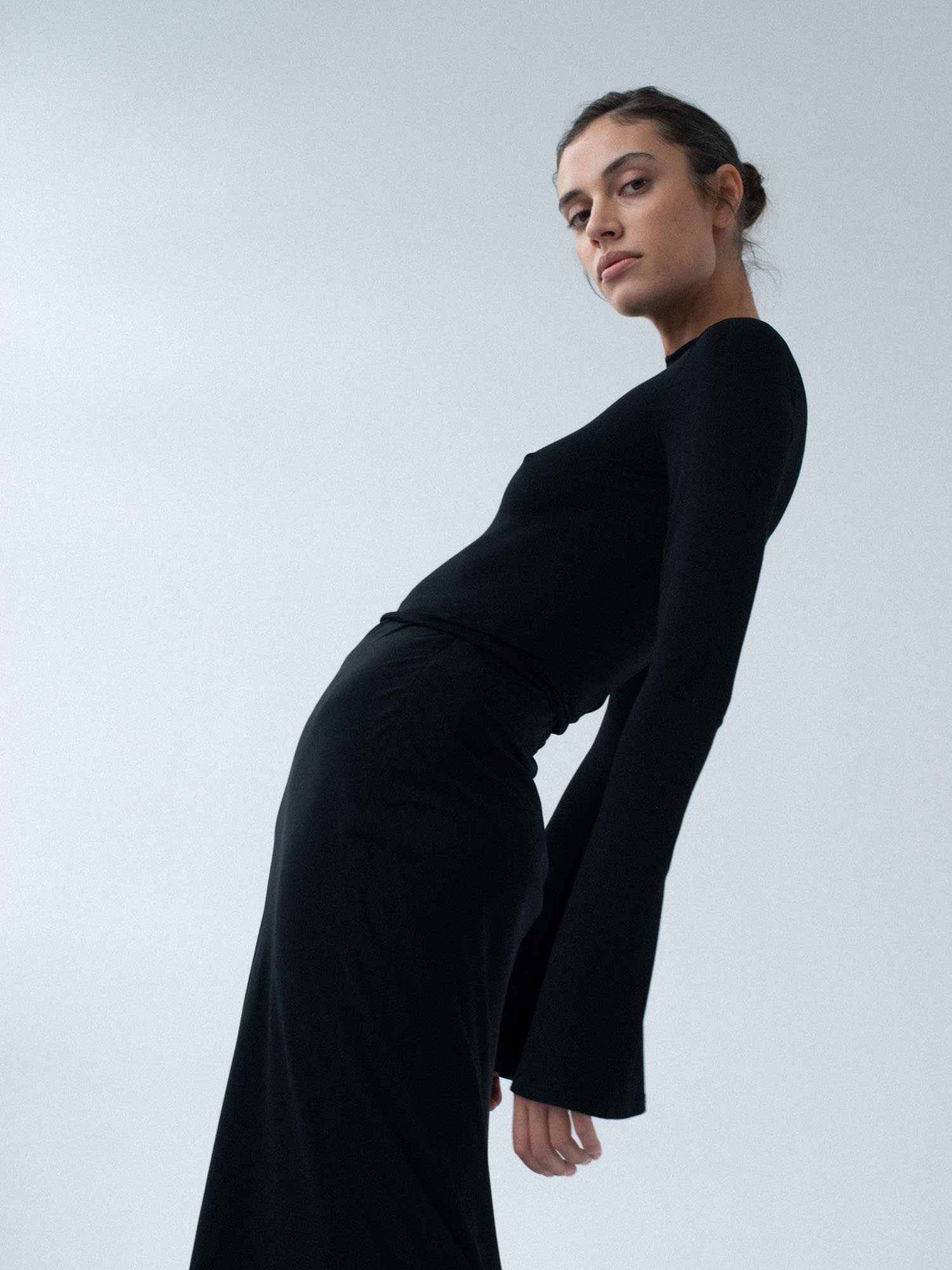 Dopasowany longsleeve o klasycznym kroju ze stójką. Rozszerzane rękawy od połowy przedramienia nadają mu charakteru i subtelnej lekkości. Model wygodny, miękki i minimalistyczny. Stanowi doskonałą bazę wielu stylizacji. Sprawdzi się zarówno na co dzień, jak i na wieczorne wyjścia. Jego długość dobrze komponuje się z różnymi fasonami spodni – od jeansów po legginsy. Najlepiej prezentuje się w monochromatycznych zestawach.