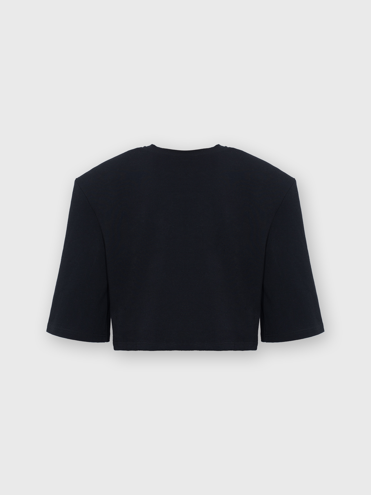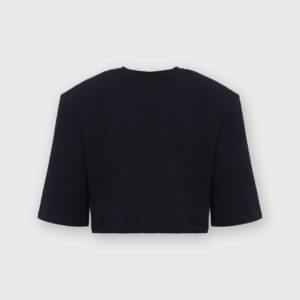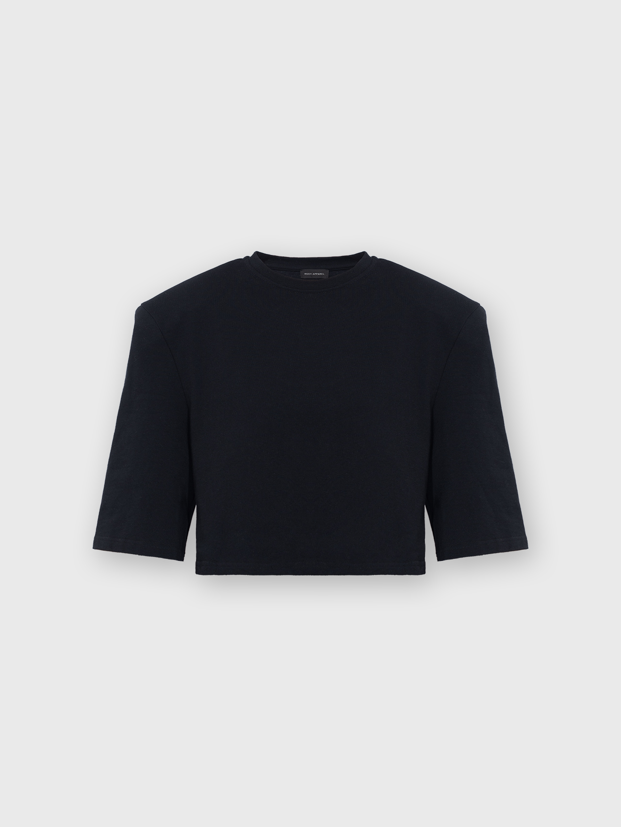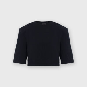 Oversize’owy, cropowany longsleeve z zabudowanym dekoltem. Pudełkowy krój i wyraźnie poszerzana linia ramion tworzą mocną, geometryczną sylwetkę inspirowaną power dressingiem mody biurowej z lat 80. Obszerne, wewnętrzne poduszki podkreślają ramiona i nadają całości zdecydowanego, zadziornego charakteru. Skrócona długość świetnie kontrastuje z szeroką górą. Longsleeve idealny do spodni z wysokim stanem, garniturowych spódnic albo luźnych jeansów. To model, który buduje całą stylizację.