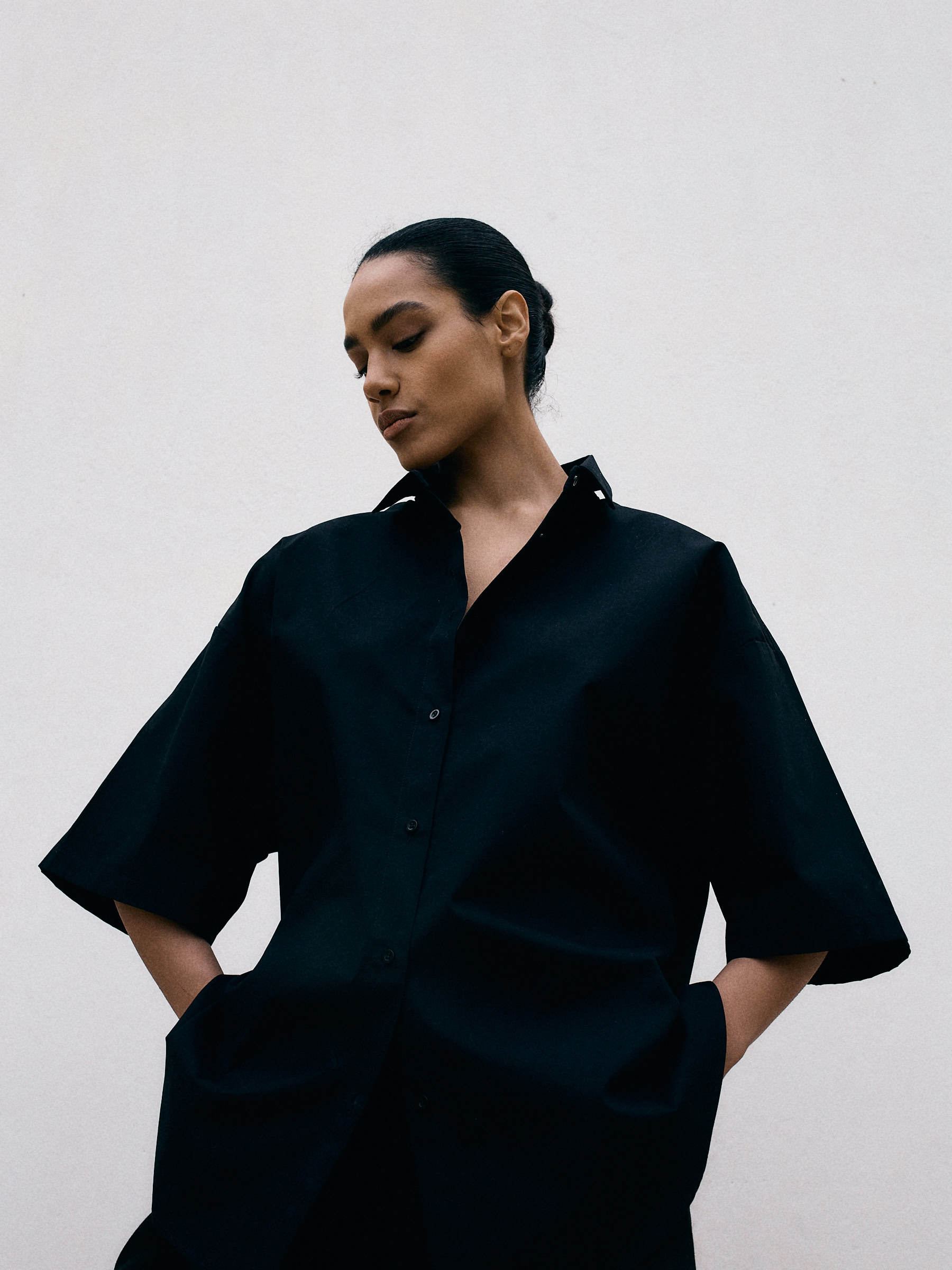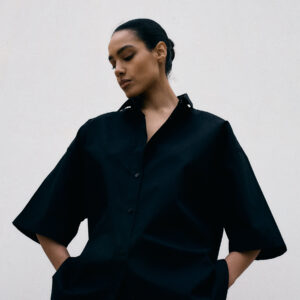 Koszula o luźnym, ultra oversize’owym, męskim kroju z krótkim rękawem. Klasyczna, nieco wydłużona forma, o pudełkowym kształcie. Prosty, duży kołnierzyk oraz szerokie rękawy dopełniają całości. Model zapinany na guziki. Solidna baza pod każdy look. Świetnie wygląda z jeansami w każdym odcieniu jak i garniturowymi spodniami.