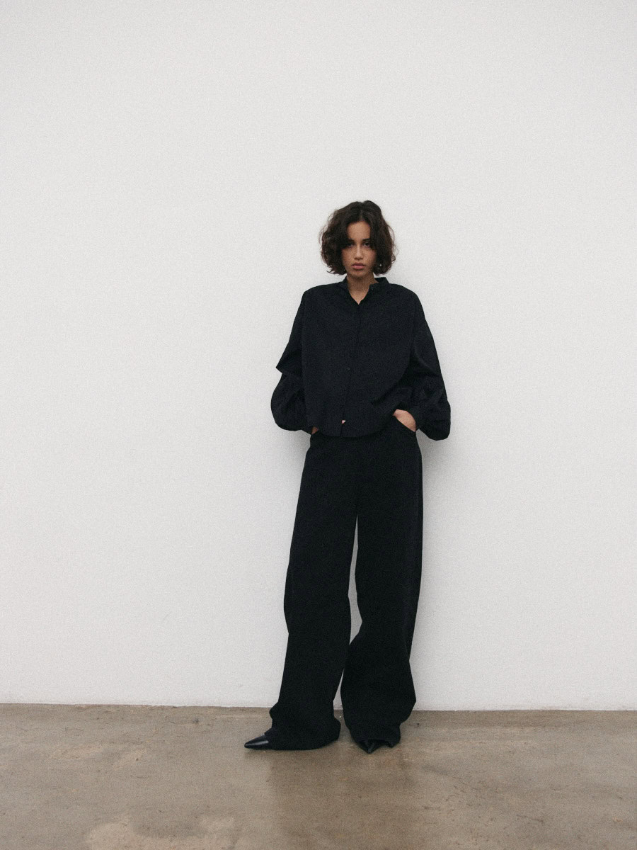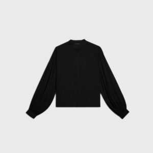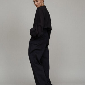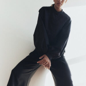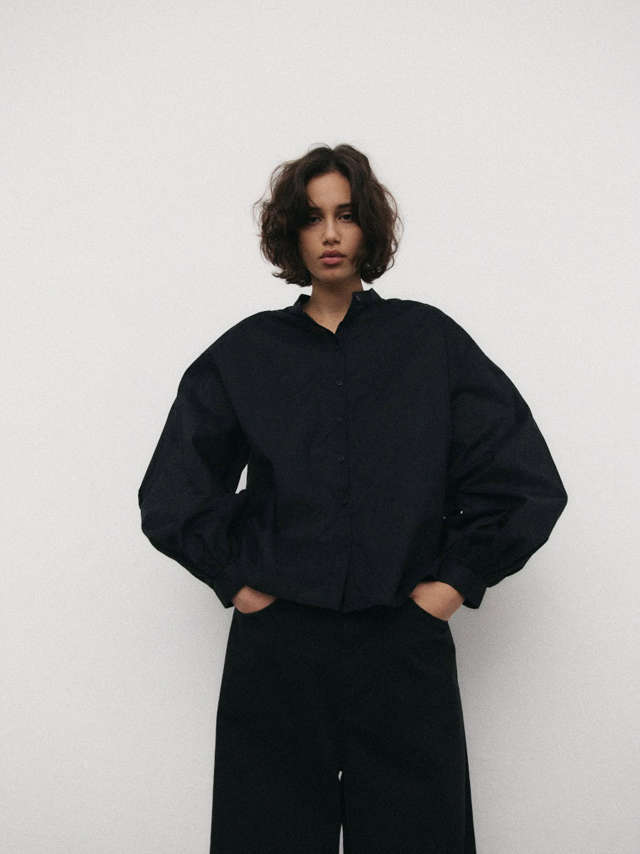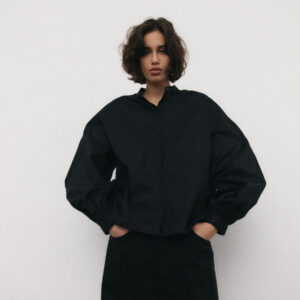 Koszula o luźnym, ultra oversize’owym kroju z bufiastymi rękawami. Klasyczna, nieco wydłużona. Prosta i minimalna stójka oraz szerokie mankiety dopełniają całości. Model zapinany na guziki. Świetnie wygląda z jeansami w każdym odcieniu jak i garniturowymi spodniami.