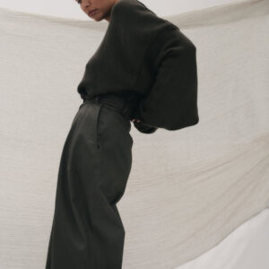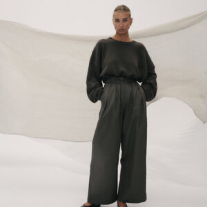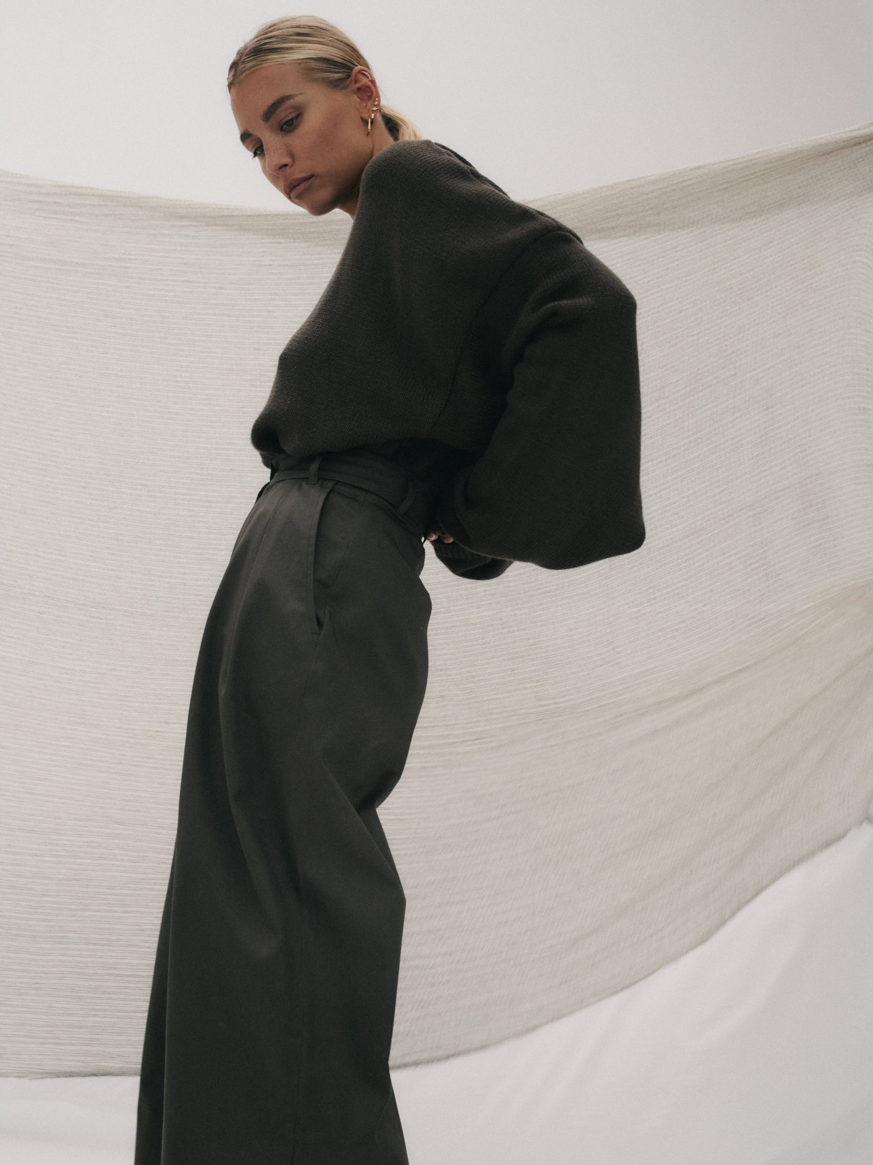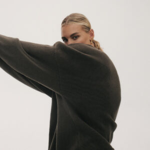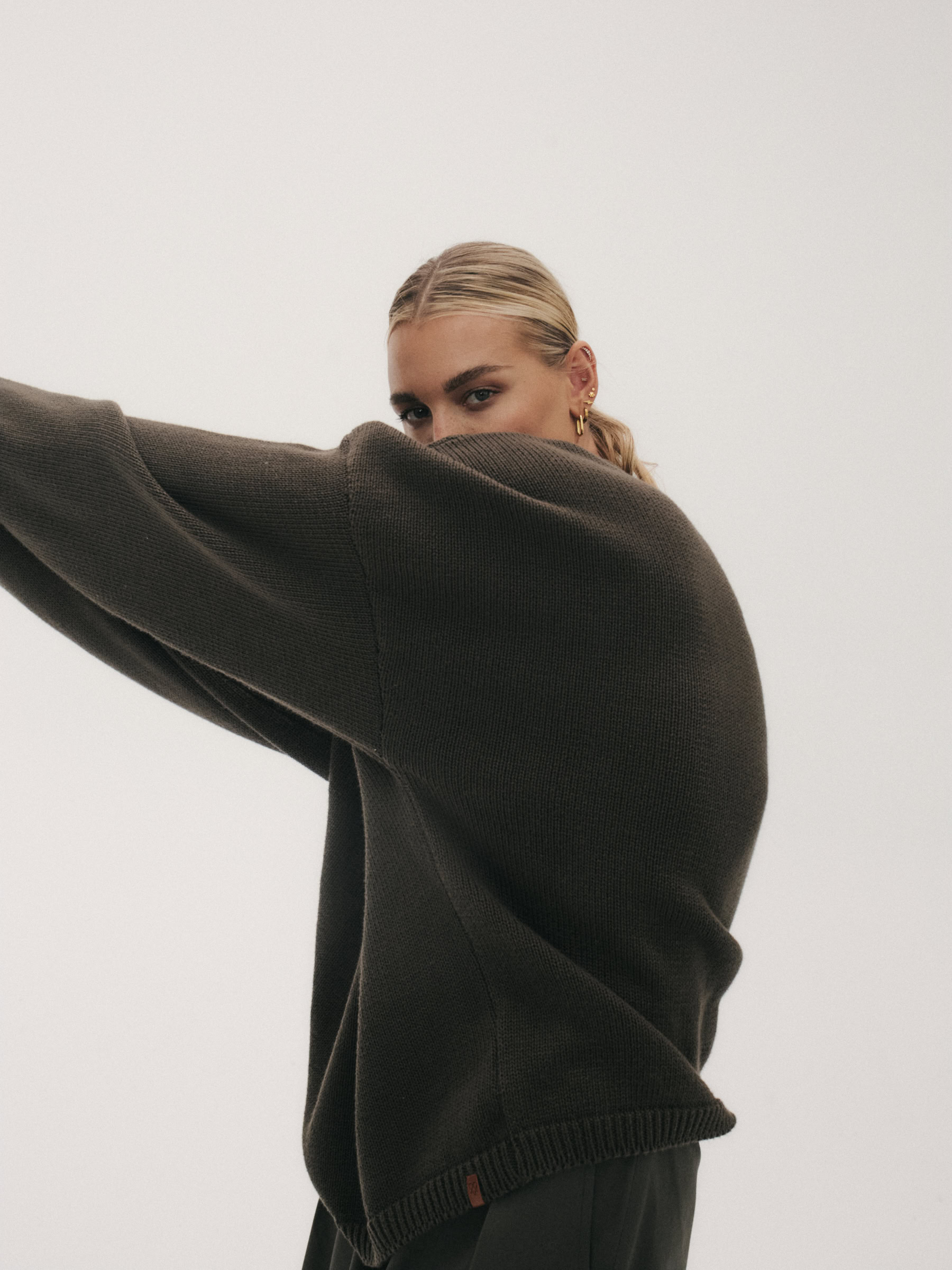 Oversize’owy sweter, z zadziornie przydługimi rękawami,wyraźnie obniżoną linią ramion i klasycznym, minimalistycznym splocie. Świetnie wygląda zarówno jako wierzchnia warstwa na sukienki, jak i z jeansami czy dresami.