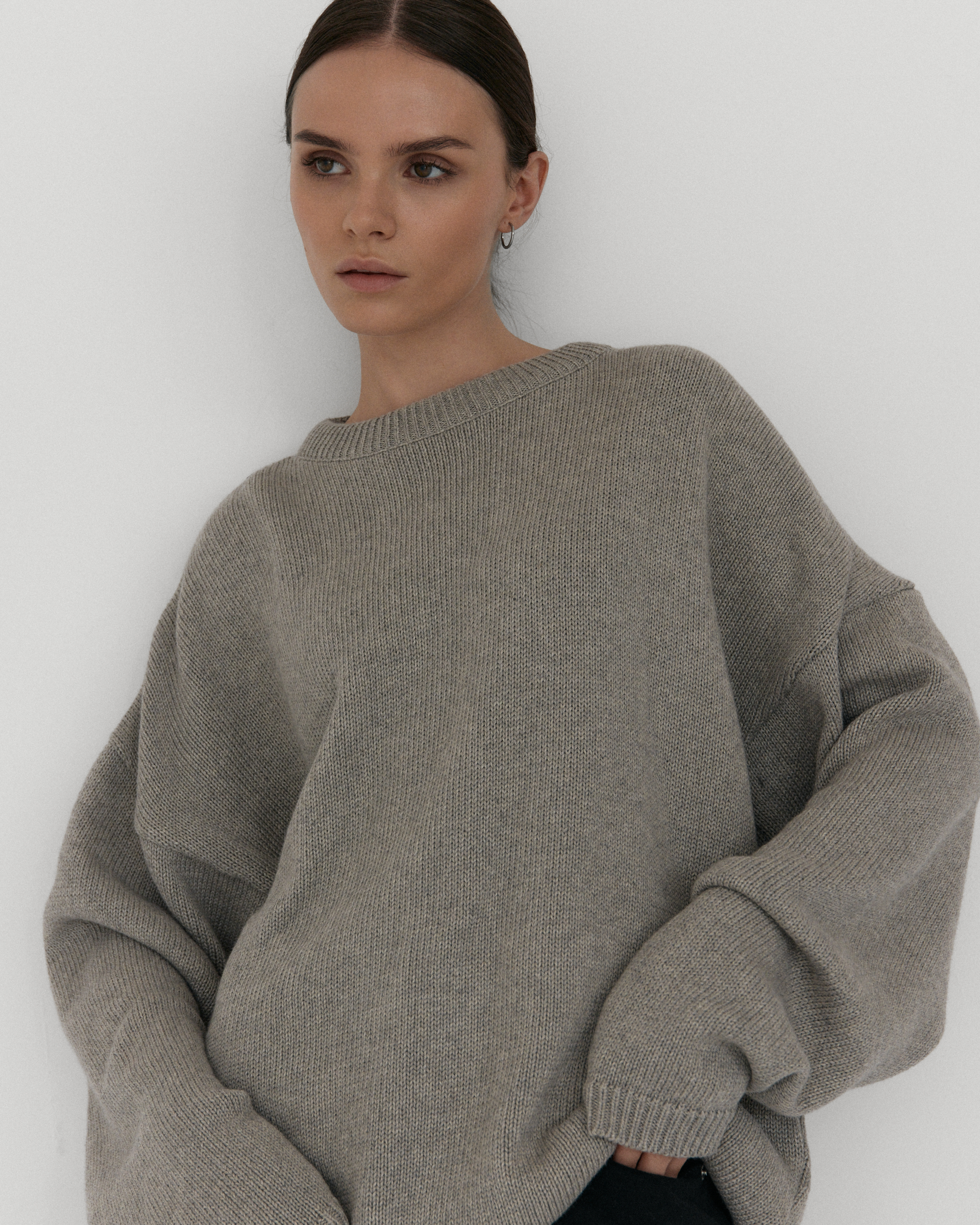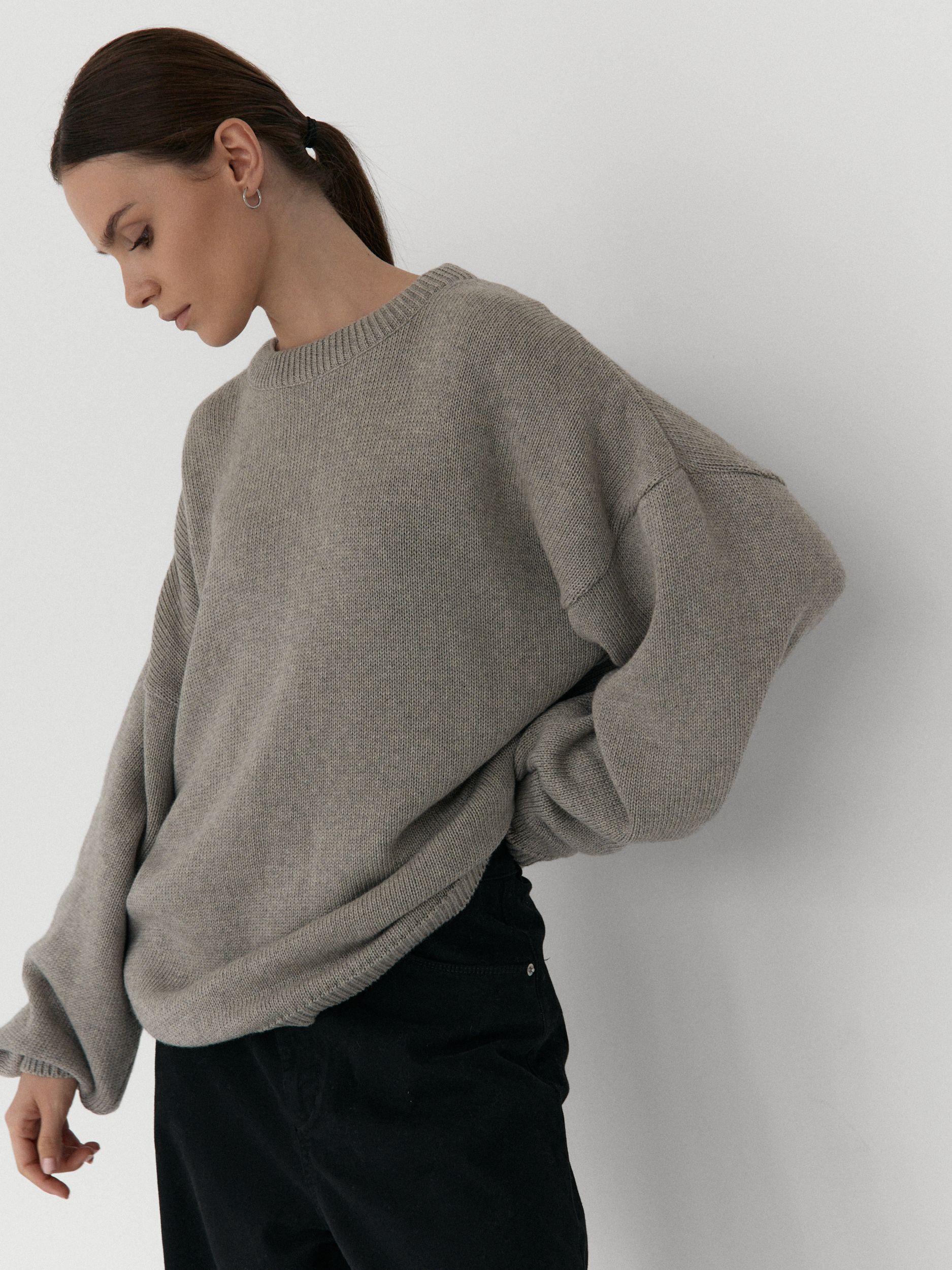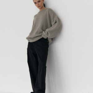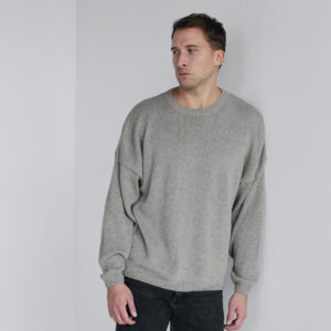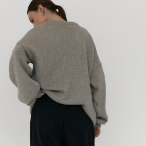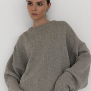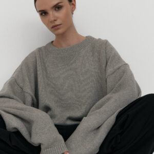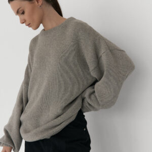 Oversize’owy sweter, z zadziornie przydługimi rękawami,wyraźnie obniżoną linią ramion i klasycznym, minimalistycznym splocie. Świetnie wygląda zarówno jako wierzchnia warstwa na sukienki, jak i z jeansami czy dresami.