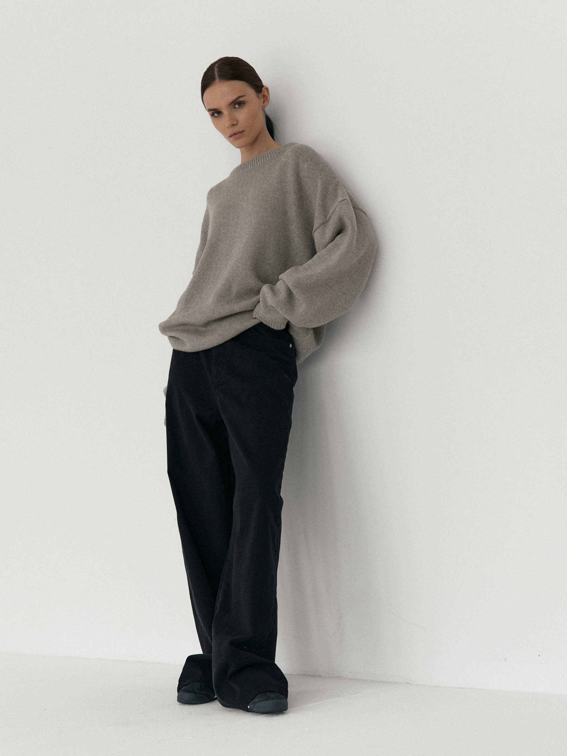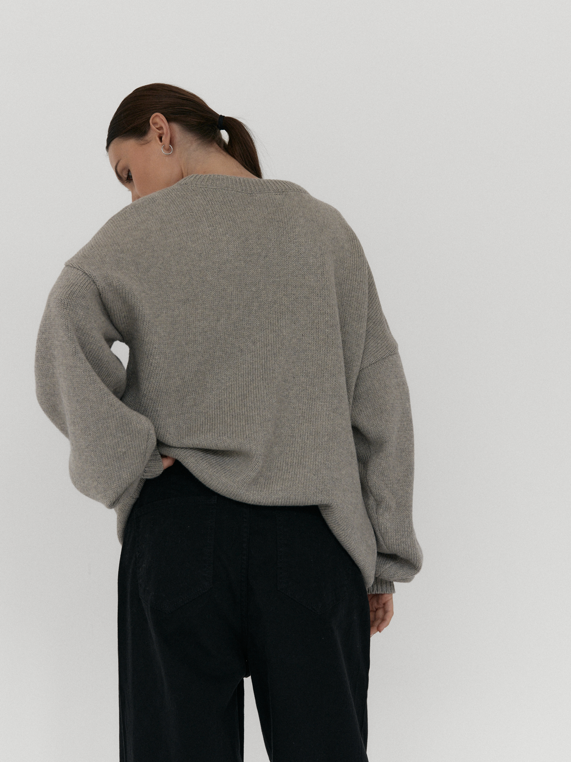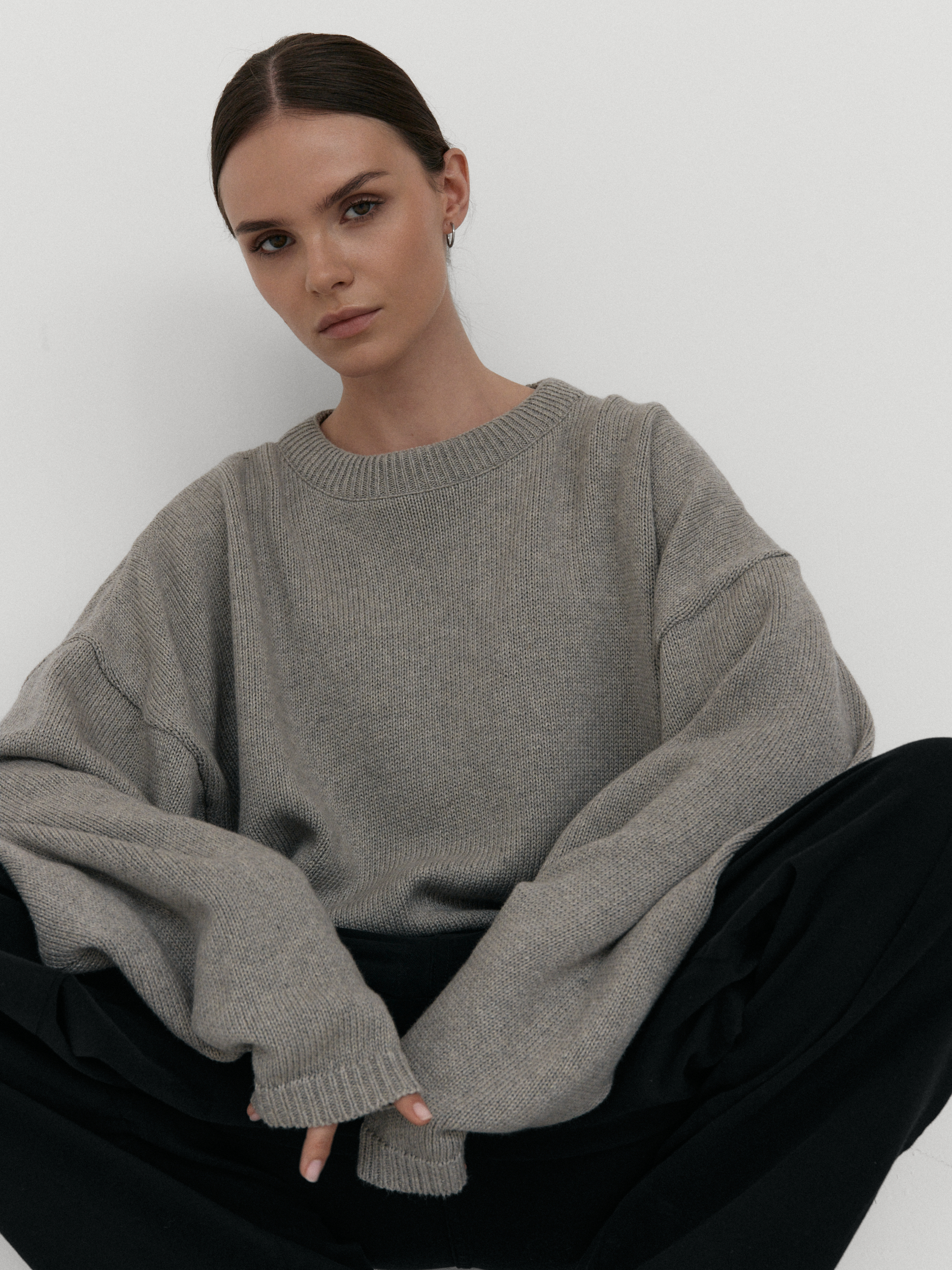 Oversize’owy sweter, z zadziornie przydługimi rękawami,wyraźnie obniżoną linią ramion i klasycznym, minimalistycznym splocie. Świetnie wygląda zarówno jako wierzchnia warstwa na sukienki, jak i z jeansami czy dresami.
