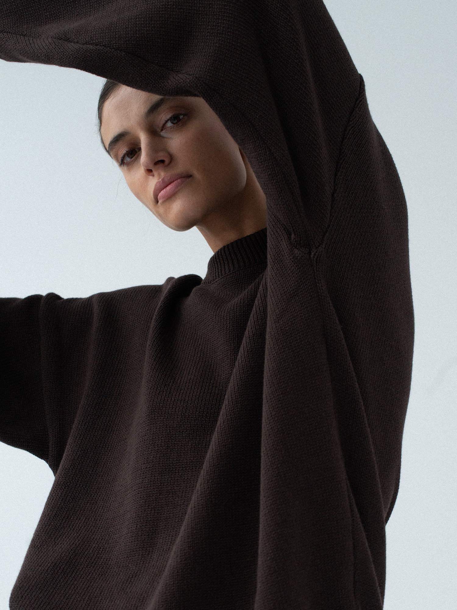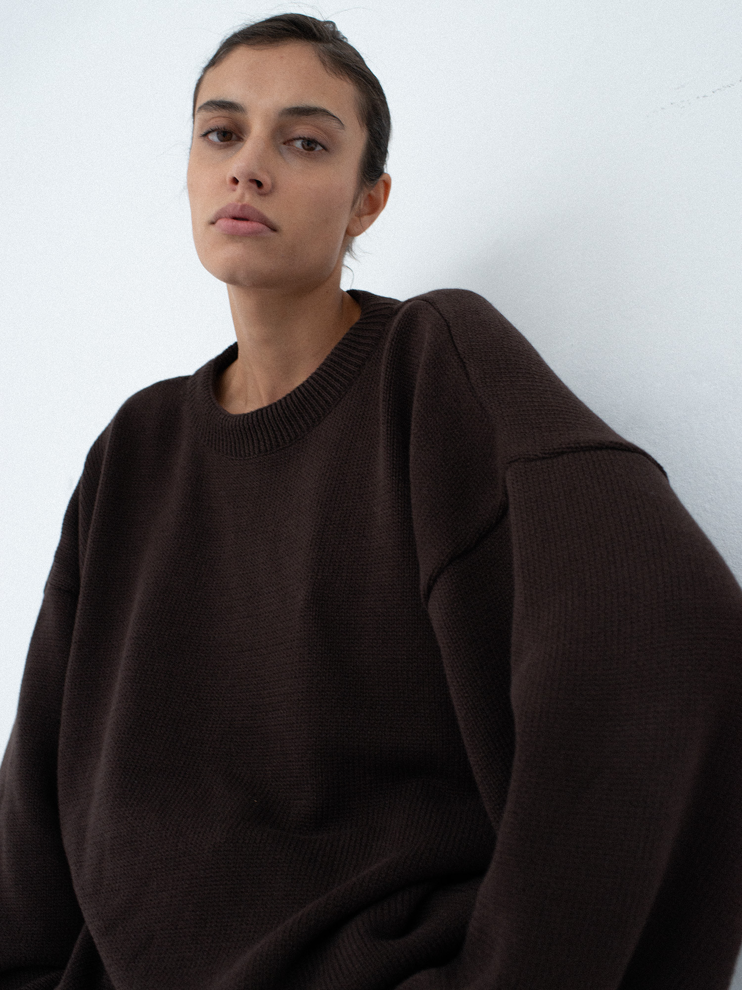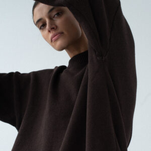 Oversize’owy sweter z charakterystycznie wydłużonymi rękawami, wyraźnie obniżoną linią ramion i klasycznym, minimalistycznym splotem. Swobodna forma nadaje mu nowoczesny charakter. Dobrze wygląda zarówno jako warstwa wierzchnia na sukienkę, jak i w zestawieniu z jeansami czy dresami.
