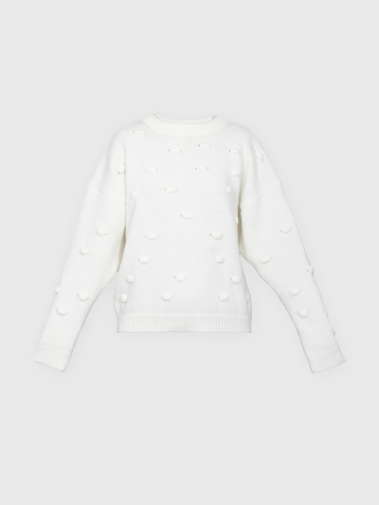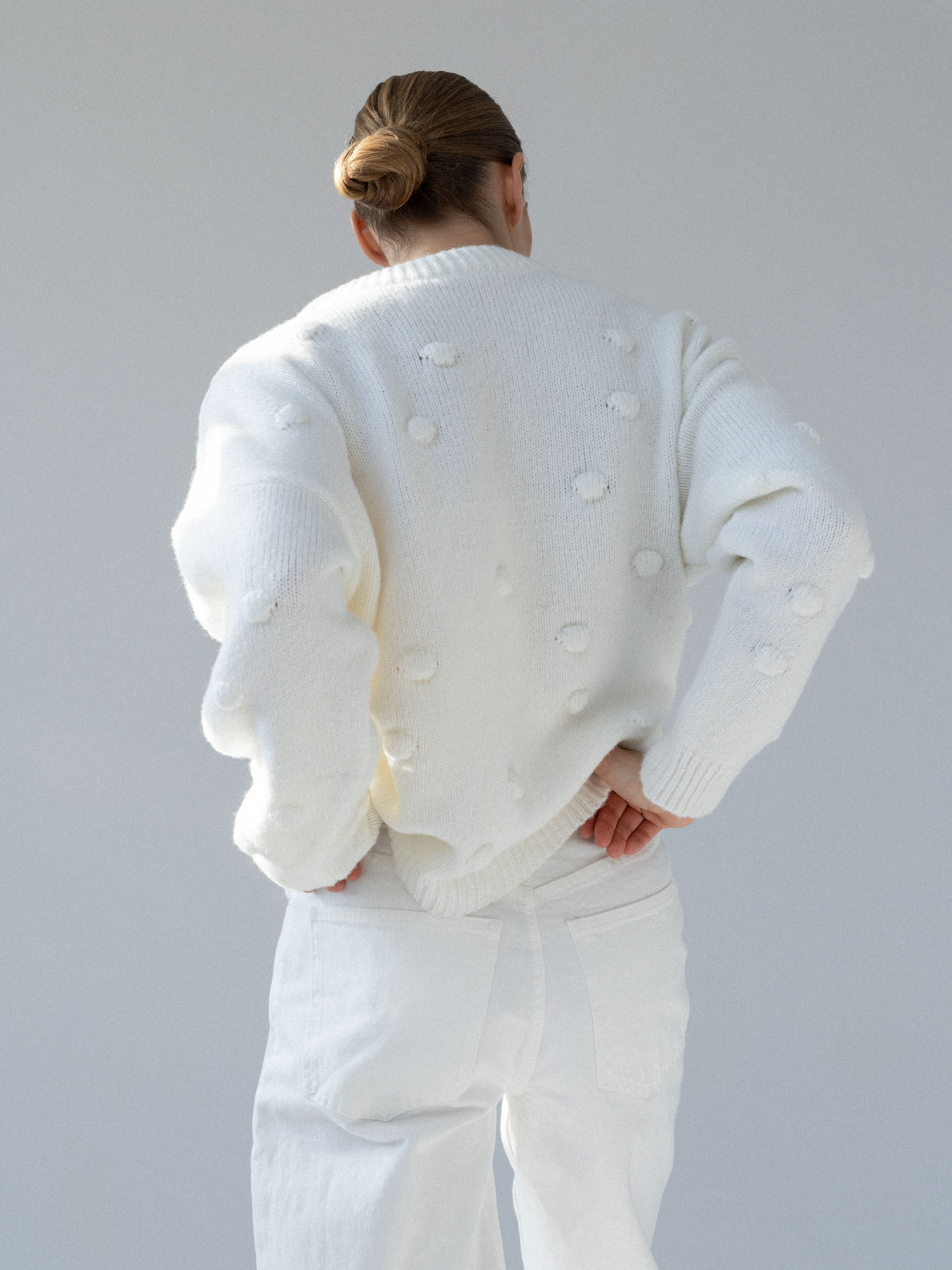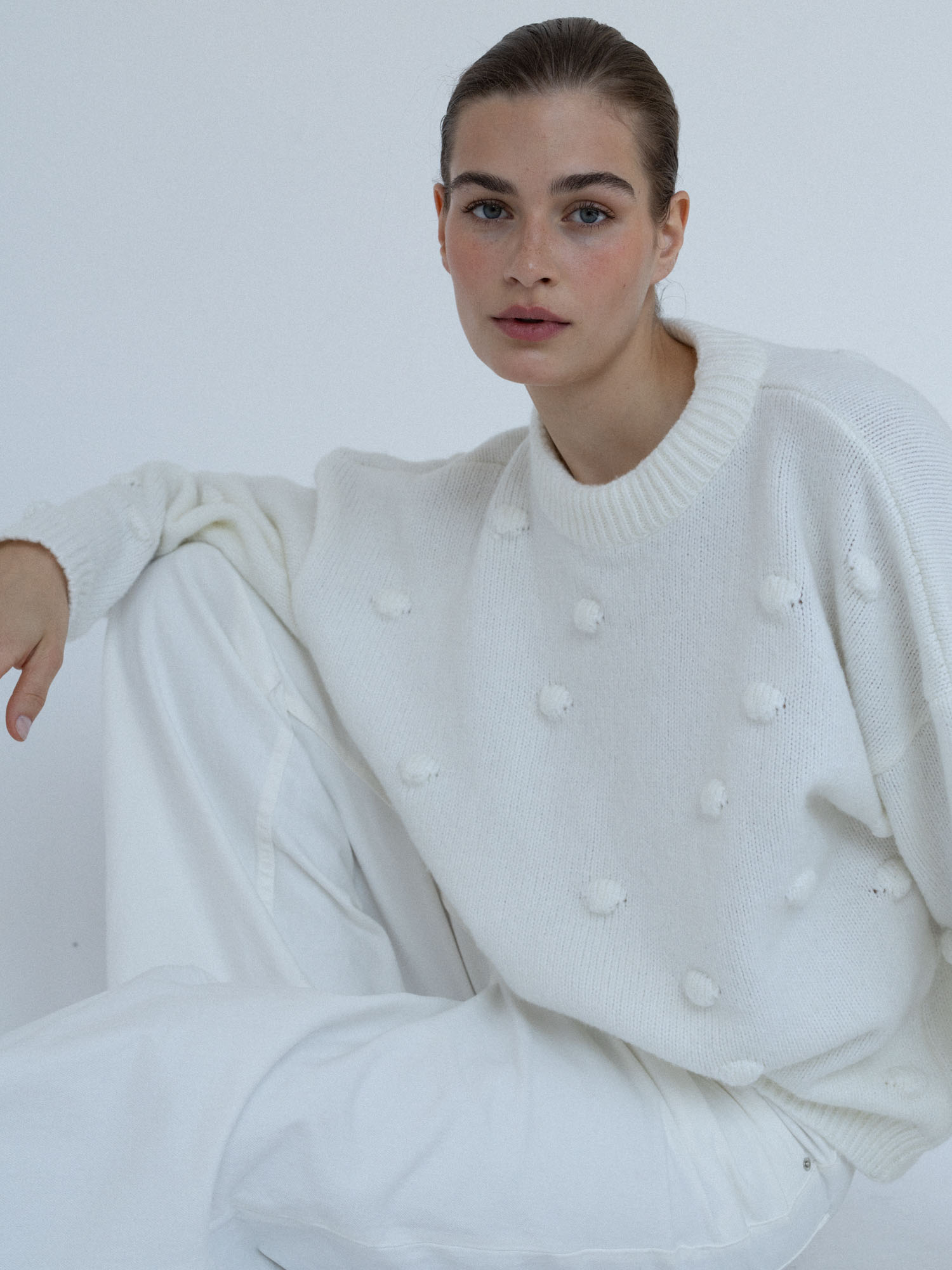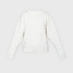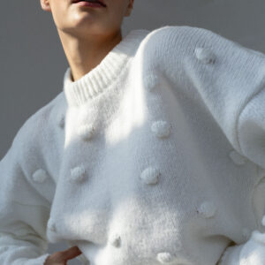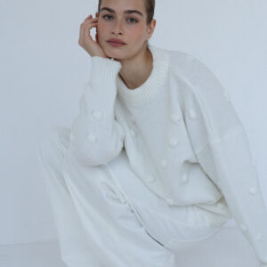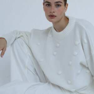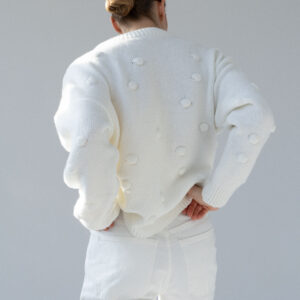 Minimalistyczny sweter o lekko oversize’owym kroju z ozdobnymi wypustkami przypominającymi duże kropki. Ponadczasowa forma i dopracowane detale sprawiają, że doskonale odnajduje się zarówno w eleganckich, jak i codziennych stylizacjach. Subtelne ściągacze przy mankietach, dekolcie i u dołu nadają całości spójne, estetyczne wykończenie.