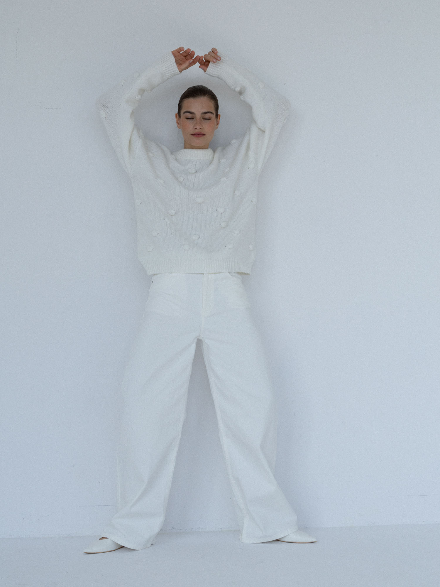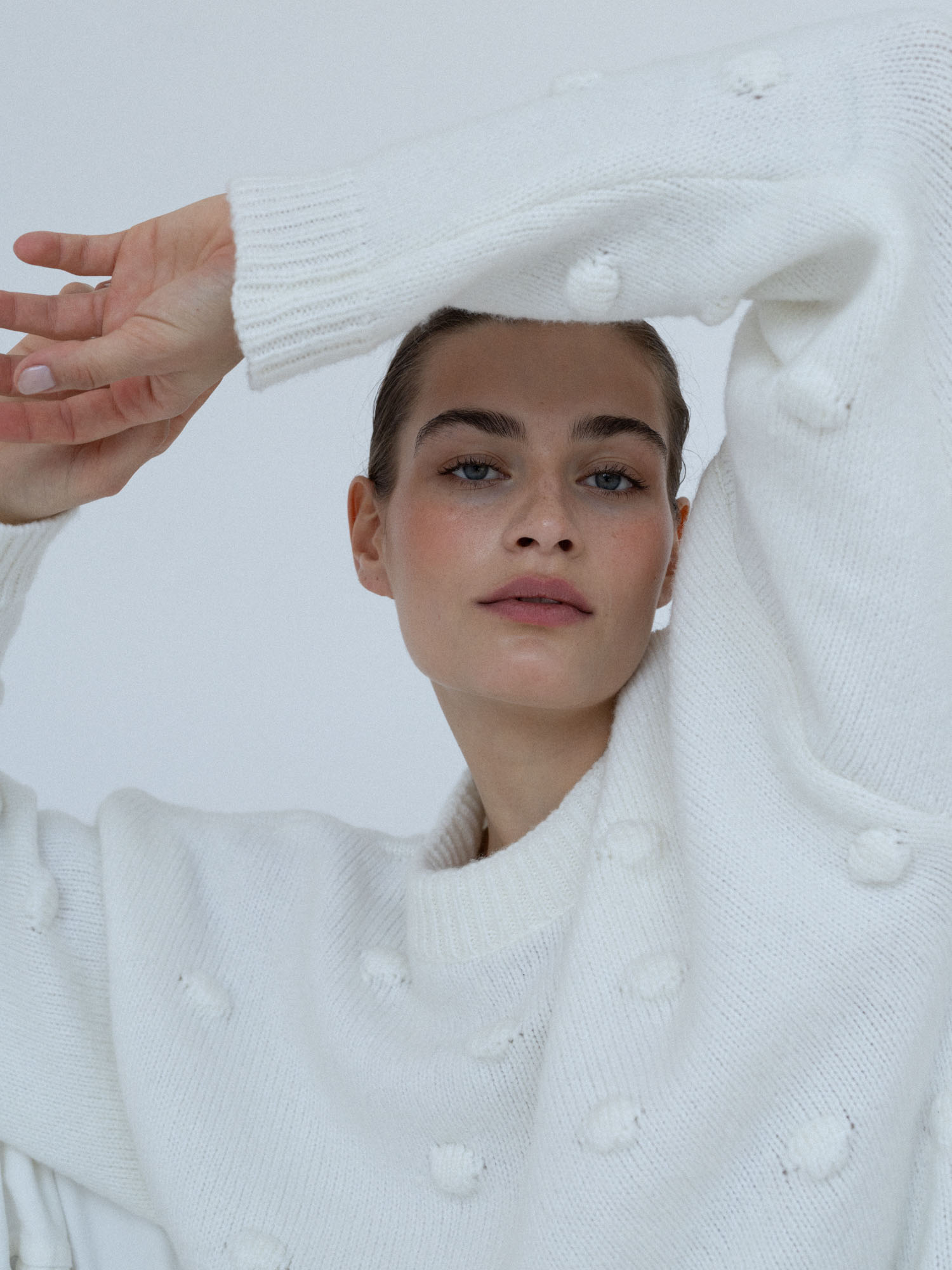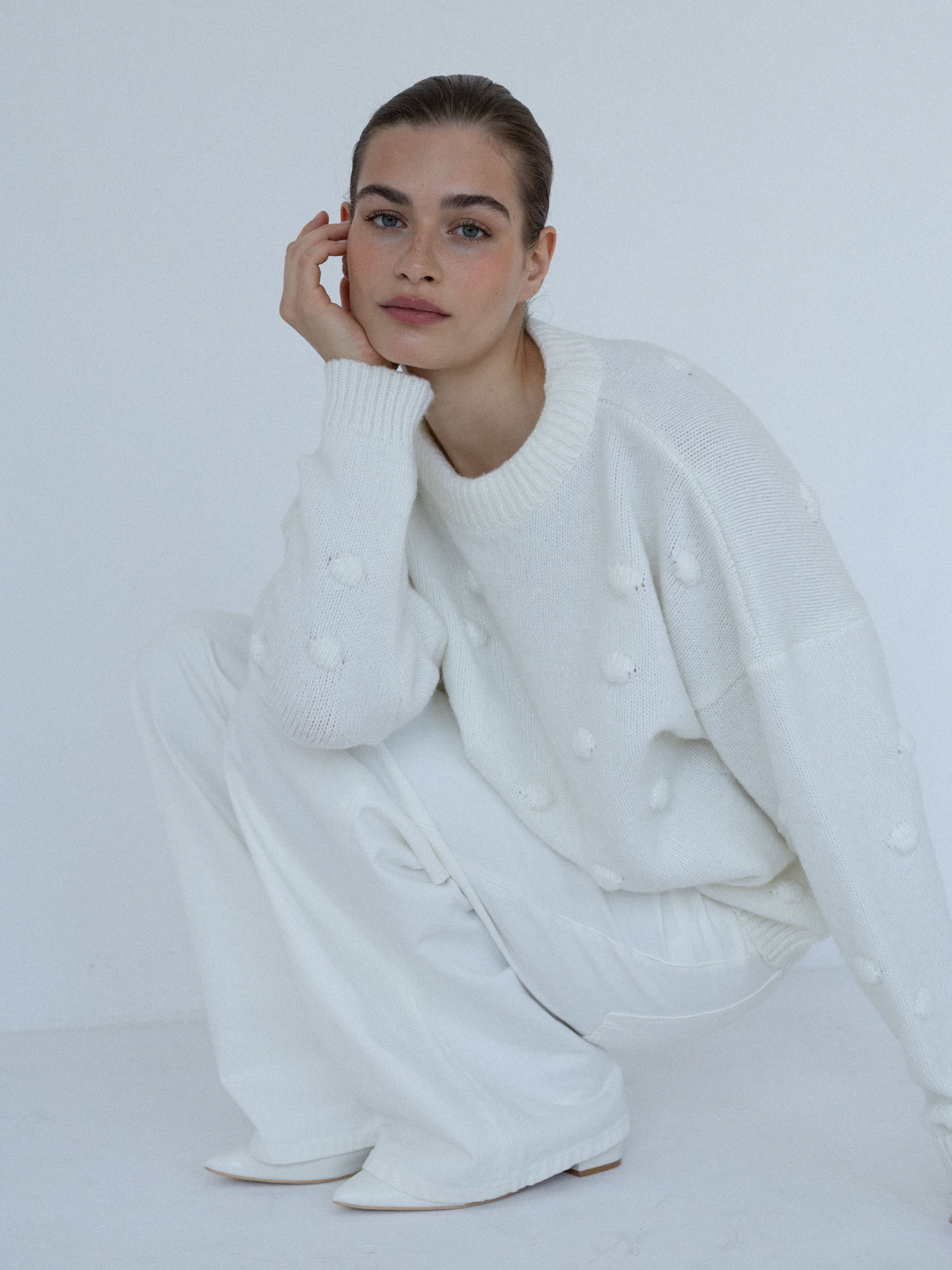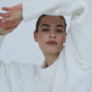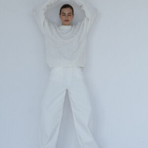 Minimalistyczny sweter o lekko oversize’owym kroju z ozdobnymi wypustkami przypominającymi duże kropki. Ponadczasowa forma i dopracowane detale sprawiają, że doskonale odnajduje się zarówno w eleganckich, jak i codziennych stylizacjach. Subtelne ściągacze przy mankietach, dekolcie i u dołu nadają całości spójne, estetyczne wykończenie.