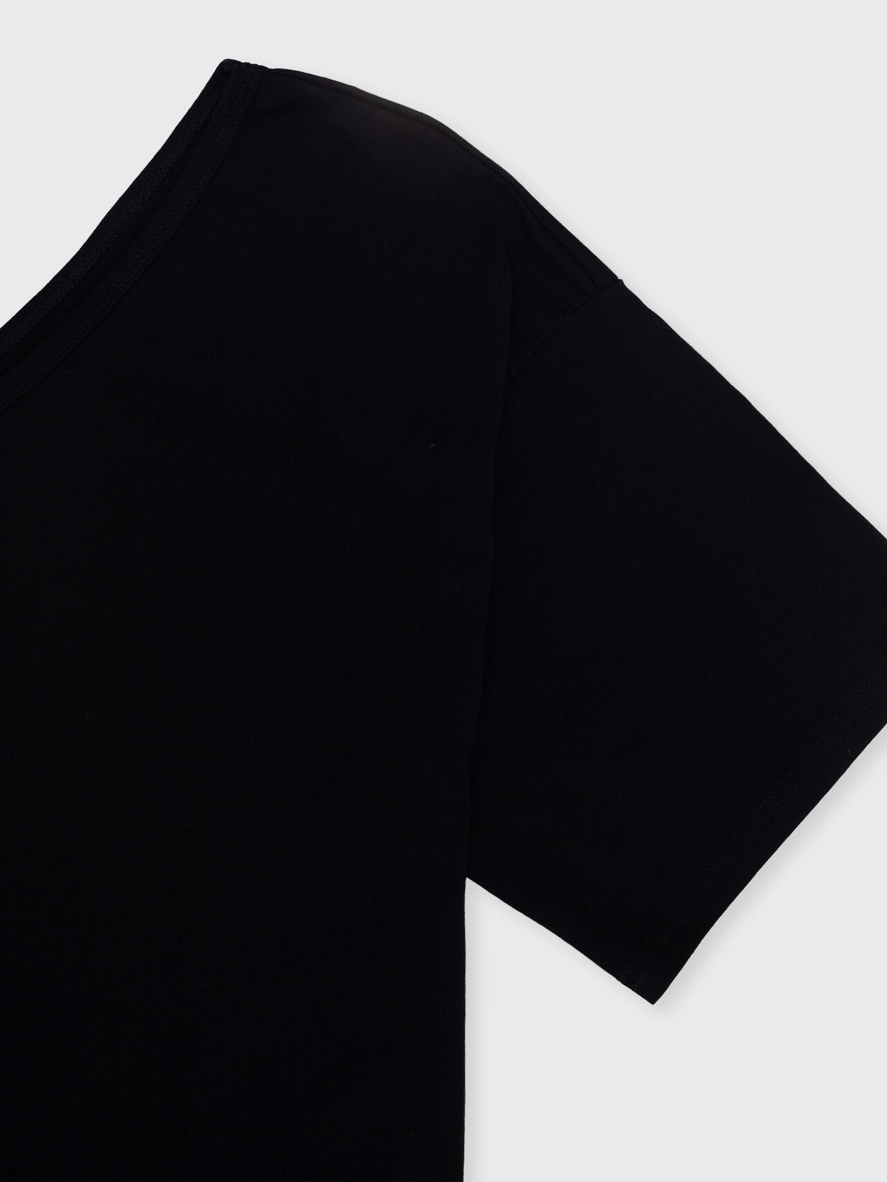 - Asymetryczny t-shirt z zaczepnie przydługim rękawem i obniżoną linią ramion. Oversize’ovy, prosty krój. Wygodny, minimalistyczny, zadziornie odsłania prawe ramię. Idealnie sprawdzi się zarówno na co dzień, do pracy jak i na wieczór. Długość t-shirtu jest odpowiednia dla każdego rodzaju spodni, jeansów i leginsów. Najlepiej prezentuje się w monochromatycznych zestawach.