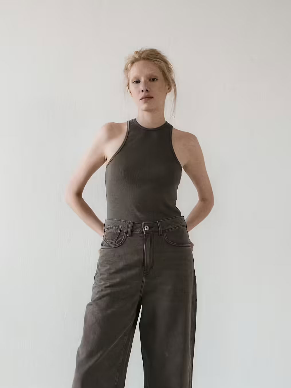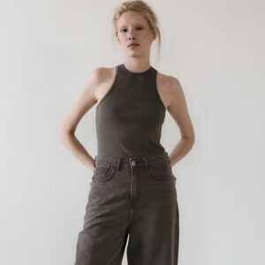 Dopasowana koszulka na ramiączkach typu bokserka. Po bokach zaczepne i mocne wycięcia. Prosty krój idealnie dopasowuje się do sylwetki i delikatnie podkreśla linię ramion. Zabudowany dekolt dopełnia całości. Można ją zestawić zarówno z jeansami jak i z dresami. Świetnie sprawdzi się jako baza pod marynarkę czy kardigan.