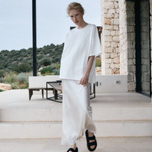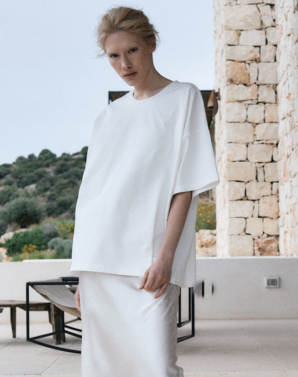 Klasyczny t-shirt o kroju oversize, z delikatnie wydłużonymi rękawami. Wygodny, pudełkowy krój idealnie sprawdzi się zarówno na co dzień, do pracy, jak i na wieczór. Świetnie wygląda w połączeniu z szortami z wysokim stanem, eleganckimi cygaretkami i każdą opcją jeansów. Będzie stanowił doskonały zestaw z kompletem dresowym 1990.