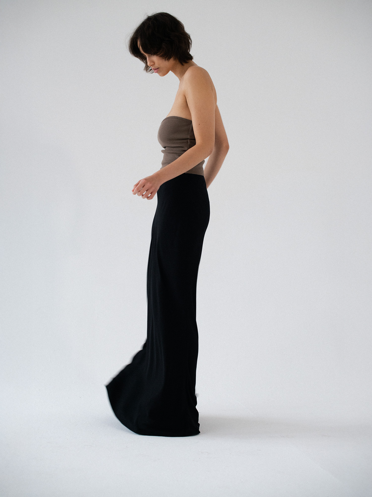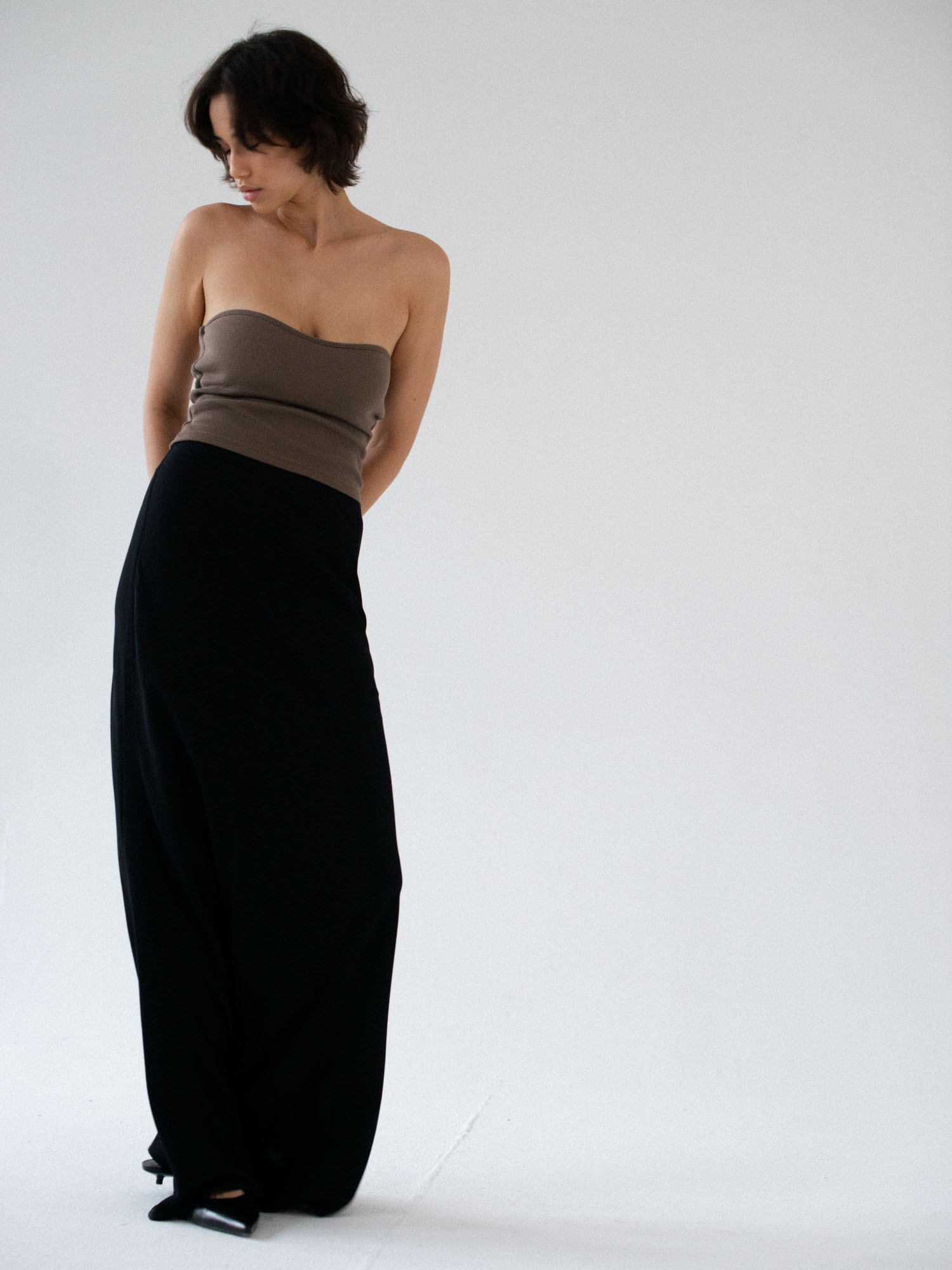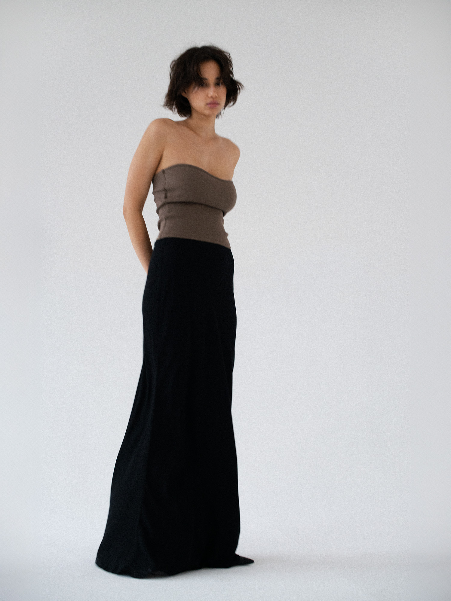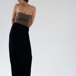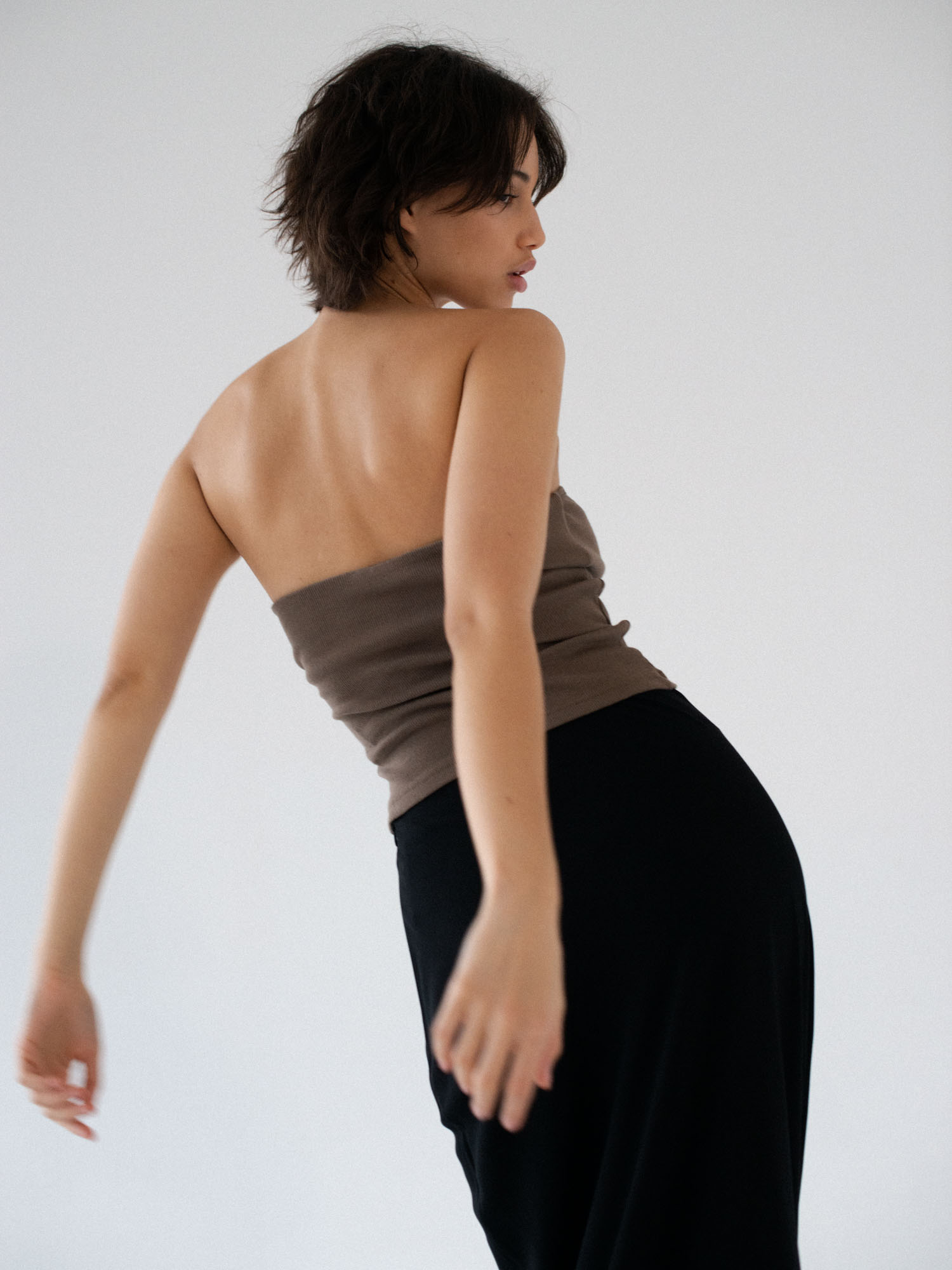 Minimalistyczny top bandeau. Uszyty z bawełnianego dżerseju w prążki idealnie dostosowuje się do sylwetki. Top ma ukrytą podszewkę na biuście oraz elastyczny brzeg wokół góry jak i pod biustem co zapobiega jego opadaniu oraz zapewnia komfort noszenia. Świetnie sprawdzi się zarówno z casualowymi jeansami, jak i z elegancką spódnicą.