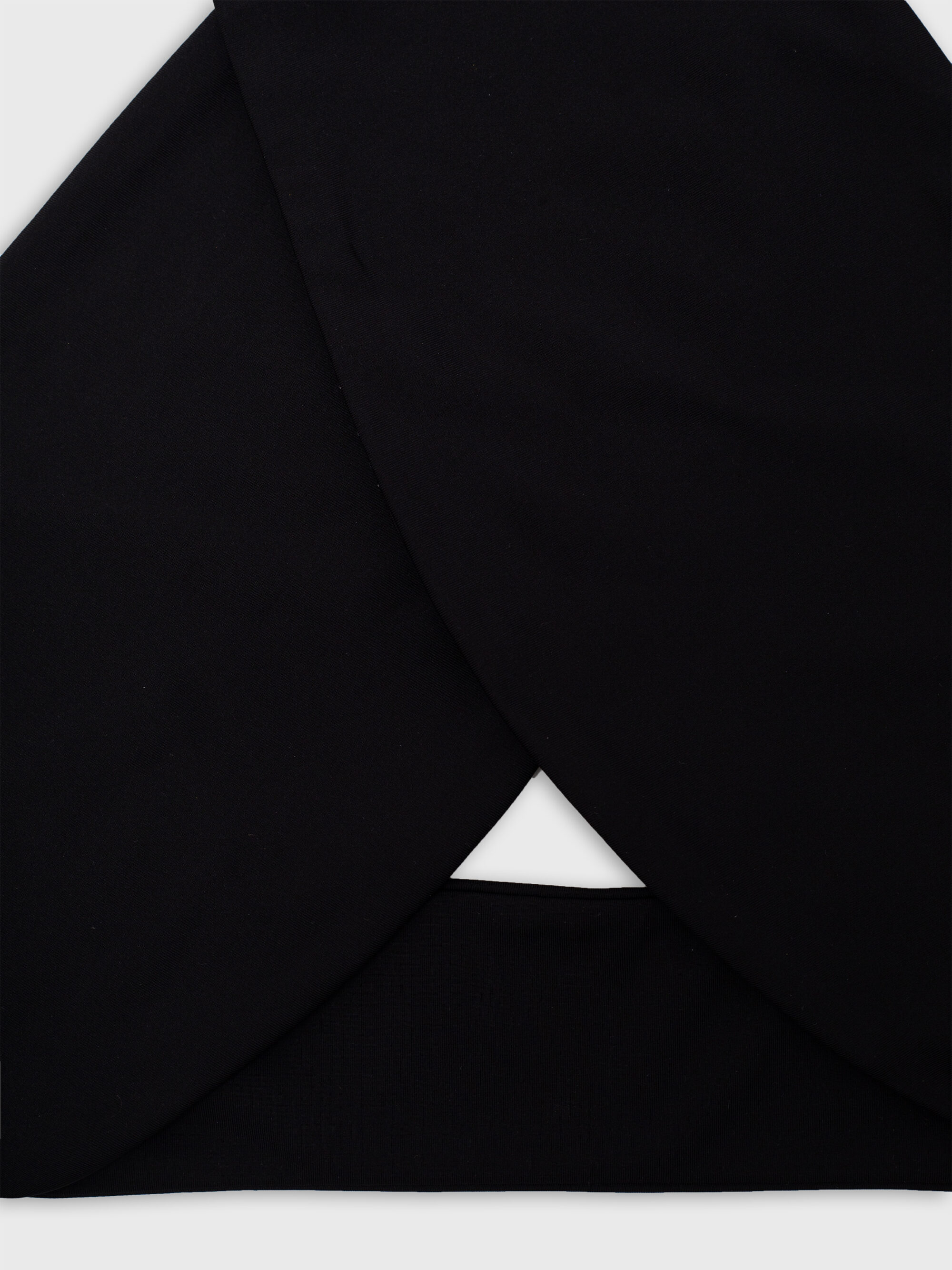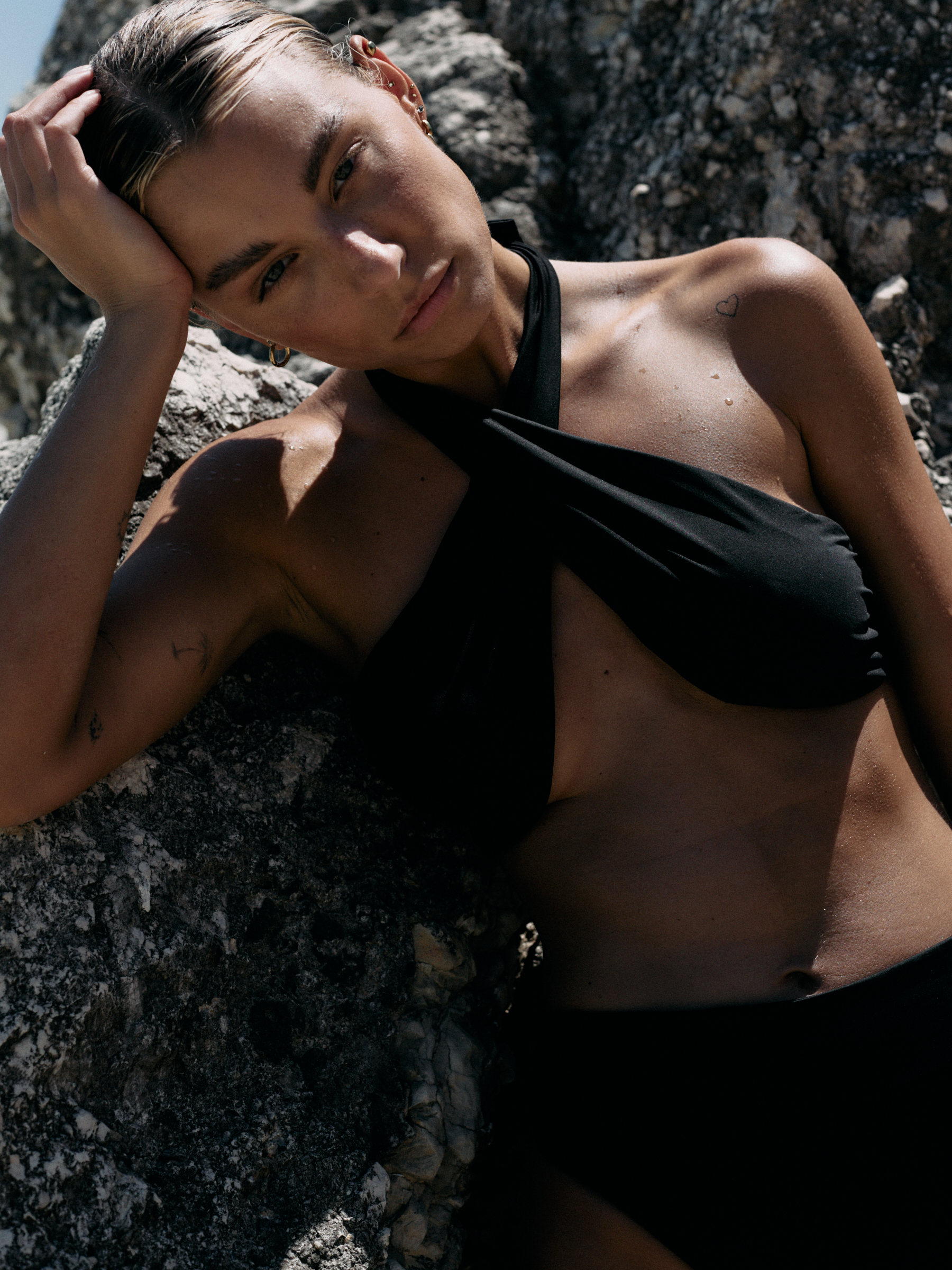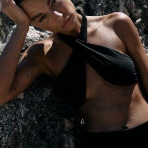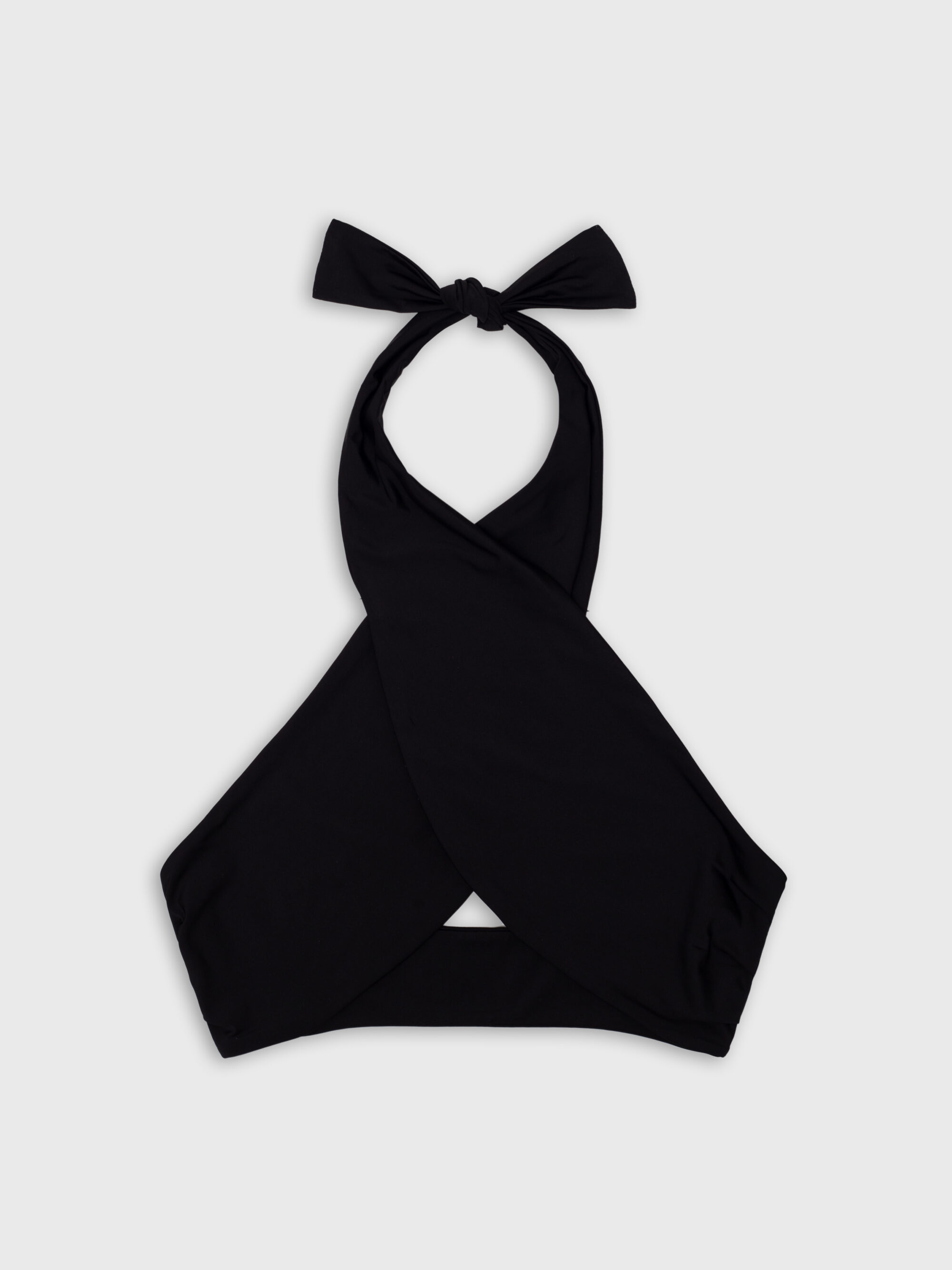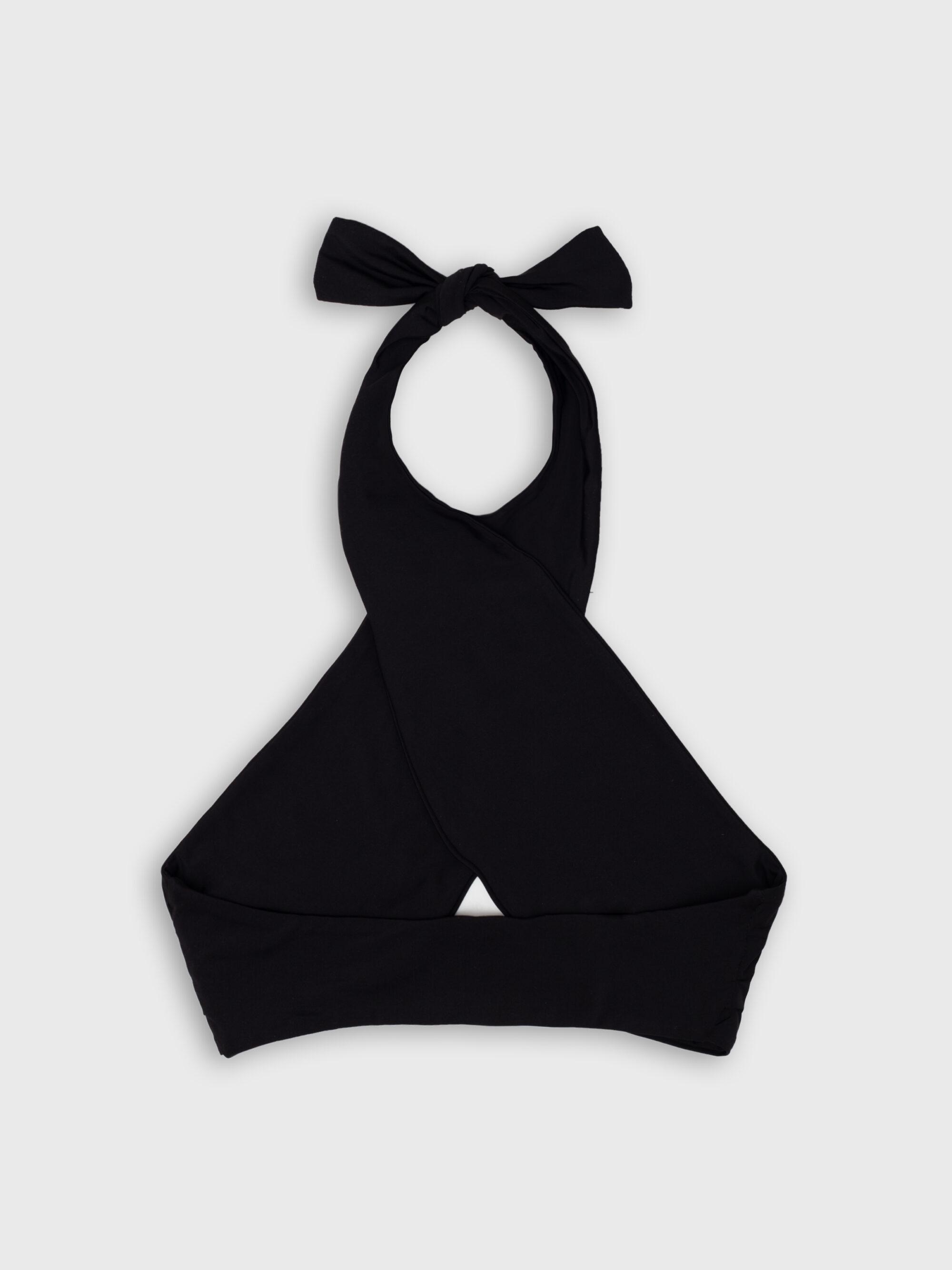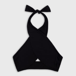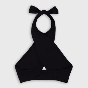 Biustonosz kąpielowy typu bandeau z ozdobnym wiązaniem na szyi. Odsłonięty tył podkreśla linię pleców. Biustonosz doskonale podtrzymuje piersi i zapewnia im ładny kształt. Głębokie wycięcie z przodu dopełnia całości. Model dodatkowo wzmocniony delikatnymi gumkami wszytymi w boki, które zapewniają komfort pływania, jednocześnie nie wcinając się w ciało.