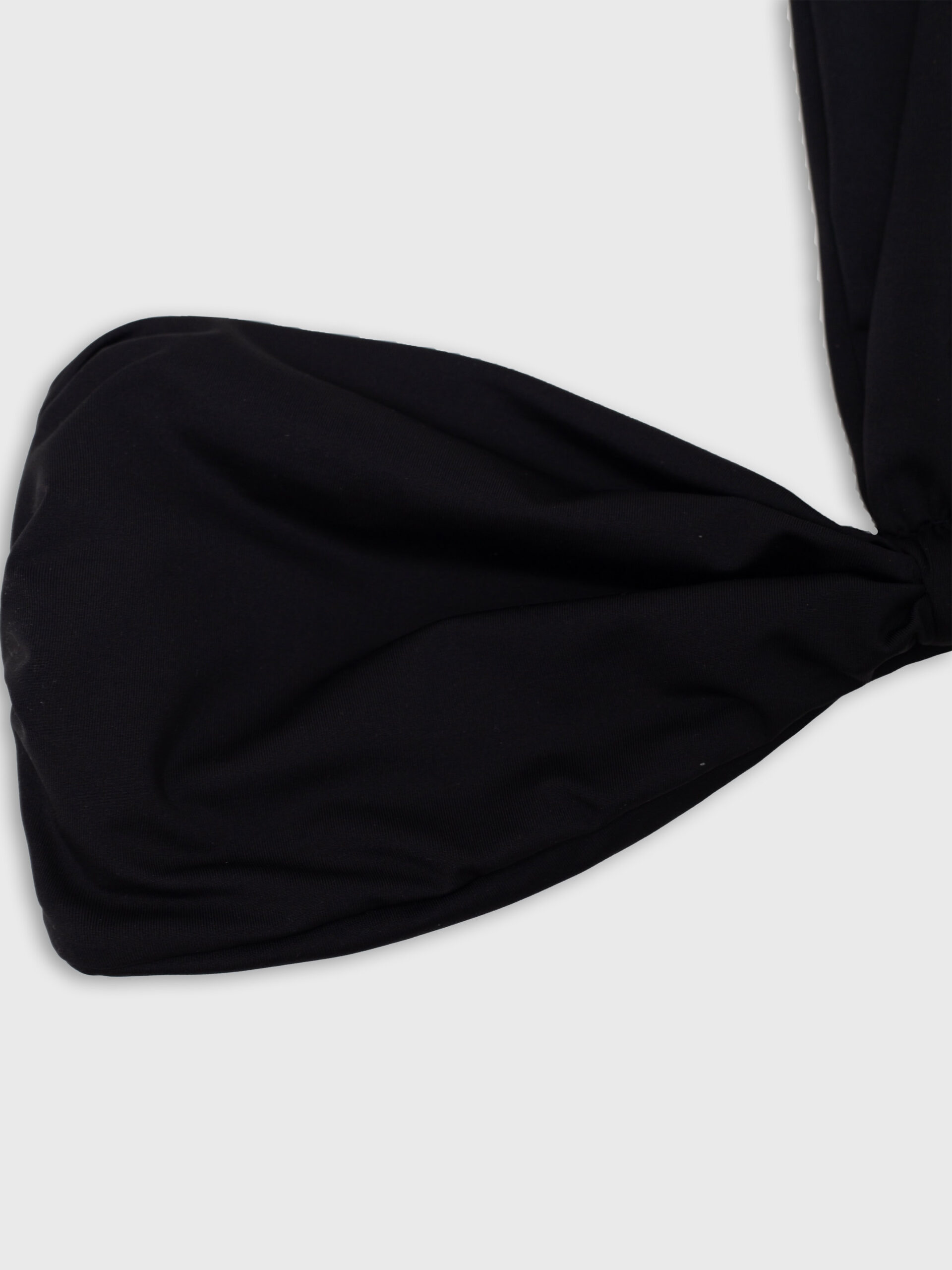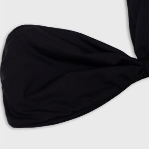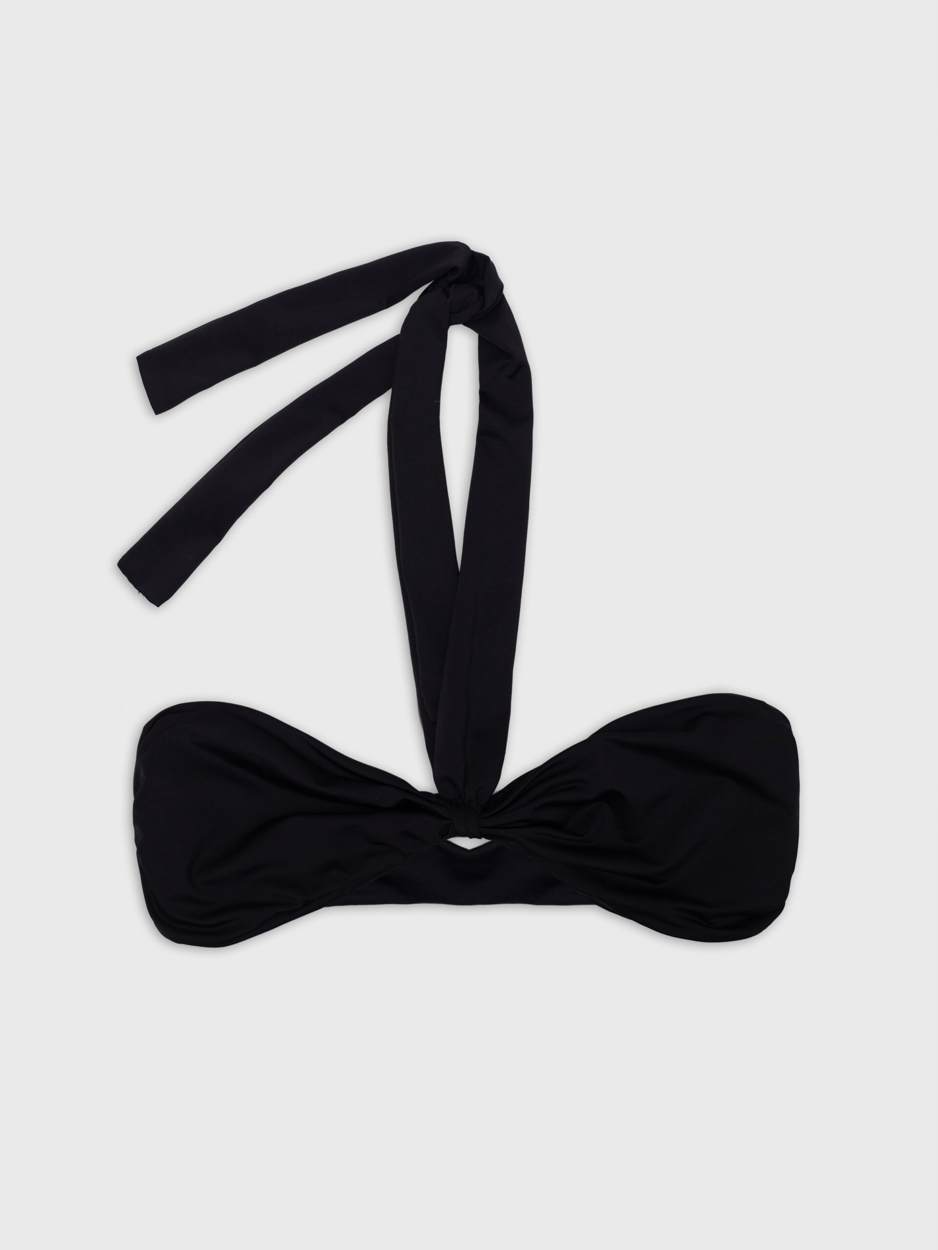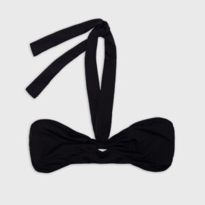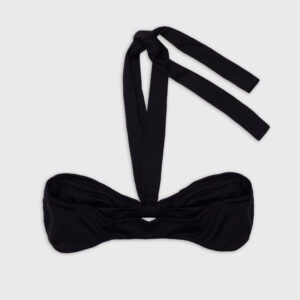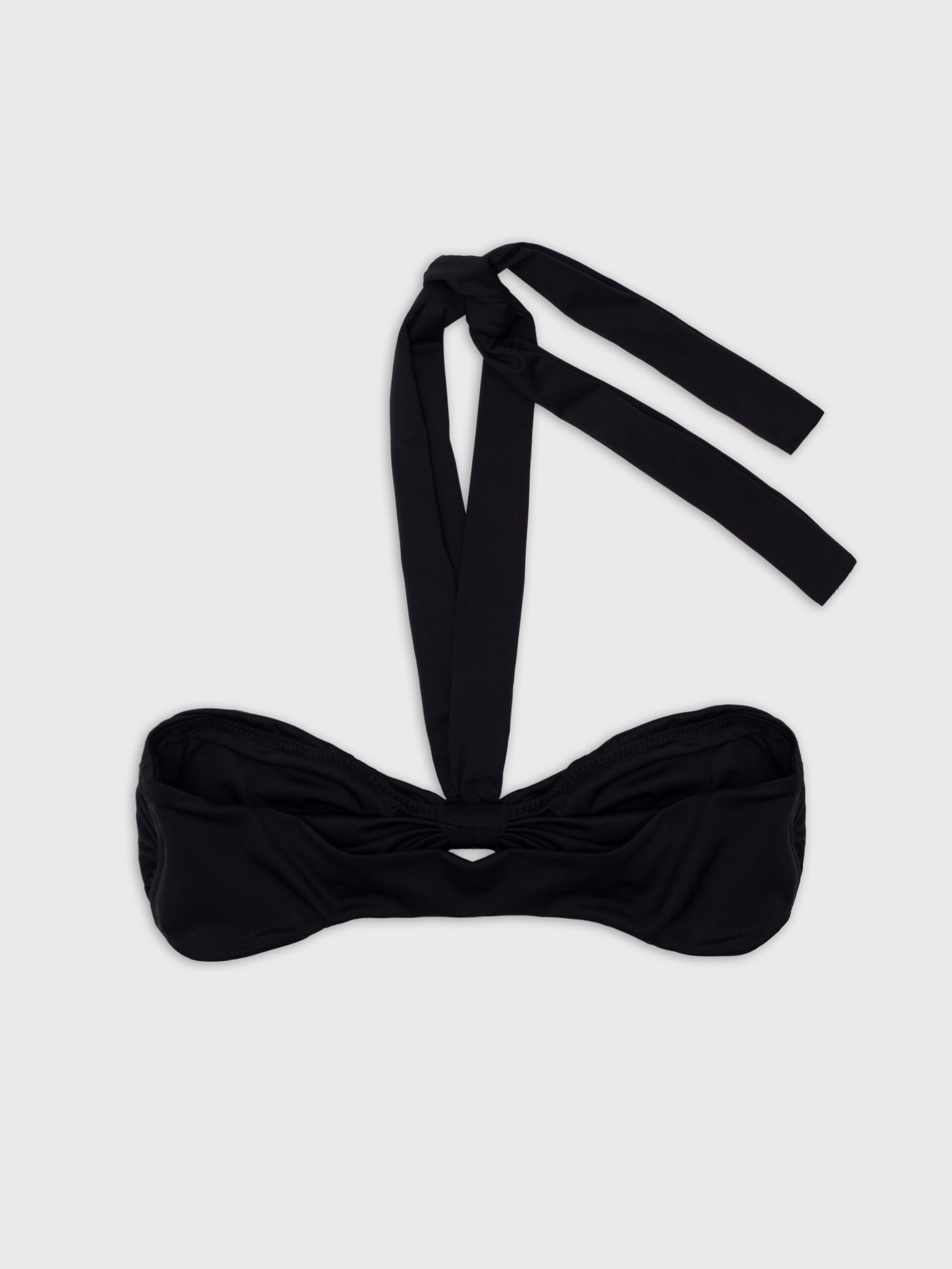 Biustonosz kąpielowy typu halter z wiązaniem na szyi. Odsłonięty tył doskonale podkreśla linię pleców. Biustonosz podtrzymuje piersi i zapewnia im ładny, okrągły kształt. Innowacyjna forma jest przełamaniem klasycznego kroju. Delikatne marszczenia dopełniają całości.