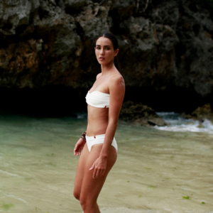 Biustonosz kąpielowy typu bandeau z kolekcji GRLS GO PLACES. Dzięki bocznym fiszbinom i optymalnemu poziomowi zabudowania biustonosz dobrze podtrzymuje piersi i modeluje je w taki sposób, by miały ładny, okrągły kształt. Idealne przyleganie do ciała zapewniają specjalistyczne gumki, którymi wykończona jest opaska, i to właśnie dzięki nim model nie zsuwa się z biustu. Myślą przewodnią przy projektowaniu tego wsuwanego przez głowę modelu było stworzenie stroju kąpielowego, który wreszcie można kupić i czuć się w nim rewelacyjnie, a nie tylko oglądać na zdjęciach w Internecie. Biustonosz pochodzi z serii mix and match, co oznacza, że świetnie współgra z każdym dołem z tym samym oznaczeniem. Co więcej, pasuje również do zeszłych kolekcji: LUST FOR THE SUN, TUMBLR GRLS oraz VARIETY. Proponujemy połączyć biustonosz TUCK BANDEAU z figami RETRO BIKINI lub figami CLASSIC BIKINI.