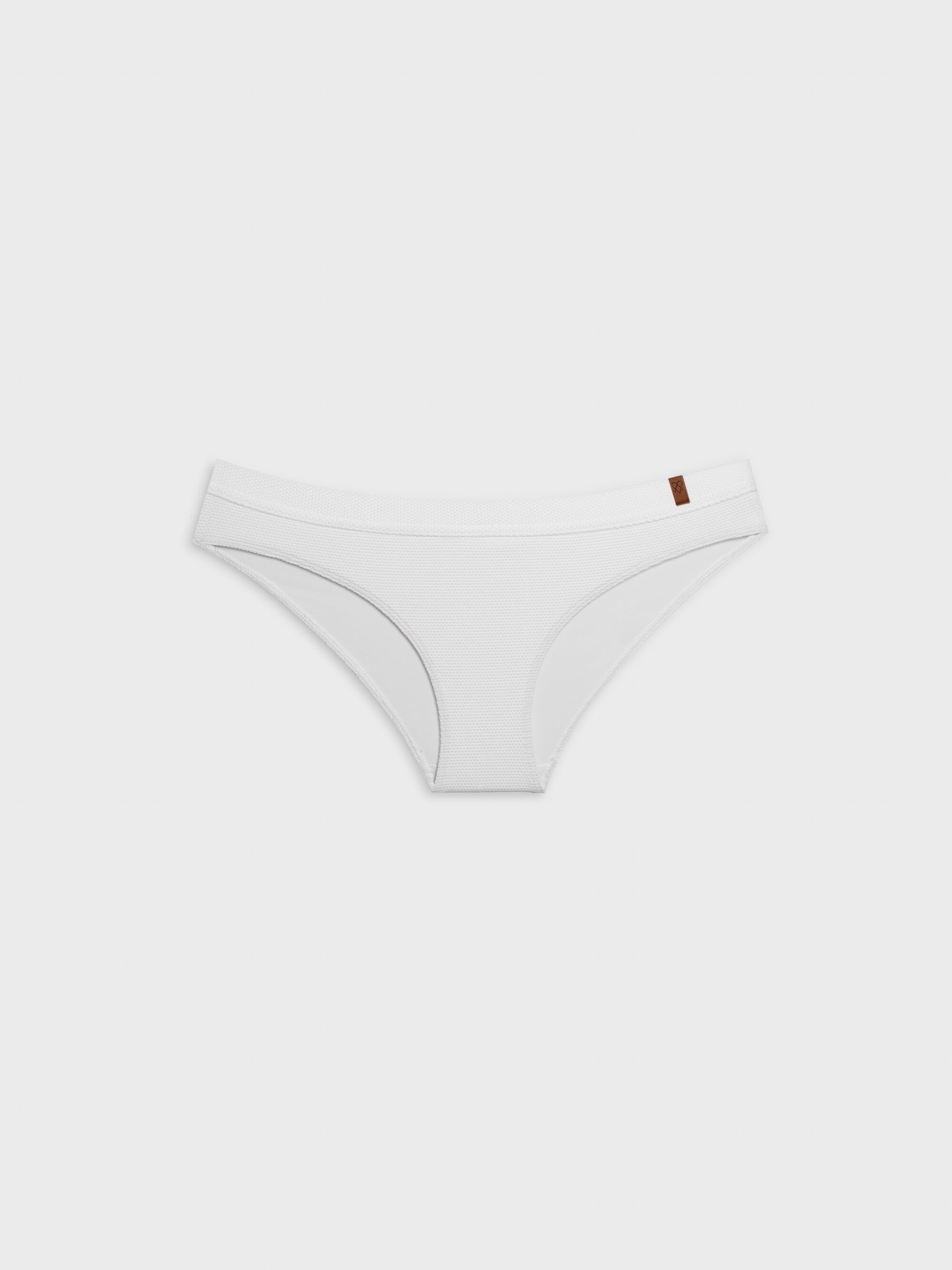 Figi kąpielowe o klasycznym kroju, z delikatnie obniżonym stanem. Optymalne zabudowanie majtek z tyłu zapewnia komfort noszenia, a dzięki specjalistycznym gumkom wszytym w boki, figi nie zwijają się, ani nie marszczą. Wyjątkowy, żakardowy materiał o unikatowej strukturze z efektem 3D dopełnia całości. Świetnie współgrają z biustonoszem BASIC BRALETTE WAFFLE coconut, ale również z inną górą z serii WAFFLE.