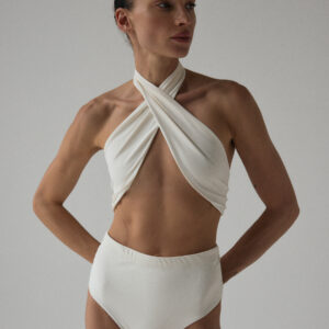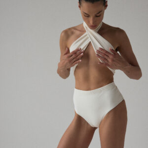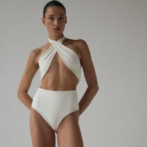 Figi kąpielowe typu high-waist. O klasycznym kroju z mocno podwyższonym stanem, kończące się nad linią pępka. Produkt delikatnie podkreśla wcięcie w talii oraz pupę, przez co pozwala zamaskować drobne niedoskonałości. Optymalne zabudowanie majtek zapewnia komfort noszenia, a dzięki wykończeniu specjalistycznymi gumkami, figi nie zwijają się, ani nie marszczą.