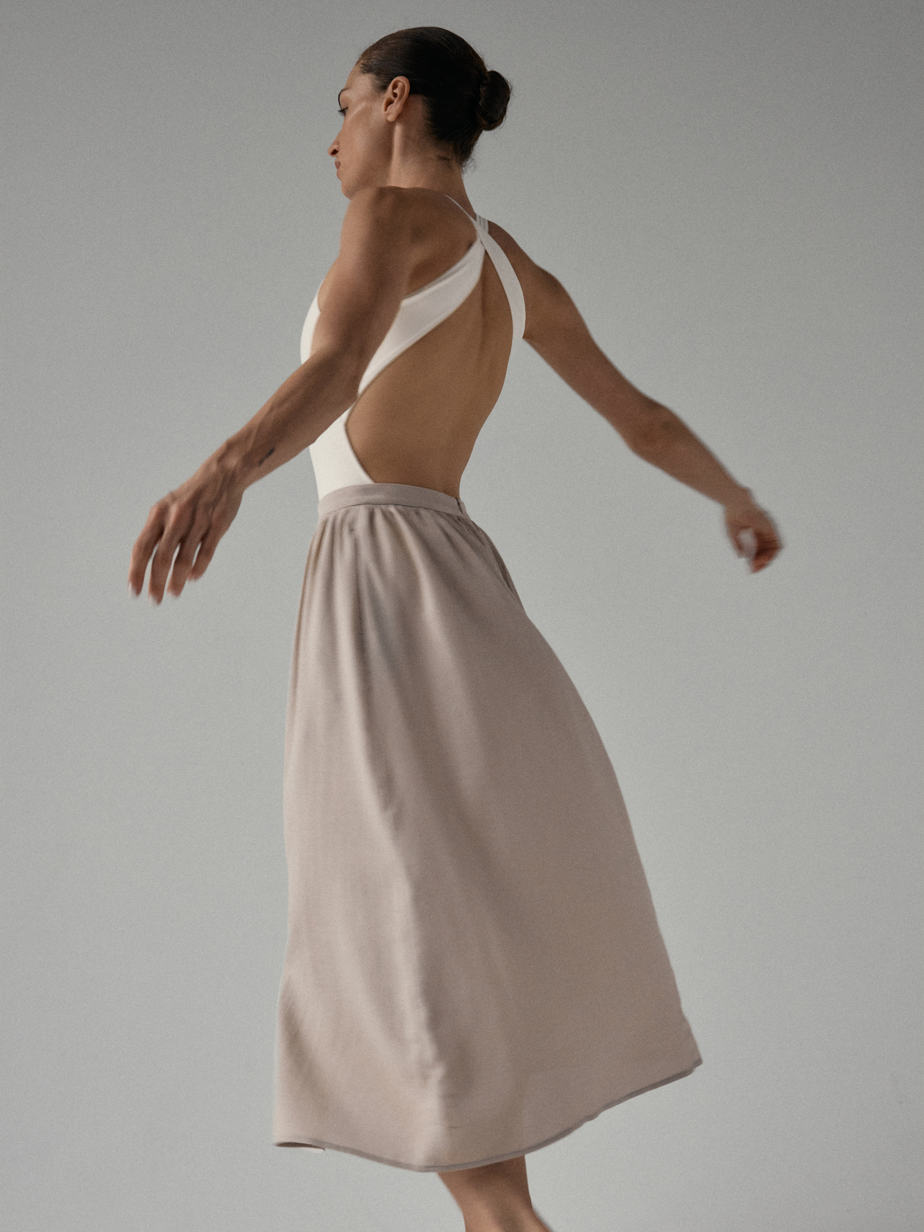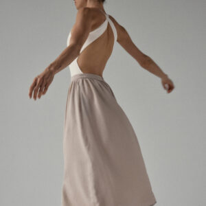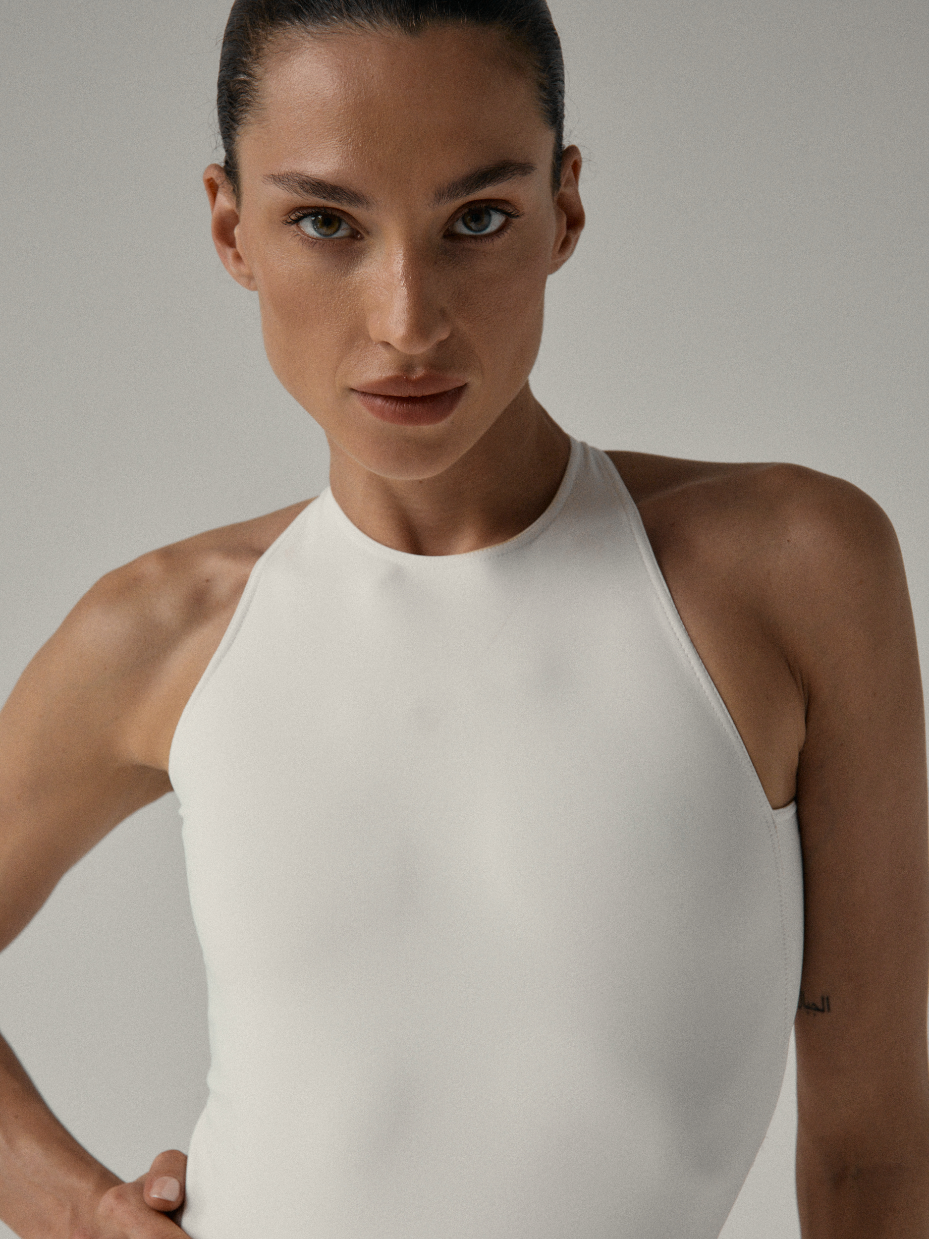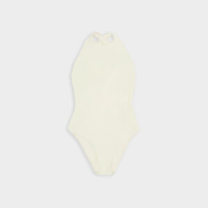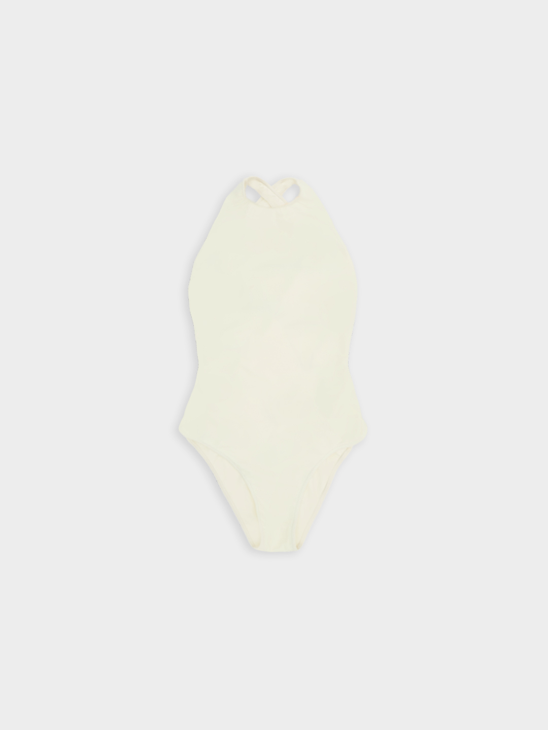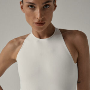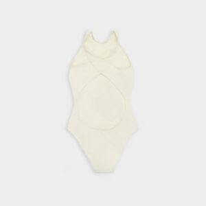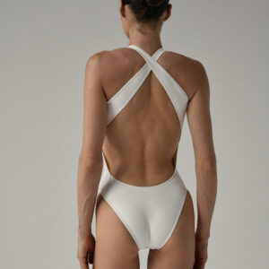 Kostium kąpielowy typu cross bandeau uszyty z elastycznego materiału. Na plecach ogromne wycięcie kończące się tuż przed linią fig podkreślające linię pleców. Szerokie ramiączka, które układają się w kształt litery X gwarantują mocne trzymanie i komfort noszenia. Duże wycięcia na biodrach optycznie wydłużają nogi. Body doskonale sprawdzi się w zestawieniu z jeansami, spodniami dresowymi i spódnicami.