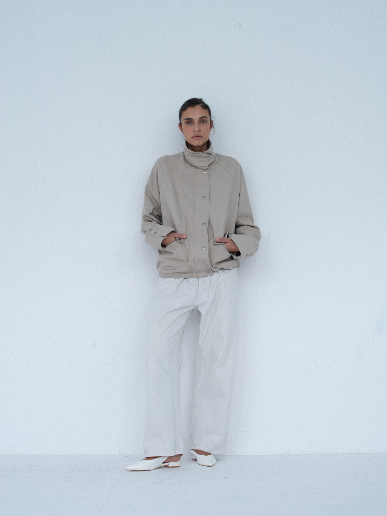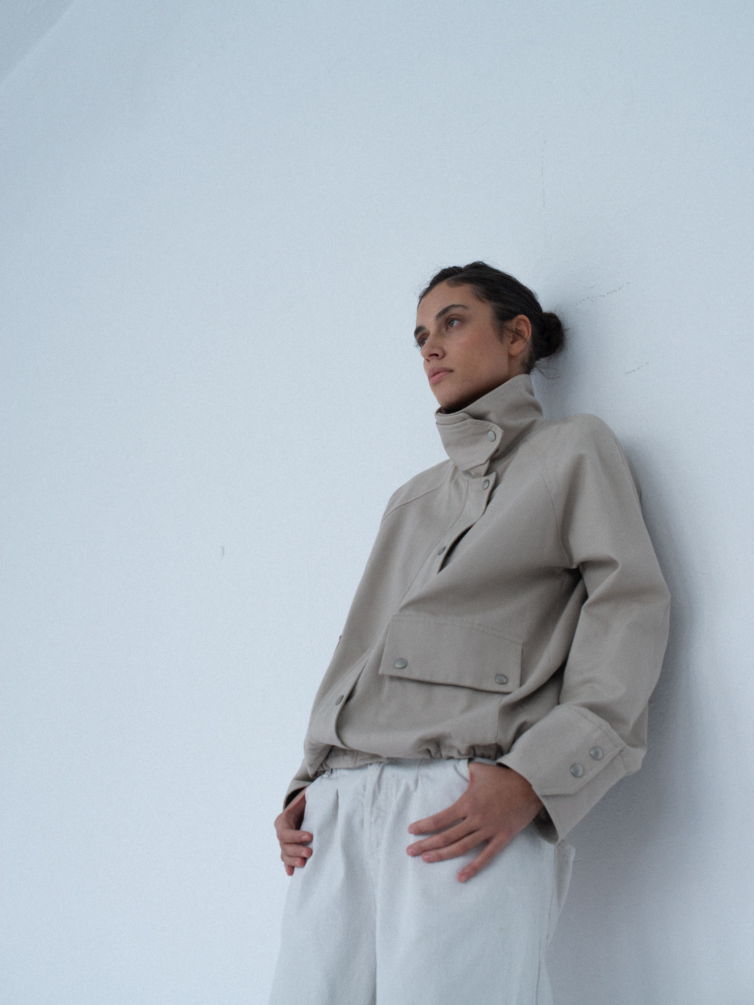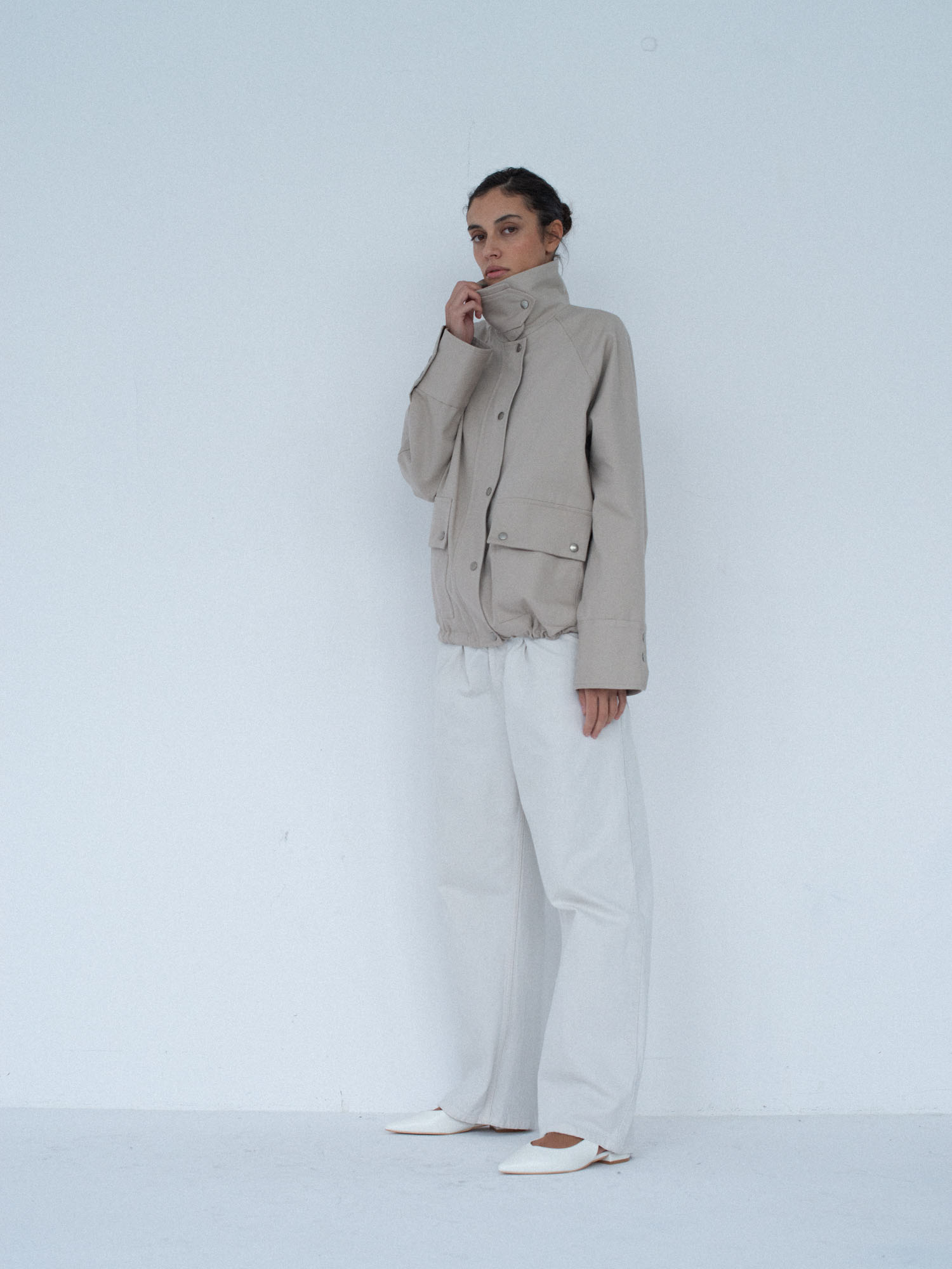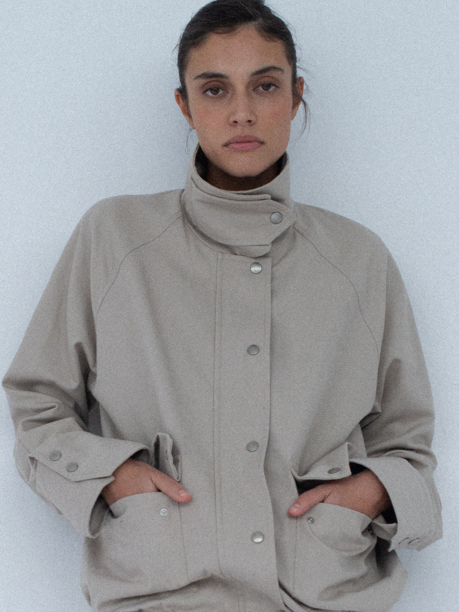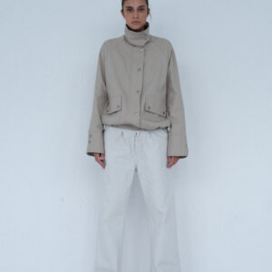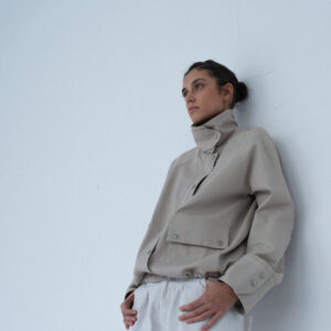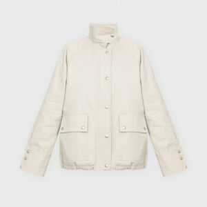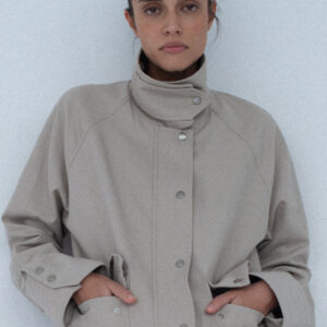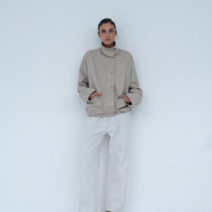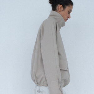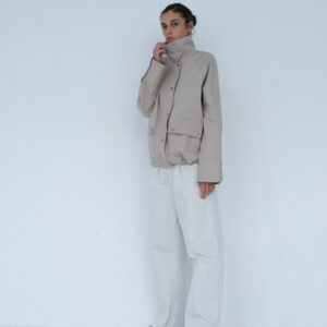 Lekko oversize’owa kurtka z bawełny, o pudełkowym kroju, z wysokim, zapinanym kołnierzem. Utrzymana w prostej, minimalistycznej estetyce, o standardowej długości, z dyskretnie ukrytą regulacją w dolnej części kurtki. Zapinana na zamek błyskawiczny osłonięty listwą oraz dodatkowymi srebrnymi zatrzaskami. Po bokach znajdują się dwie duże, funkcjonalne kieszenie. Model stanowi uniwersalną bazę stylizacyjną i doskonałe uzupełnienie codziennych zestawów. Świetnie komponuje się zarówno z botkami, jak i obuwiem sportowym. Najlepiej prezentuje się w monochromatycznych stylizacjach.
