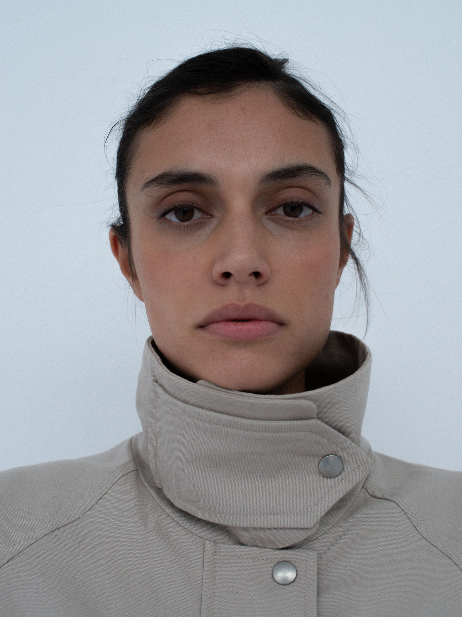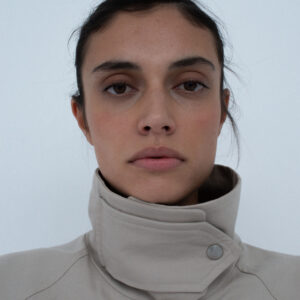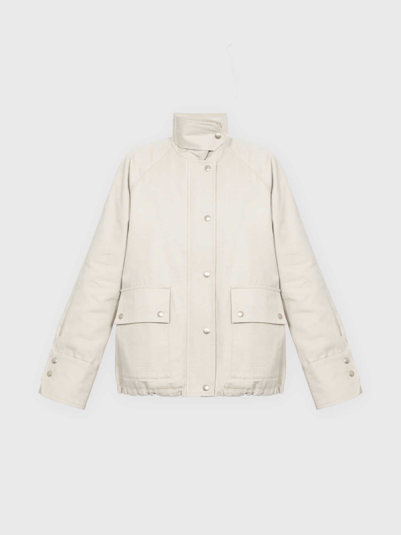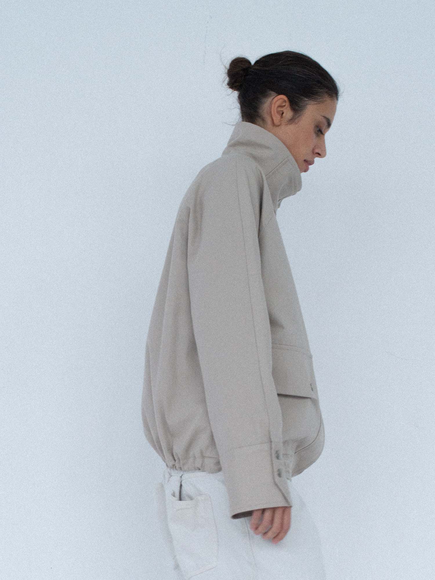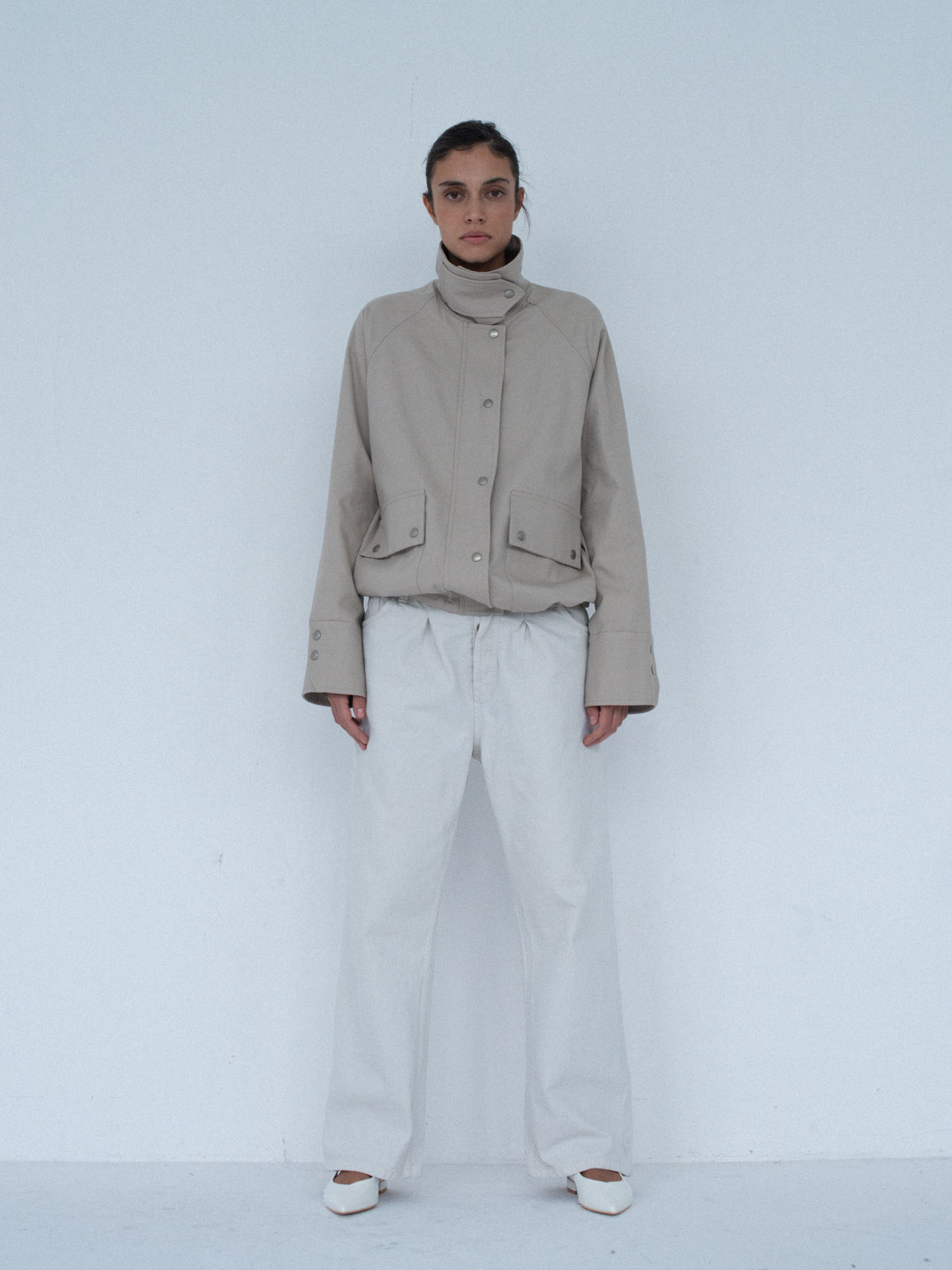 Lekko oversize’owa kurtka z bawełny, o pudełkowym kroju, z wysokim, zapinanym kołnierzem. Utrzymana w prostej, minimalistycznej estetyce, o standardowej długości, z dyskretnie ukrytą regulacją w dolnej części kurtki. Zapinana na zamek błyskawiczny osłonięty listwą oraz dodatkowymi srebrnymi zatrzaskami. Po bokach znajdują się dwie duże, funkcjonalne kieszenie. Model stanowi uniwersalną bazę stylizacyjną i doskonałe uzupełnienie codziennych zestawów. Świetnie komponuje się zarówno z botkami, jak i obuwiem sportowym. Najlepiej prezentuje się w monochromatycznych stylizacjach.