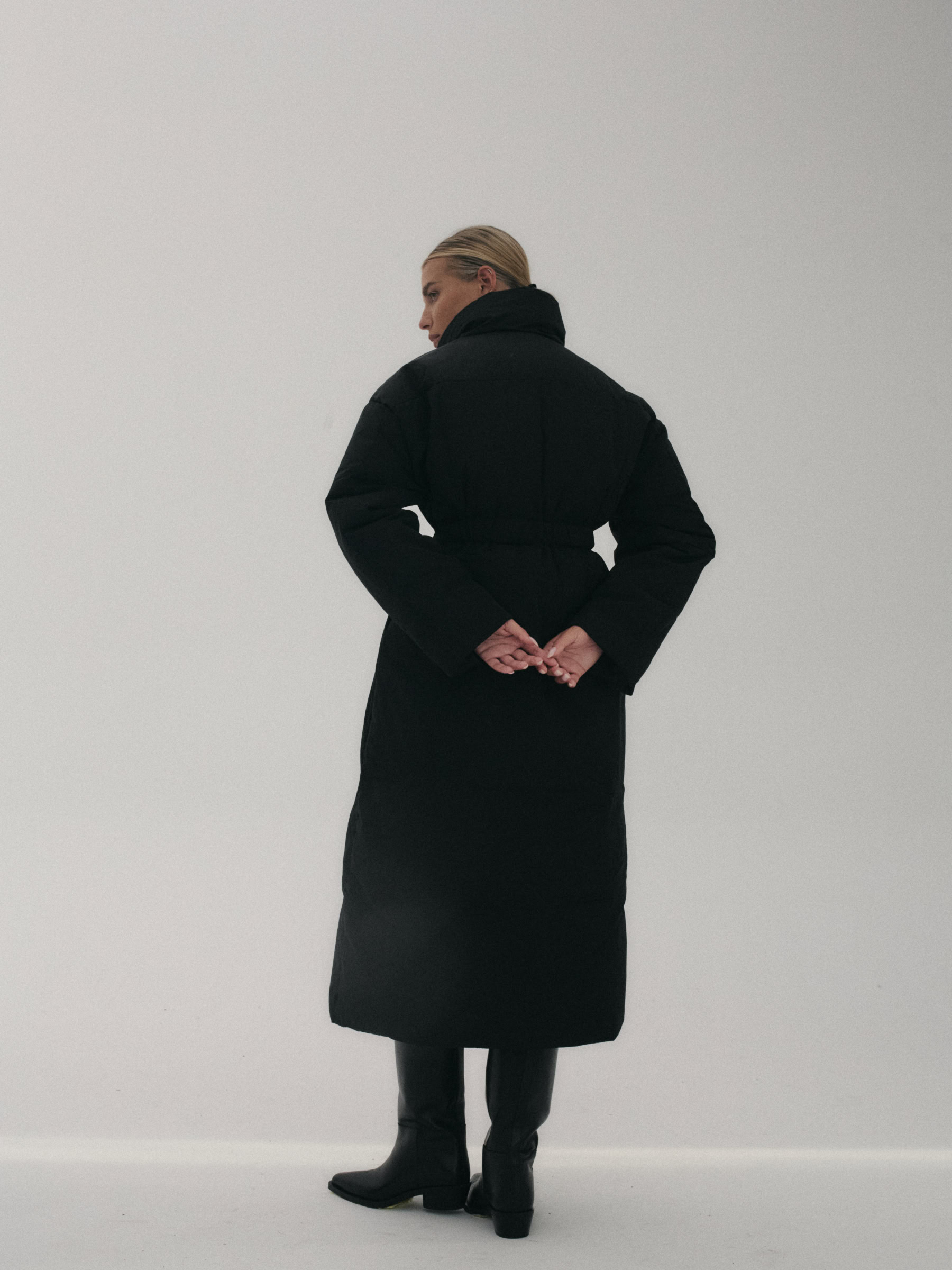 Długa kurtka puchowa o długości do połowy łydki. Z obszernym kołnierzem i otwartymi klapami.  Zawiązywana na szeroki pasek, doskonale podkreśla talię i ukrywa wszelkie mankamenty sylwetki. Dwie głębokie, funkcjonalne kieszenie po bokach. Będzie stanowiła doskonałe dopełnienie każdej stylizacji. Pasuje do każdego rodzaju ciężkich botków lub kozaków.
