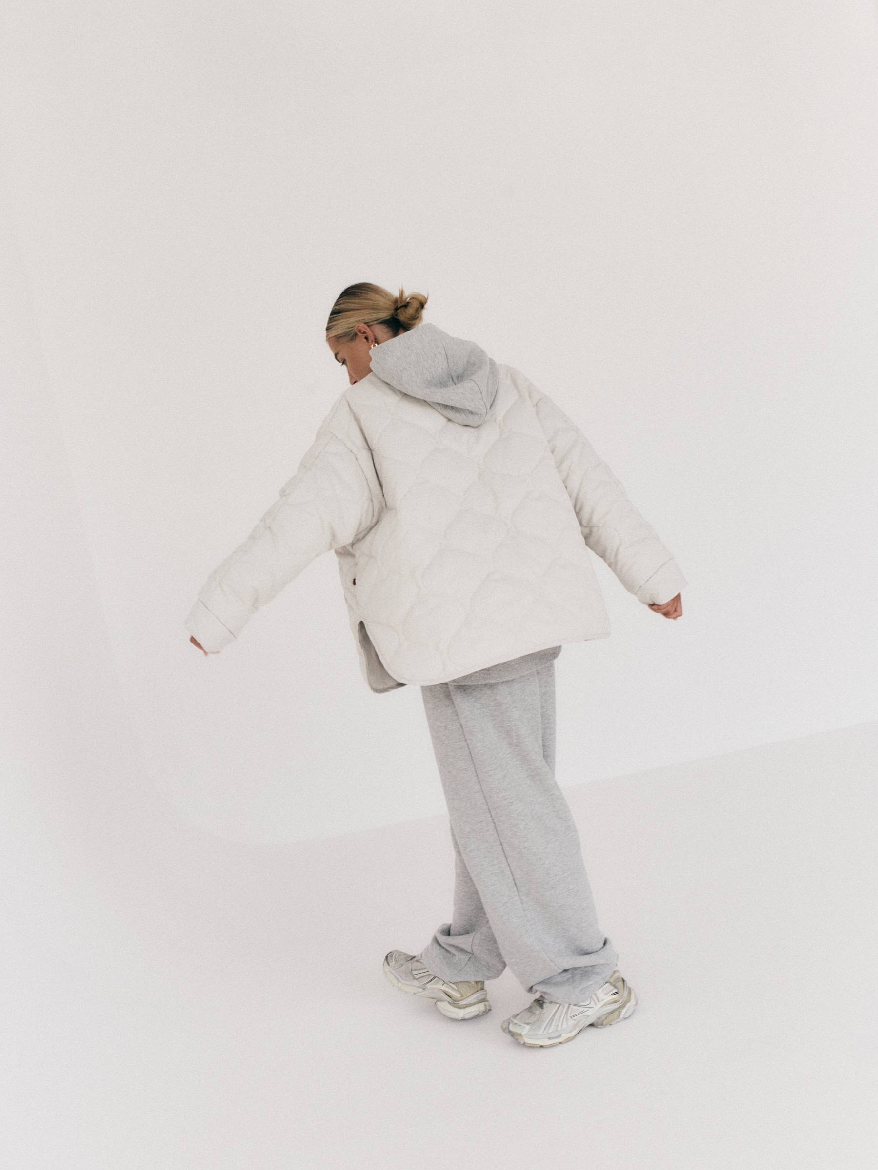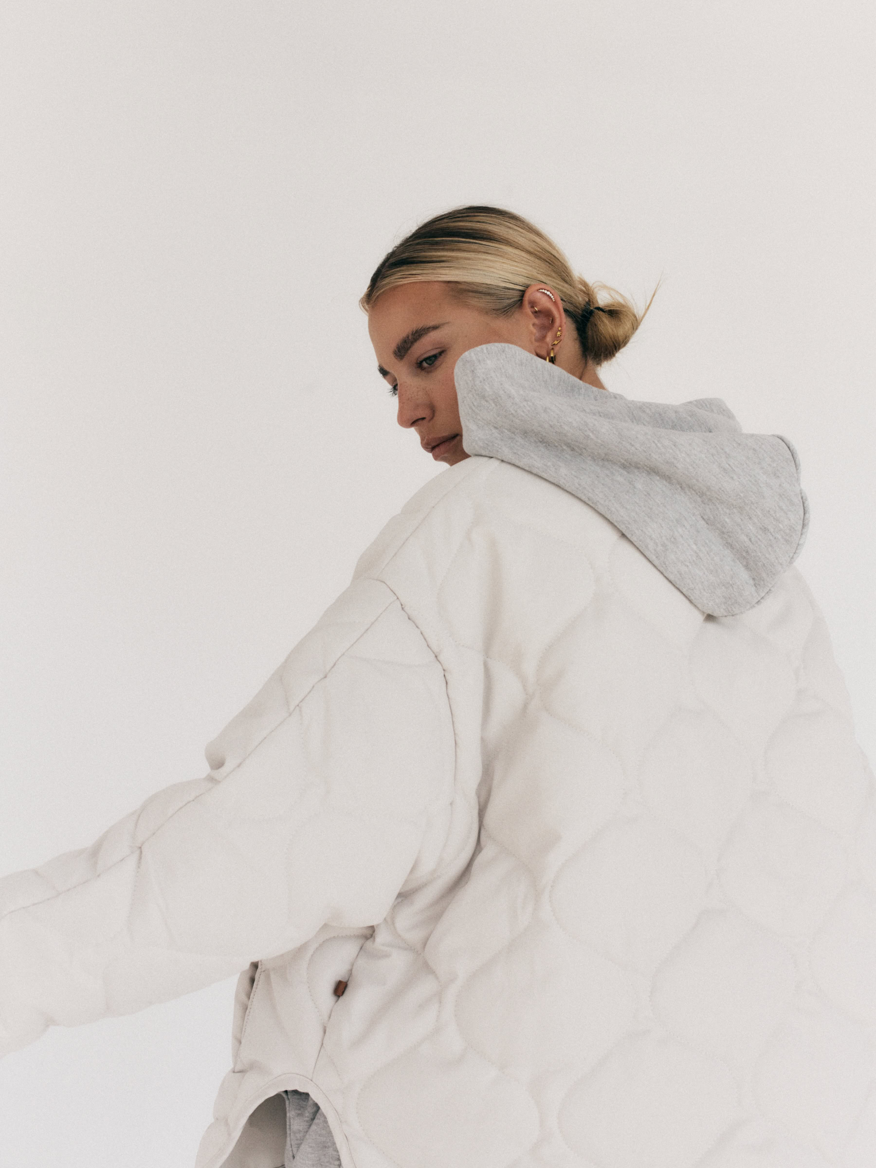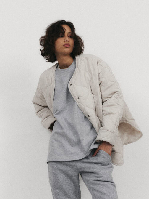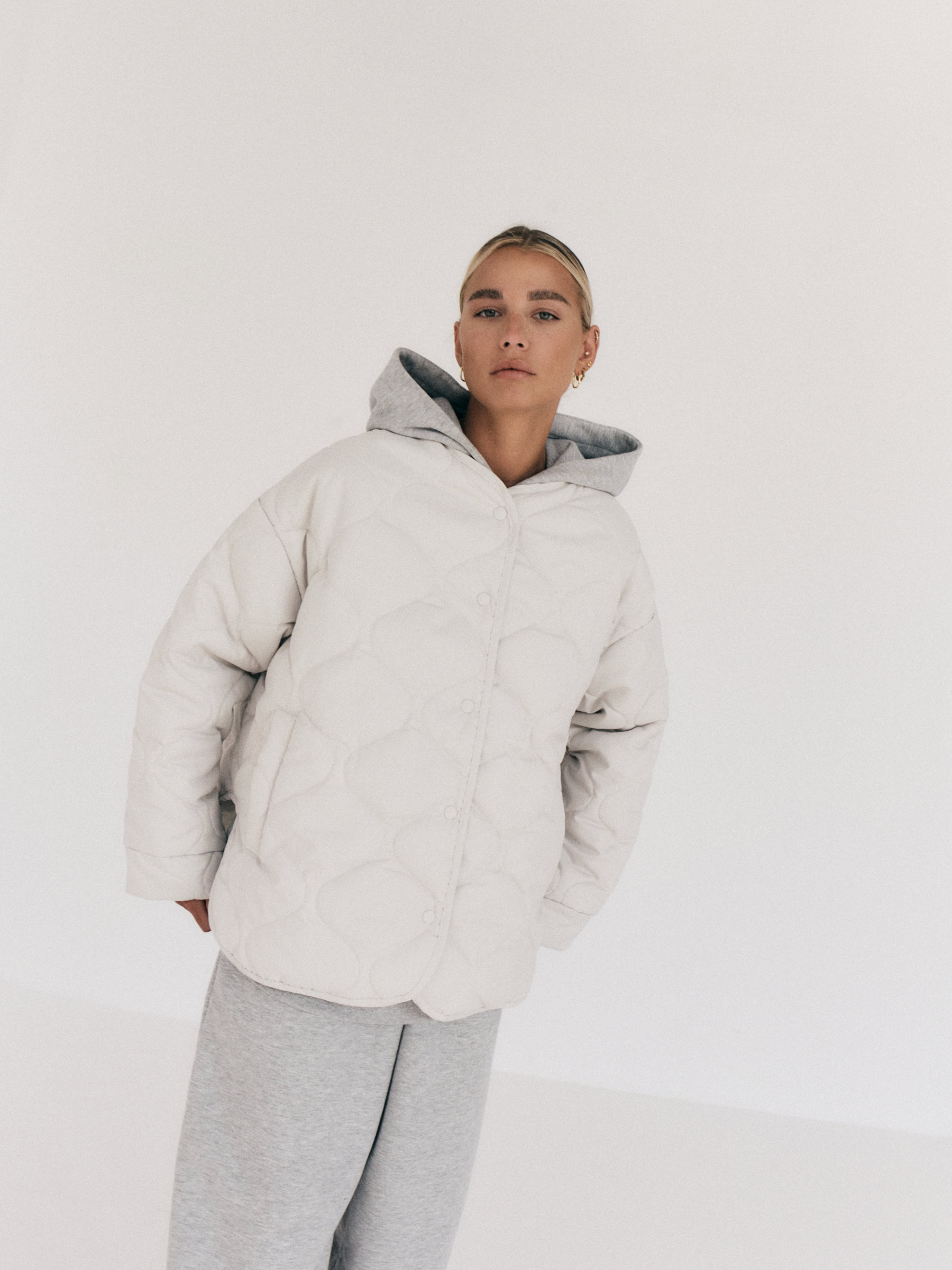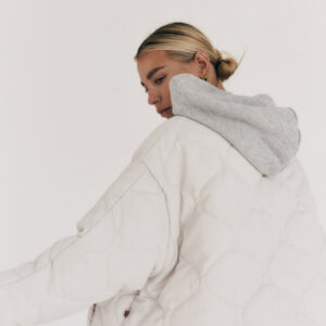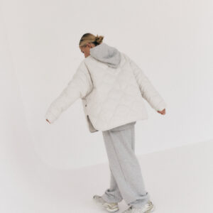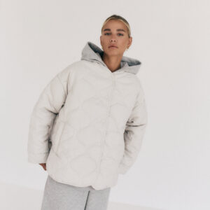 Mocno oversize’owa kurtka zapinana na metalowe guziki obite materiałem w tym samym kolorze. Pikowanie w “cebulki” i matowe wykończenie z meszkiem na wierzchu dopełnia całości – kurtka jest przemiła w dotyku. Posiada dwie głębokie kieszenie po bokach. Świetnie wygląda zarówno do spodni jak i sukienek. Najchętniej zestawiamy ją z ubraniami w podobnym odcieniu.
