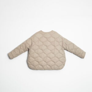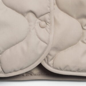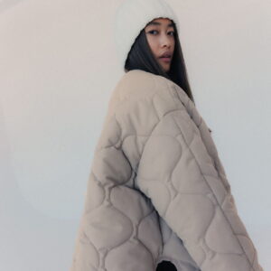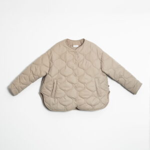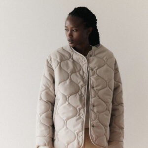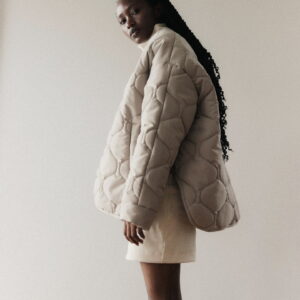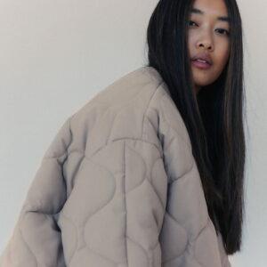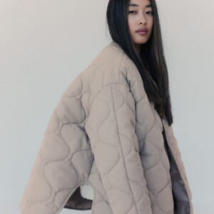 Mocno oversize’owa kurtka zapinana na metalowe guziki obite materiałem w tym samym kolorze. Pikowanie w “cebulki” i matowe wykończenie z meszkiem na wierzchu dopełnia całości – kurtka jest przemiła w dotyku. Posiada dwie głębokie kieszenie po bokach. Świetnie wygląda zarówno do spodni jak i sukienek. Najchętniej zestawiamy ją z ubraniami w podobnym odcieniu.