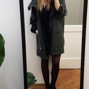 Jesienna kurtka typu parka z kolekcji LRC/16 uszyta ręcznie z matowego, trwałego ortalionu. Materiał jest mocny strukturalnie, aczkolwiek cienki, dzięki czemu kurtka jest bardzo lekka. Mocny oversize w połączeniu z butelkowozielonym kolorem zapewnia bardzo atrakcyjny wygląd i duże poczucie komfortu. Duży kaptur skutecznie zapobiega dostawaniu się do środka wiatru. W środku czarna, przyjemna dla skóry podszewka wykończona dużych rozmiarów czarną eko wszywką. Mankiety wyposażone w napy do zmniejszania ich szerokości. Model zapinany na zamek błyskawiczny i napy, na dole grube, porządne sznurki do ściągania. Całość wykończona czarną wszywką z eko skóry na dole kurtki.