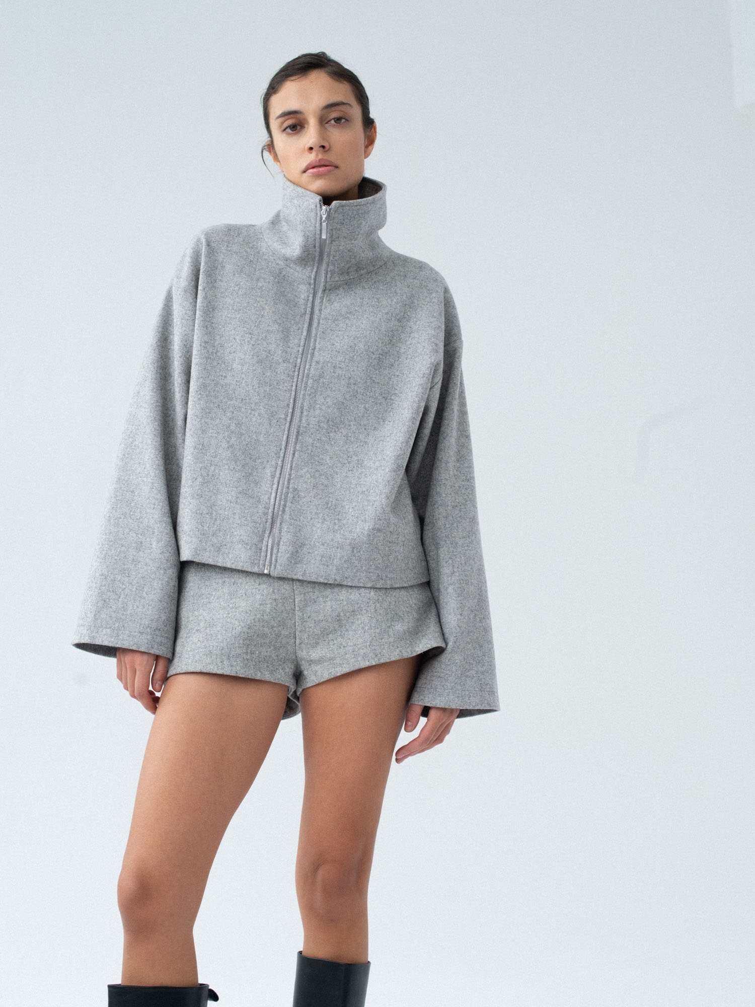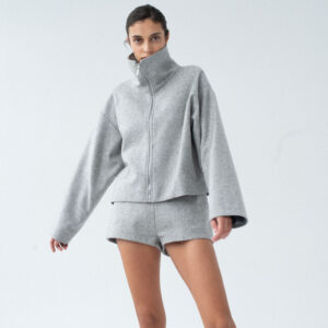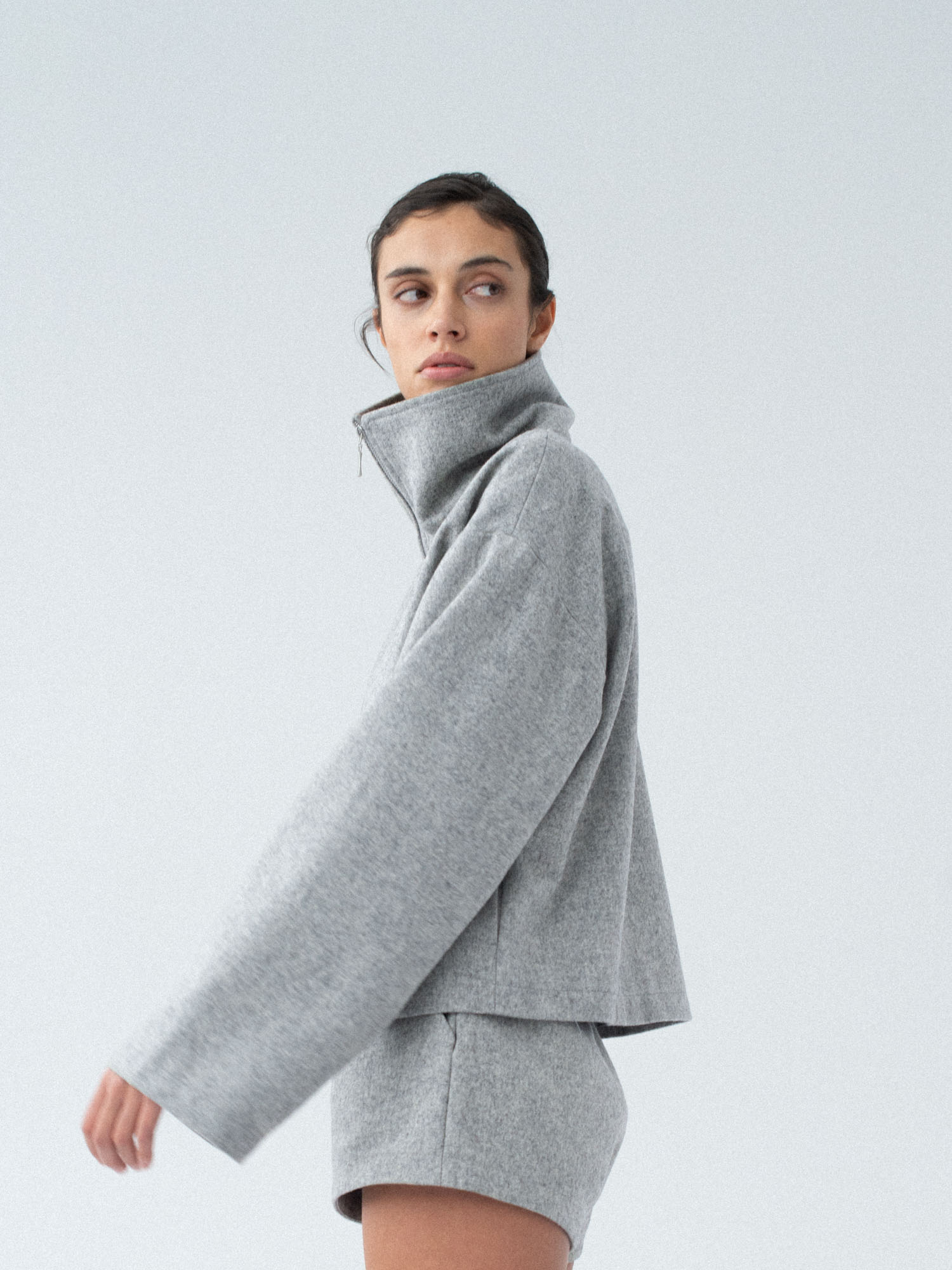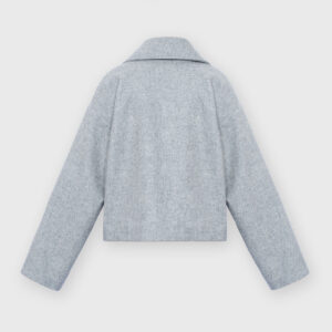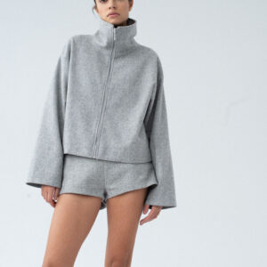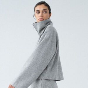 Lekko oversizowa wełniana kurtka z wysokim kołnierzem o pudełkowym kroju. Prosta, minimalistyczna, standardowej długości z obniżoną linią ramion. Zapinana na zamek. Po bokach dwie duże, funkcjonalne kieszenie. Kurtka będzie idealnym uzupełnieniem lub bazą każdej stylizacji. Pasuje do każdego rodzaju obuwia: botków lub sportowych butów. Najlepiej wygląda w monochromatycznych zestawach.