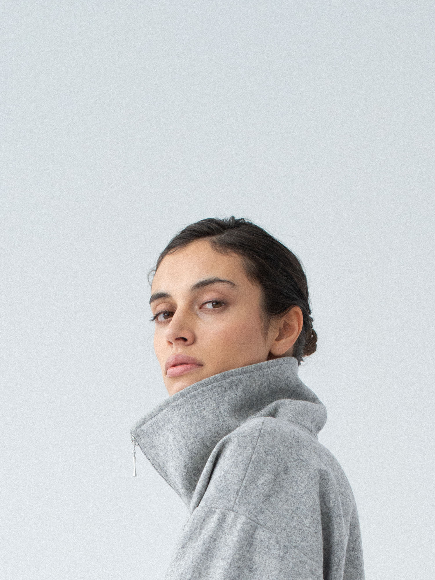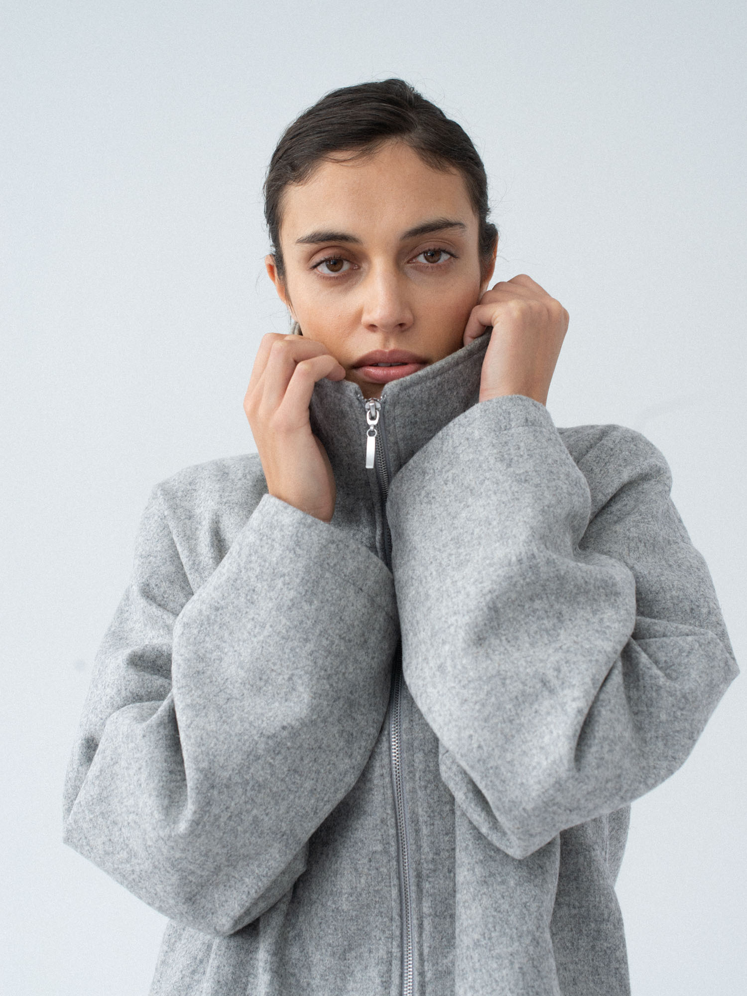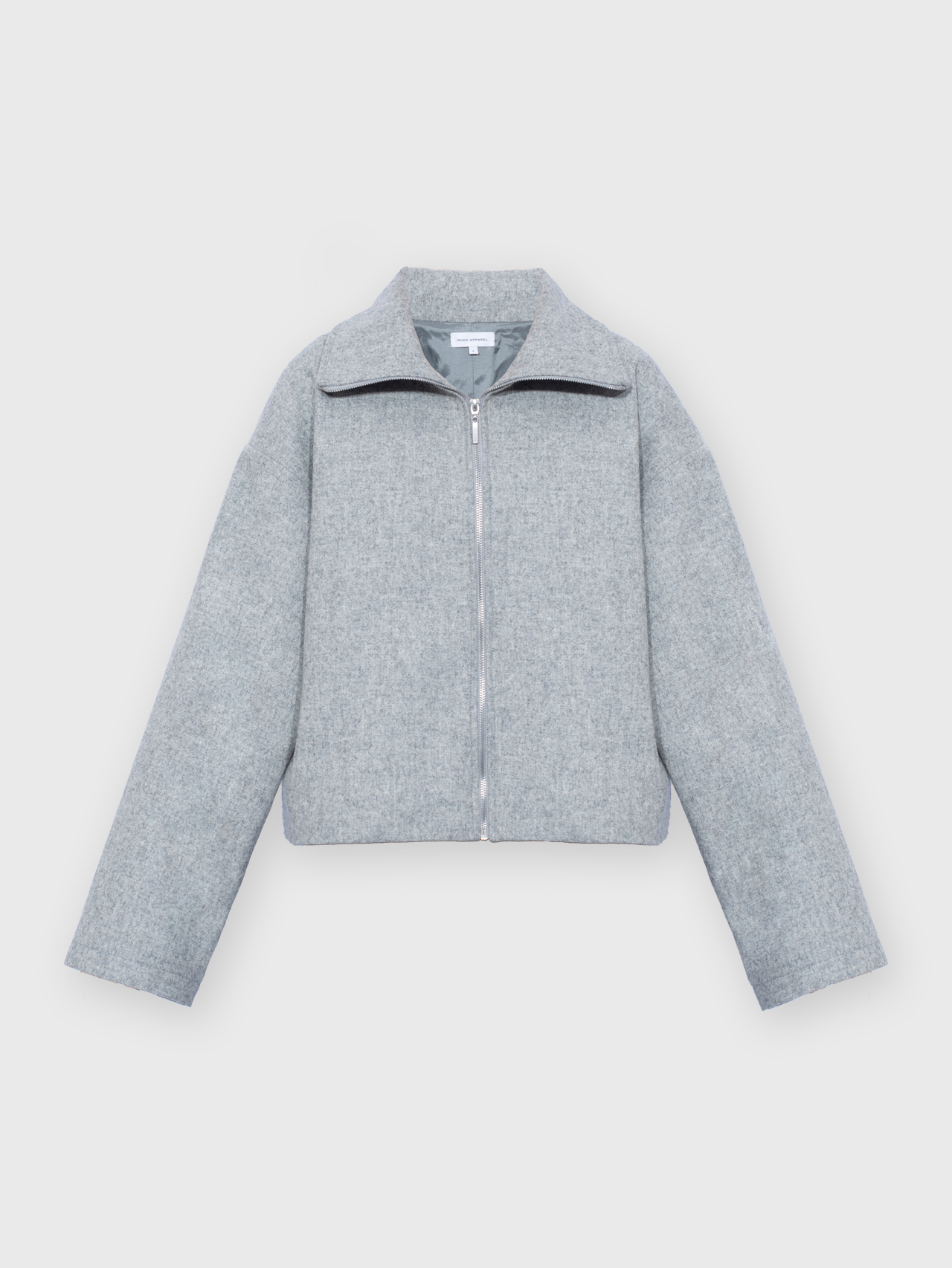 Lekko oversizowa wełniana kurtka z wysokim kołnierzem o pudełkowym kroju. Prosta, minimalistyczna, standardowej długości z obniżoną linią ramion. Zapinana na zamek. Po bokach dwie duże, funkcjonalne kieszenie. Kurtka będzie idealnym uzupełnieniem lub bazą każdej stylizacji. Pasuje do każdego rodzaju obuwia: botków lub sportowych butów. Najlepiej wygląda w monochromatycznych zestawach.