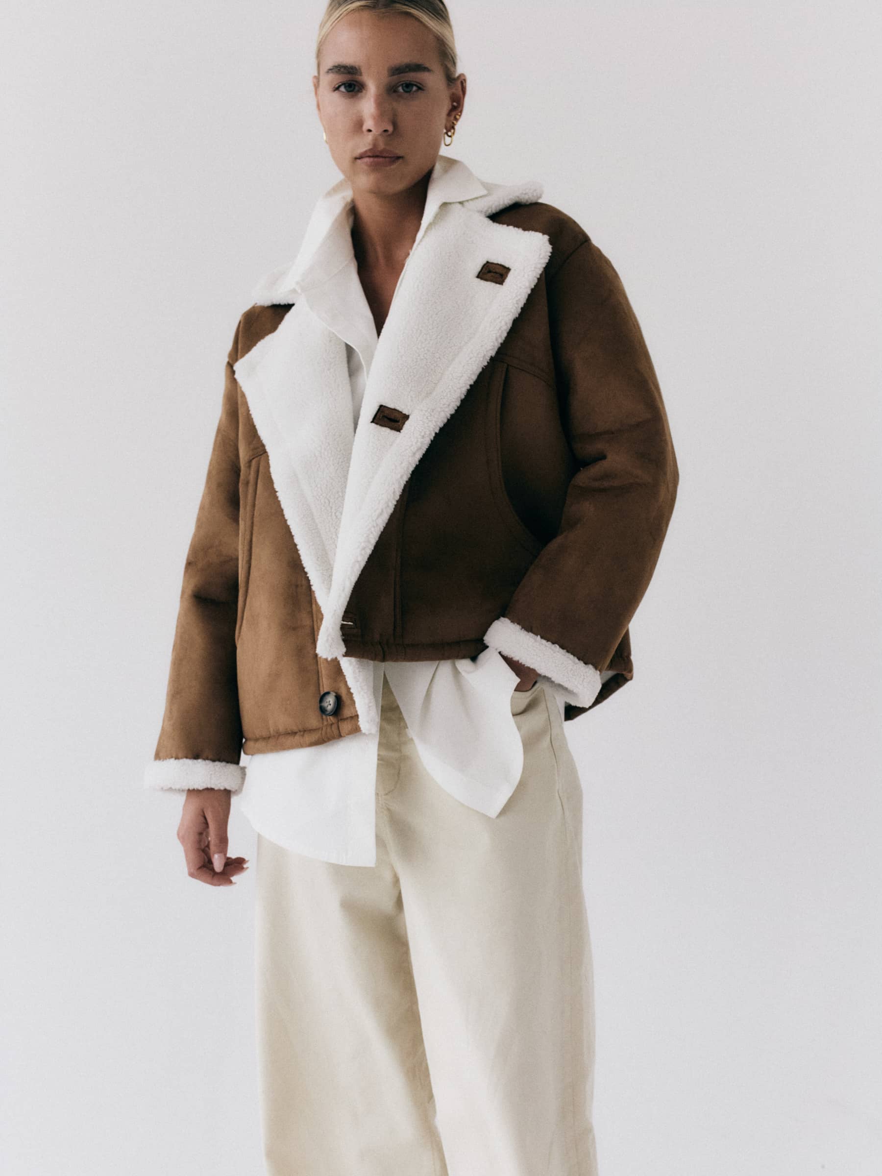 Kurtka TOUCHE uszyta jest z delikatnego materiału do złudzenia przypominającego zamsz, który produkowany jest bez okrucieństwa wobec zwierząt. Gładka tkanina jest niezwykle przyjemna w dotyku. Świetnie się układa i jest elastyczna. Podszyta miękkim materiałem trzymającym ciepło w chłodne dni.