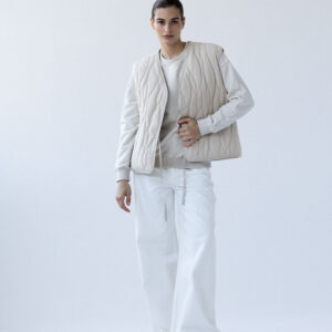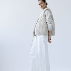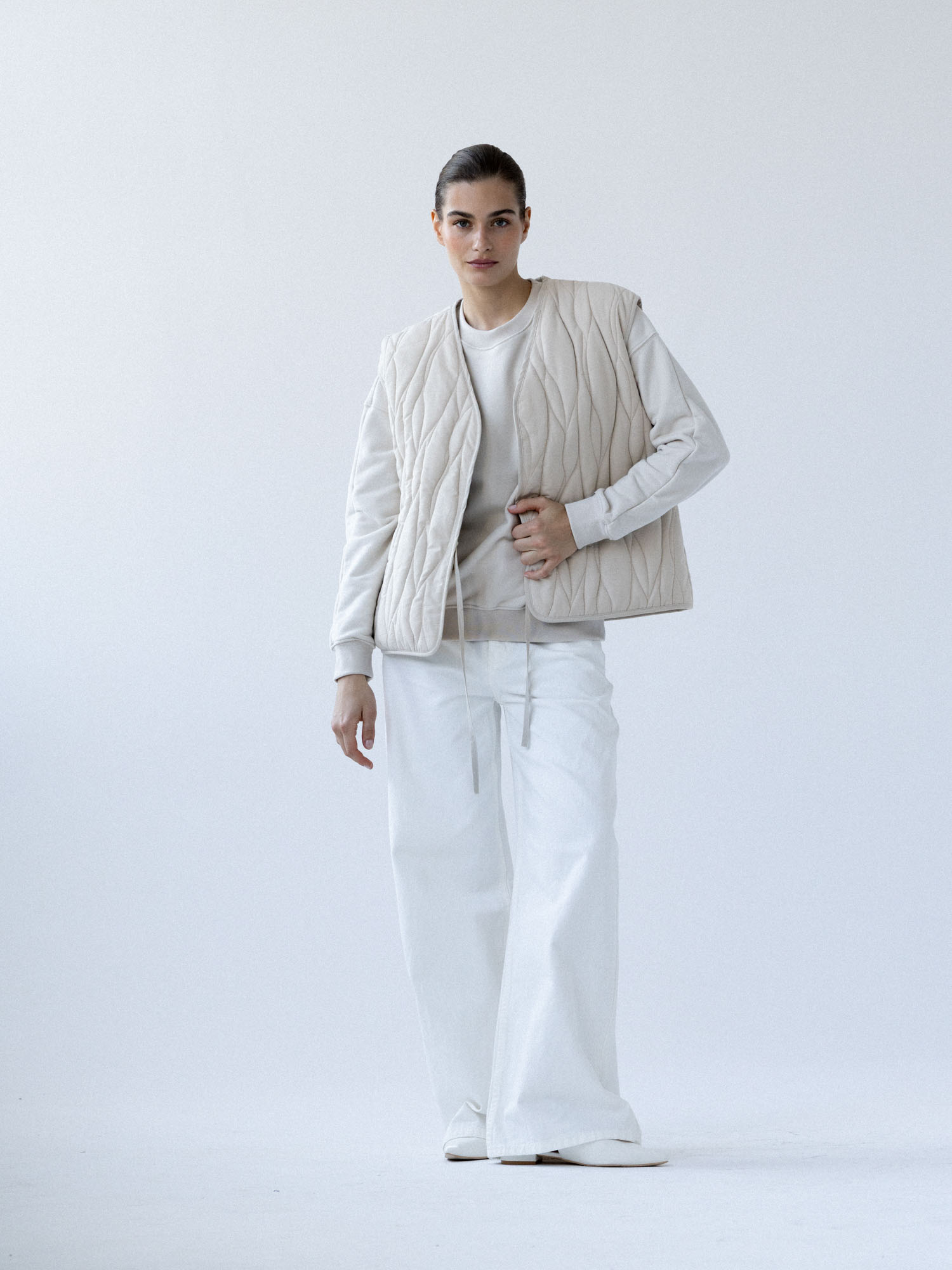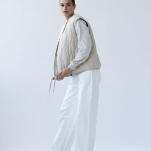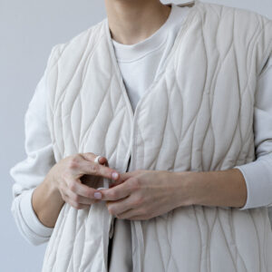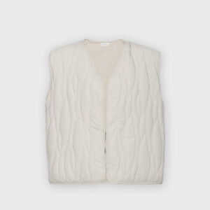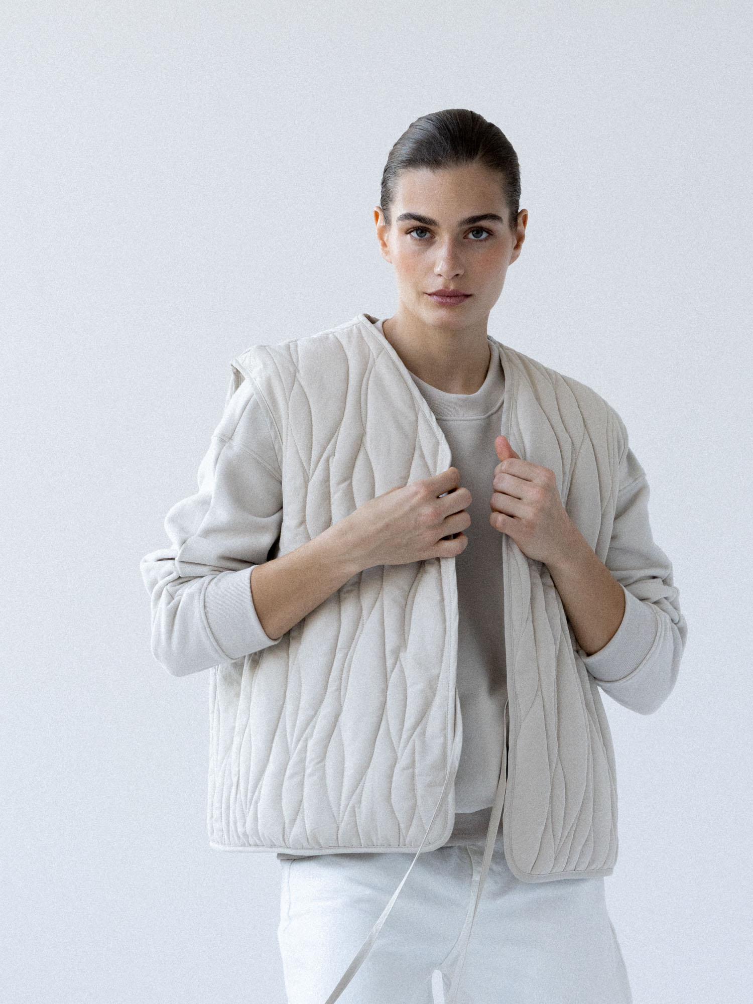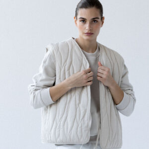 Pikowana kamizelka o luźnym oversizowym kroju. Pikowanie nadaje kamizelce strukturę, dzięki czemu utrzymuje ona swój kształt. Model posiada dwie funkcjonalne kieszenie oraz wiązanie na wysokości talii. Świetnie sprawdzi się w codziennych stylizacjach warstwowych – noś ją zarówno do koszul i swetrów, jak i w duecie z bluzą czy sukienką.