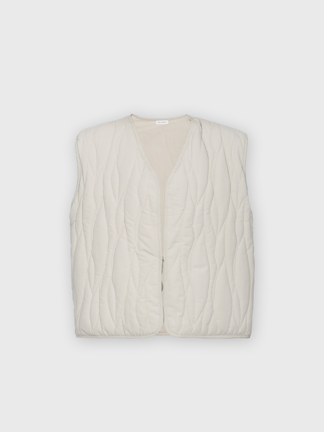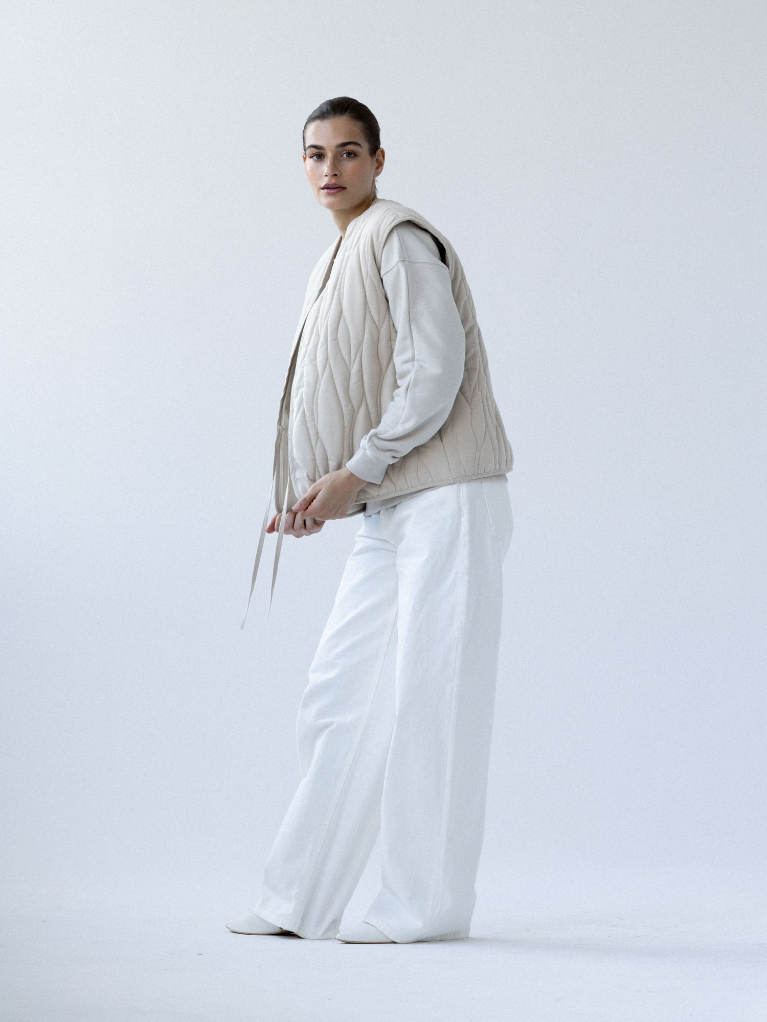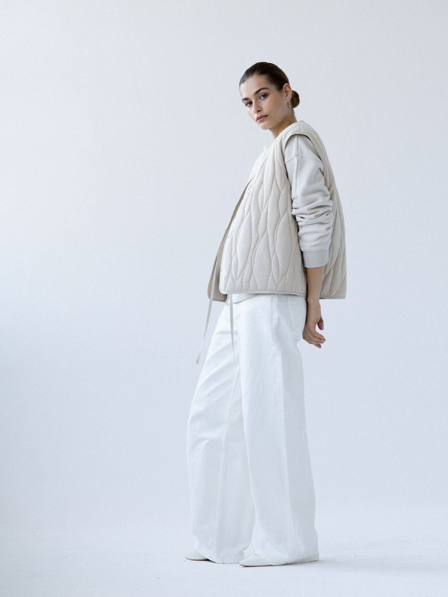 Pikowana kamizelka o luźnym oversizowym kroju. Pikowanie nadaje kamizelce strukturę, dzięki czemu utrzymuje ona swój kształt. Model posiada dwie funkcjonalne kieszenie oraz wiązanie na wysokości talii. Świetnie sprawdzi się w codziennych stylizacjach warstwowych – noś ją zarówno do koszul i swetrów, jak i w duecie z bluzą czy sukienką.