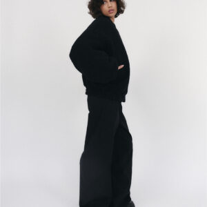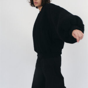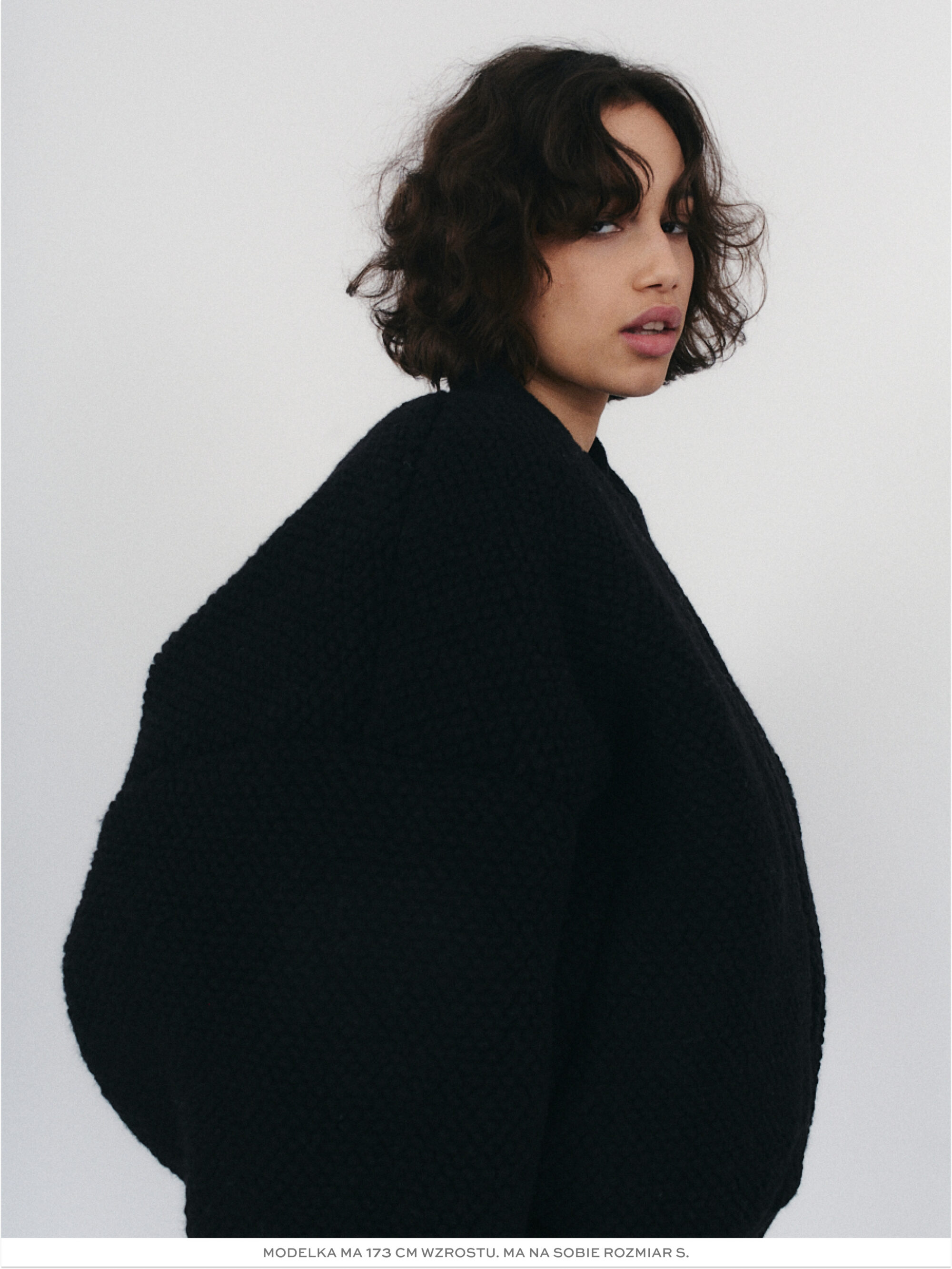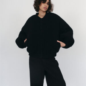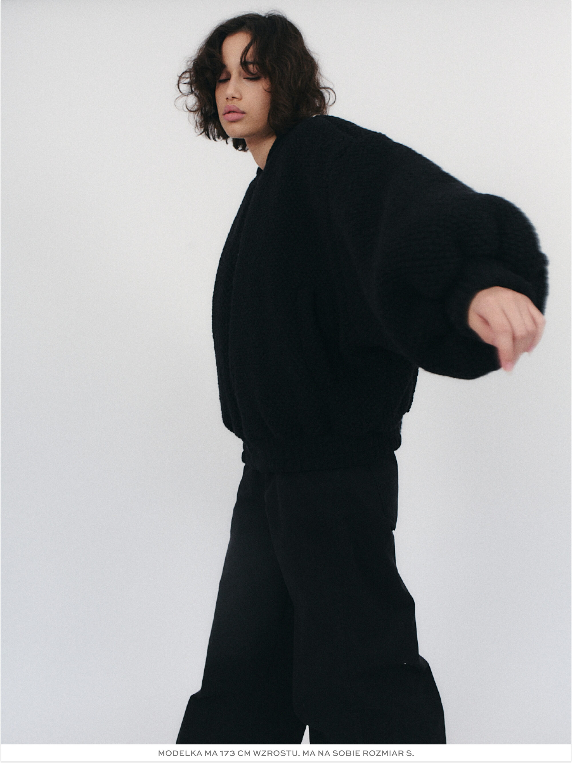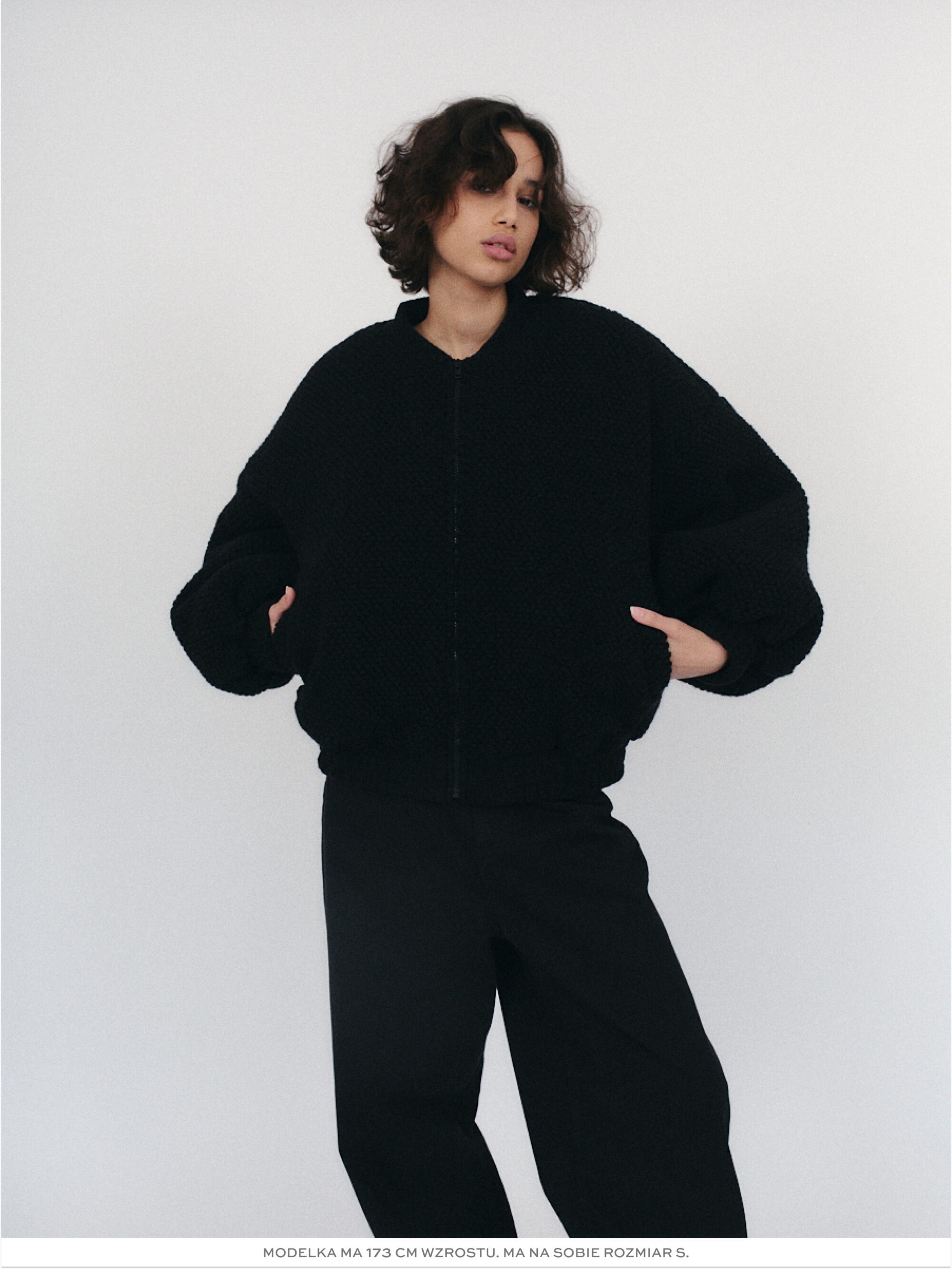 Kurtka typu bomberka z obniżoną linią ramion, wykończona ściągaczem w czarnym kolorze. Prosta, minimalistyczna, wyróżniająca się ciekawą strukturą materiału. Zapinana na zamek. Poprzez gruby ściągacz, możemy podnieść dół produktu wyżej, tworząc z niego kształt oversize’owej ”bombki”. Po bokach dwie głębokie, funkcjonalne kieszenie. Kurtka będzie idealnym uzupełnieniem lub bazą każdej stylizacji. Sprawdzi się świetnie w sezonie jesienno-zimowym i pasuje do każdego rodzaju obuwia: ciężkich botków lub sportowych butów. Najlepiej wygląda w monochromatycznych zestawach.