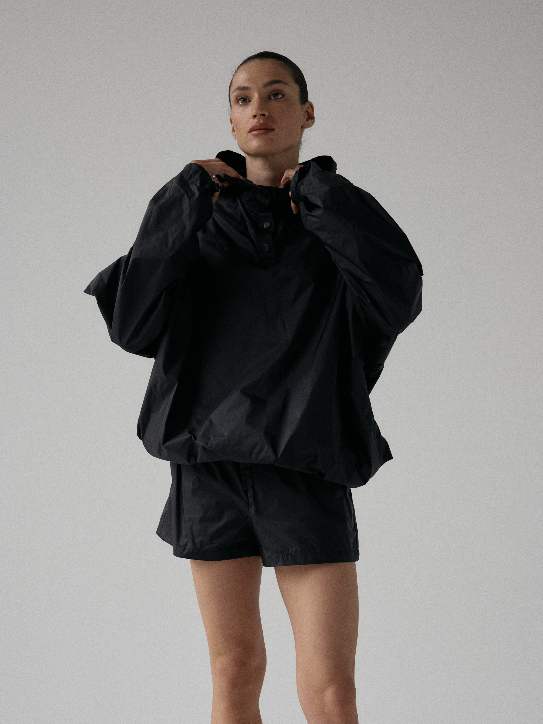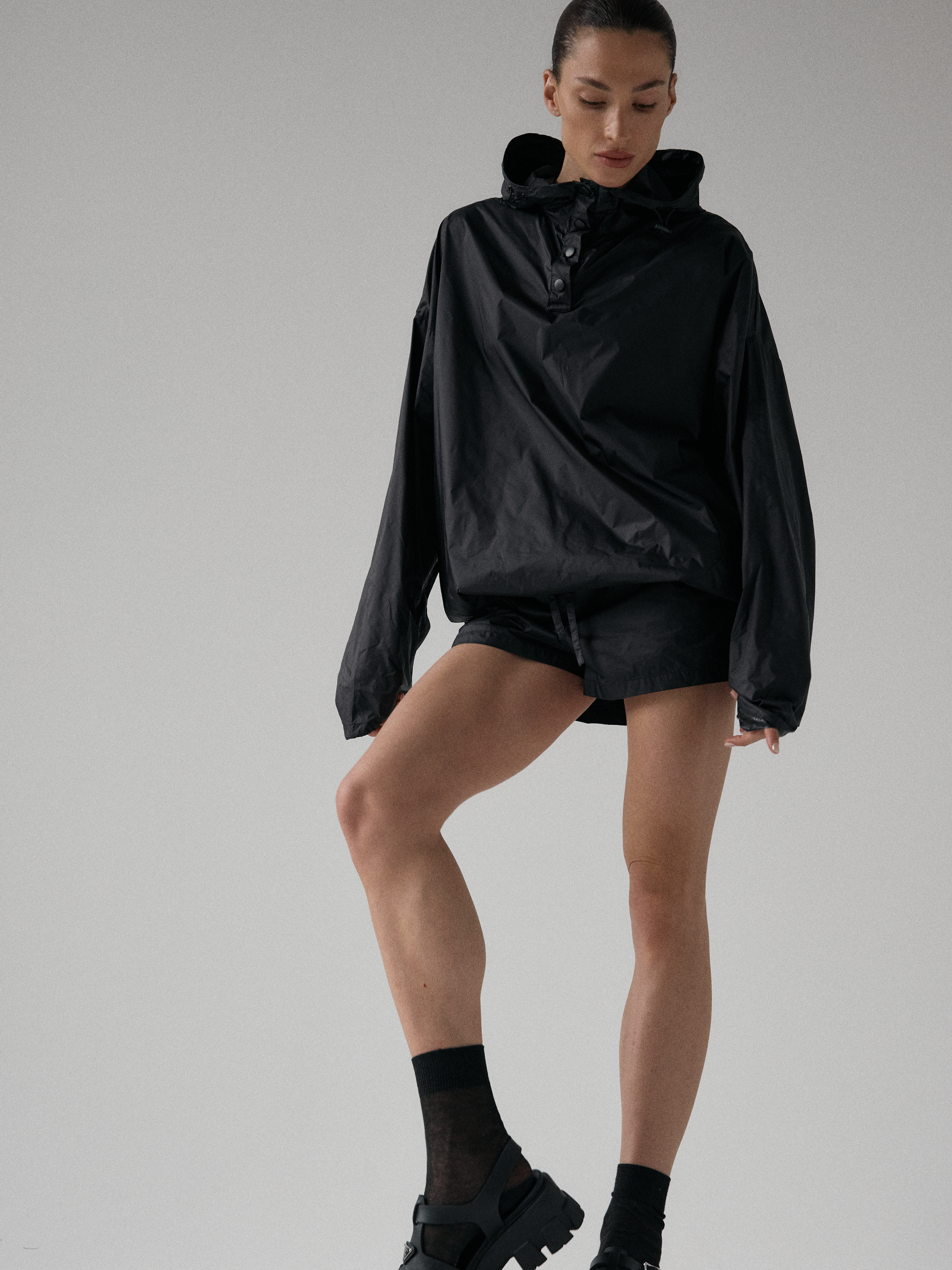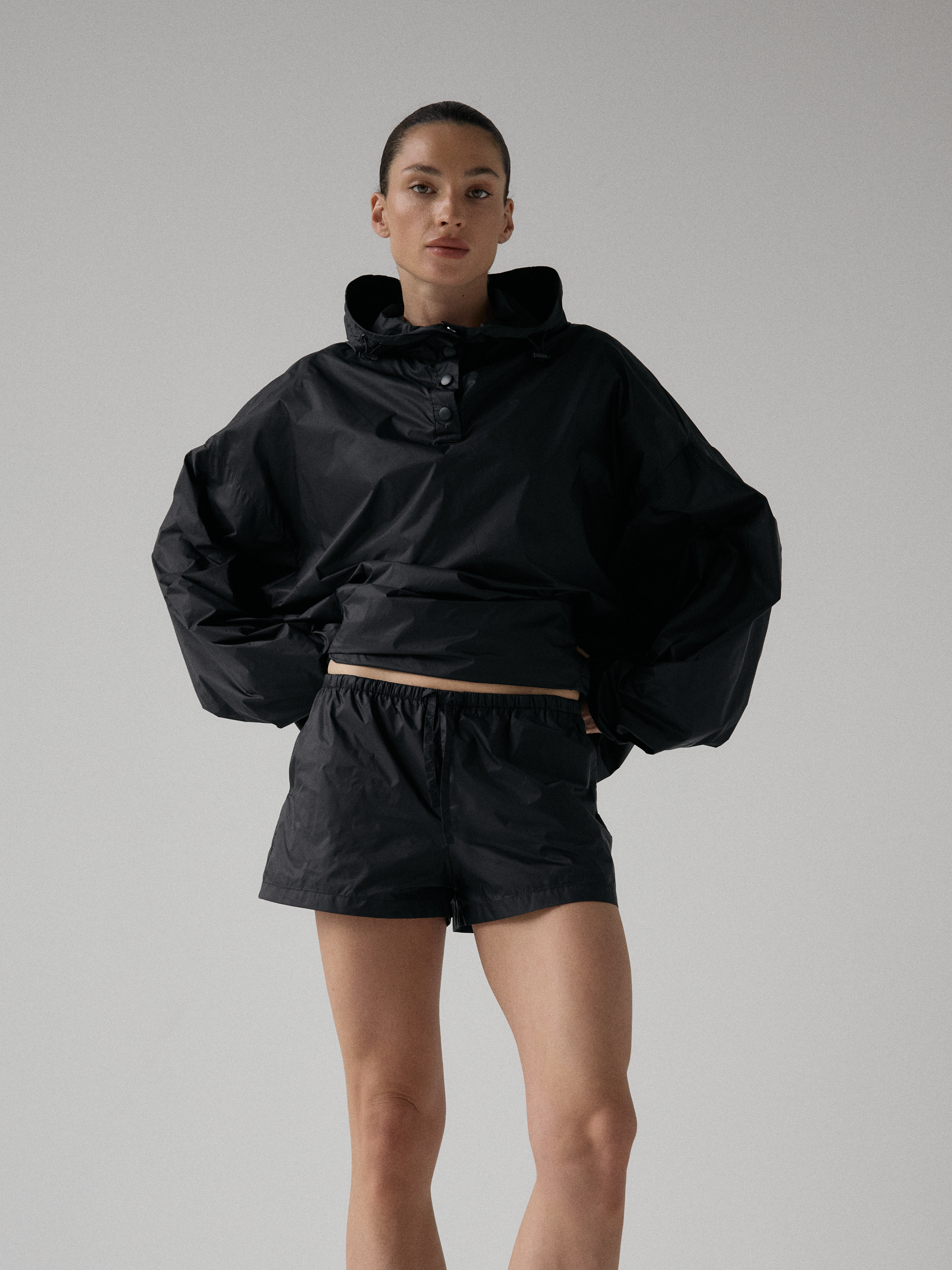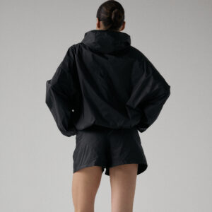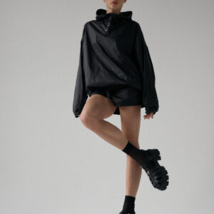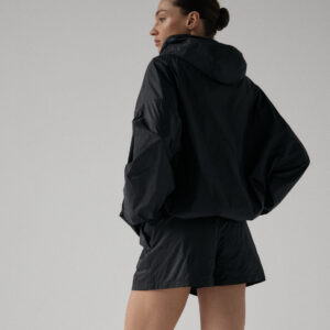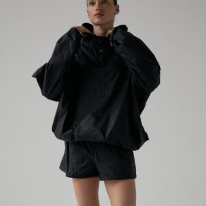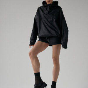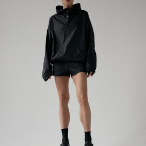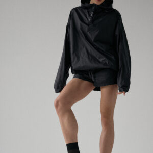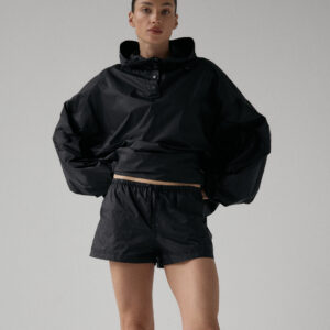 Spodenki ortalionowe z niskim stanem. Model posiada dwie funkcjonalne kieszenie, które dopełniają całości. Elastyczny pas z wewnętrznym ściągaczem zapewnia wygodę i łatwą regulację. Nogawki wykończone ozdobnymi przeszyciami. W zestawie z kurtką ortalionową OAME tworzą świetny miejski look.
