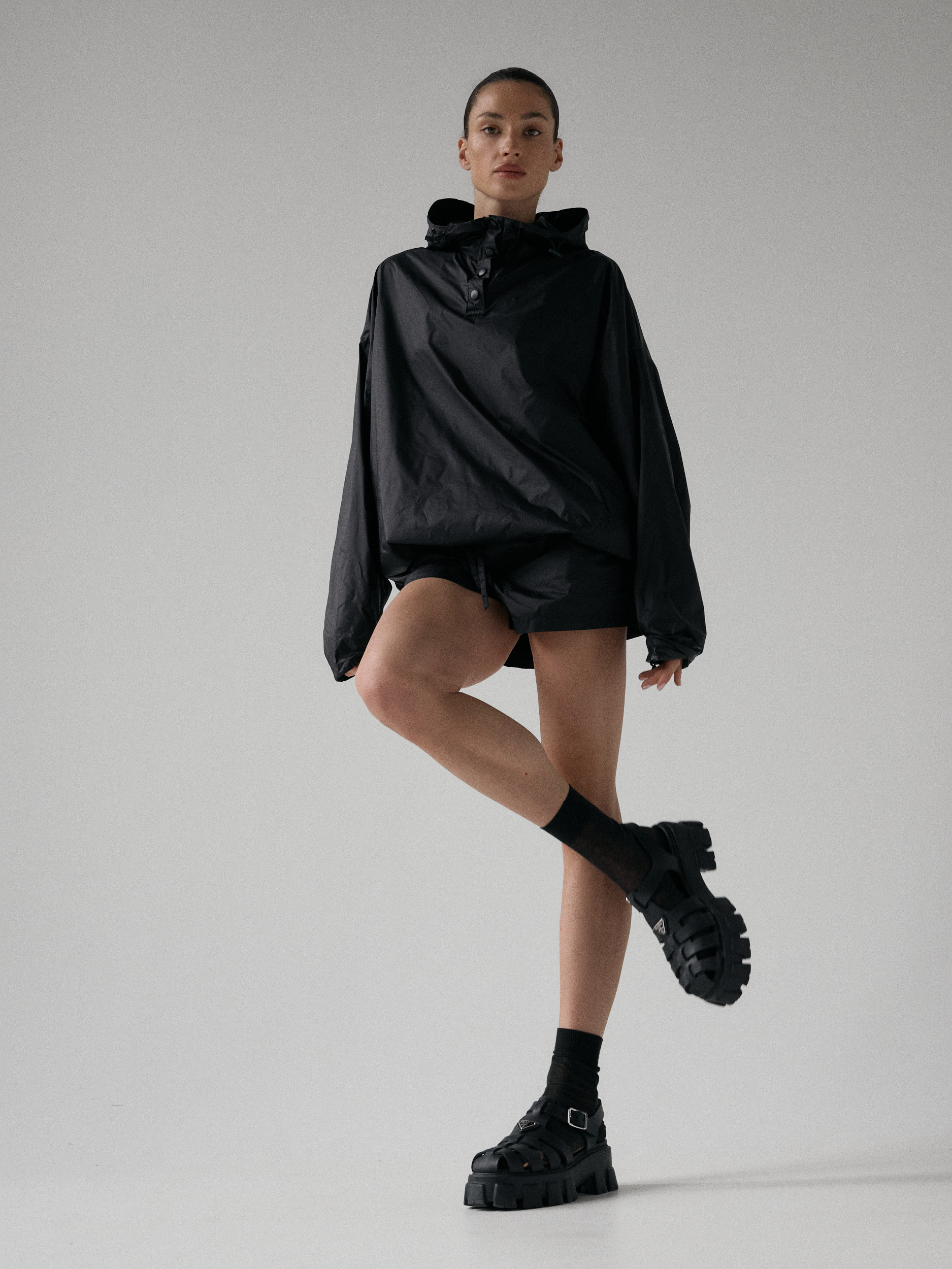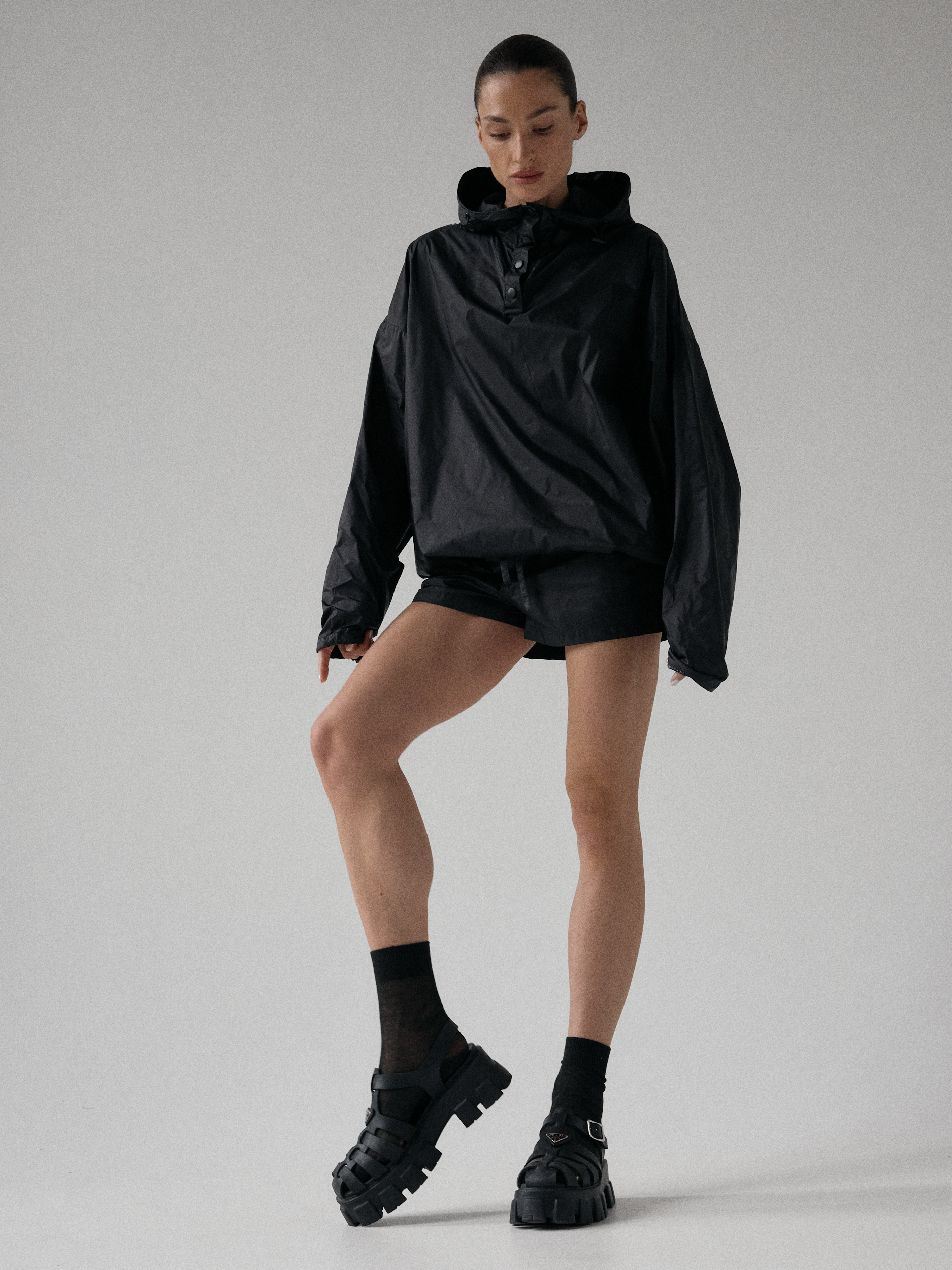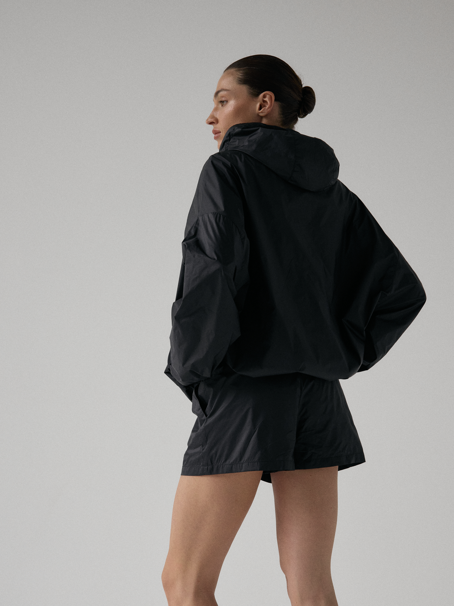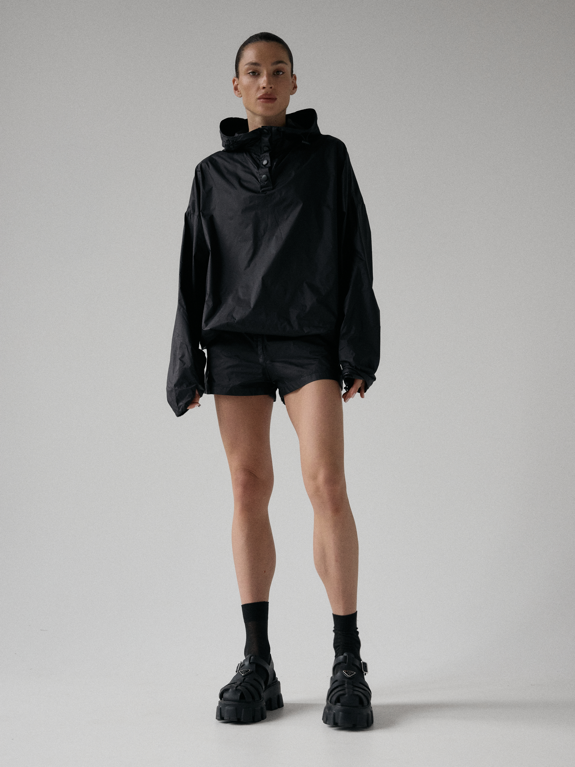 Spodenki ortalionowe z niskim stanem. Model posiada dwie funkcjonalne kieszenie, które dopełniają całości. Elastyczny pas z wewnętrznym ściągaczem zapewnia wygodę i łatwą regulację. Nogawki wykończone ozdobnymi przeszyciami. W zestawie z kurtką ortalionową OAME tworzą świetny miejski look.
