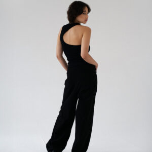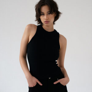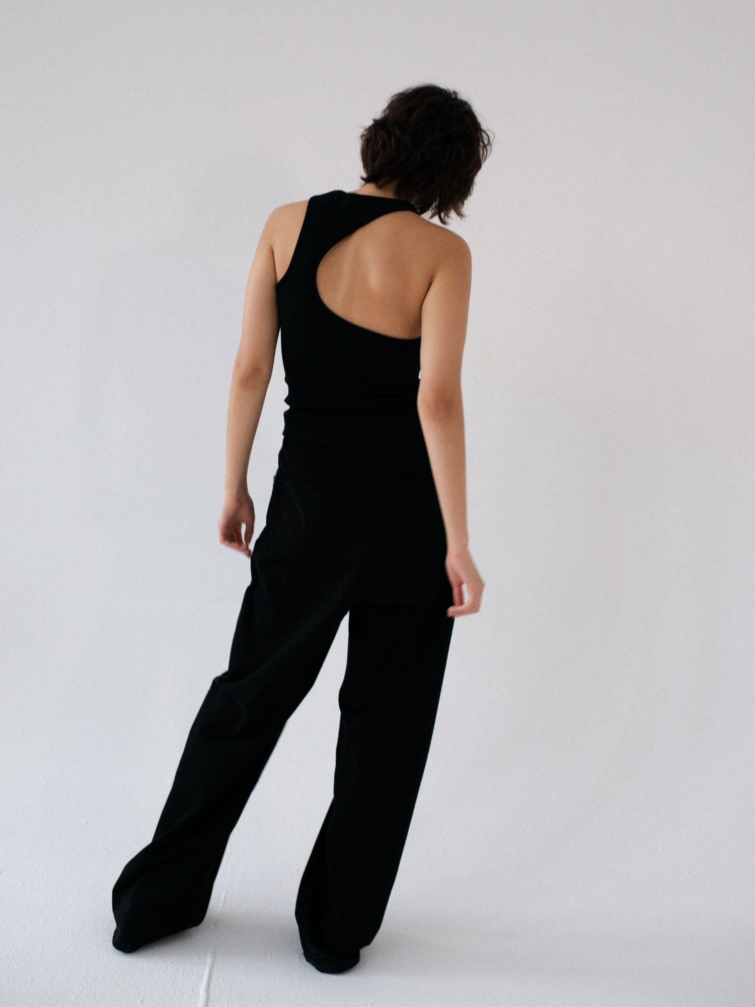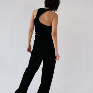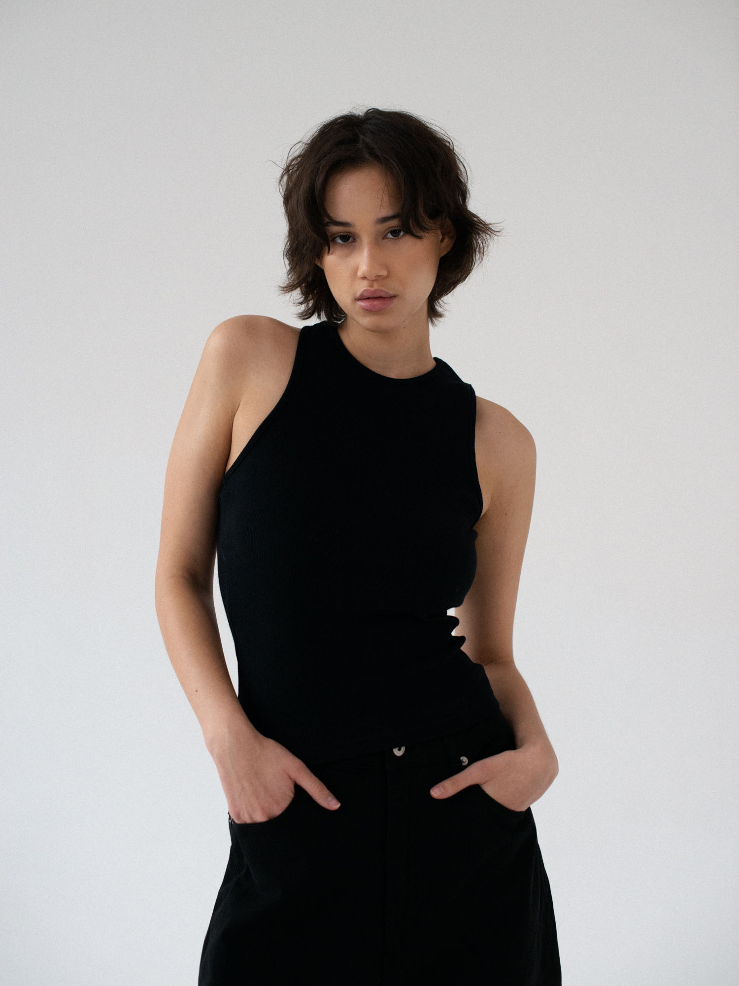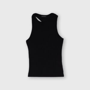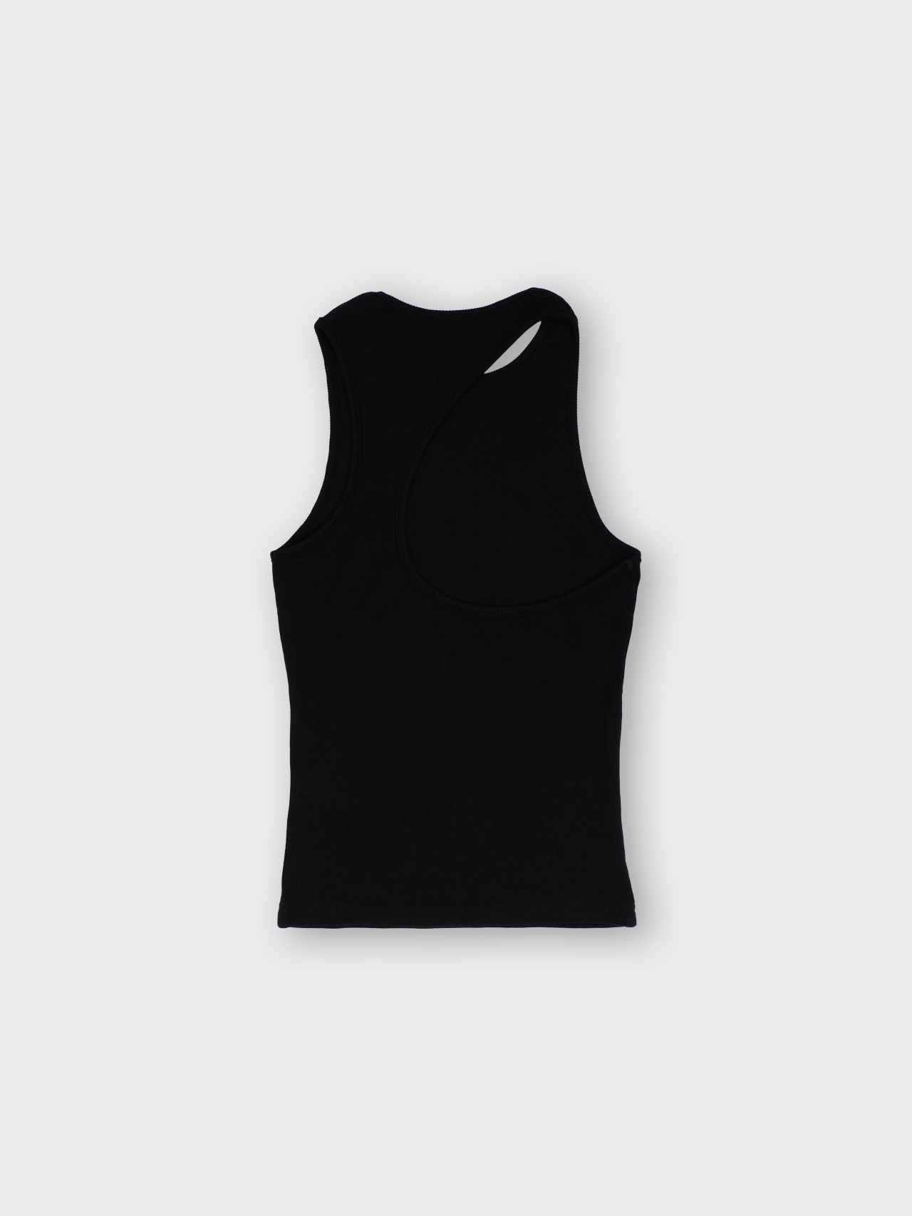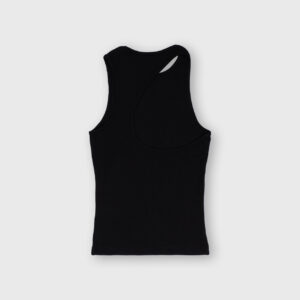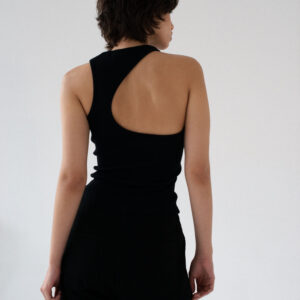 Tanktop uszyty z bawełnianego dżerseju w prążki z asymetrycznym wycięciem na plecach. Prosty krój idealnie dopasowuje się do sylwetki. Świetnie sprawdzi się z każdym rodzajem dołu.