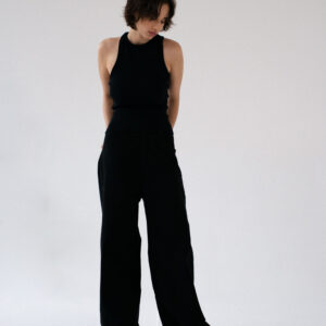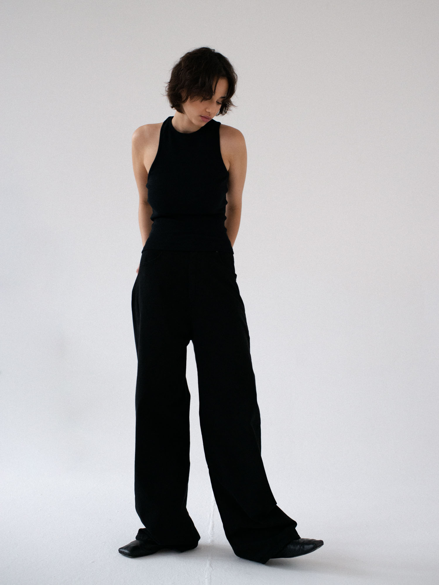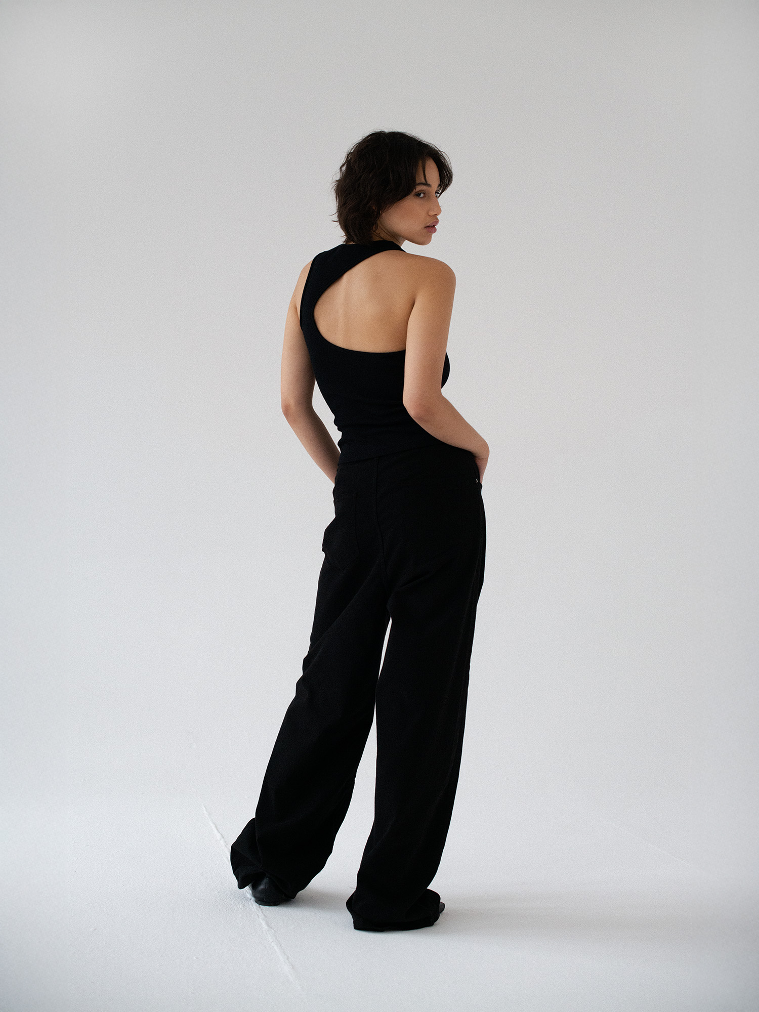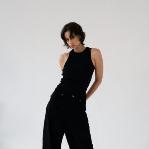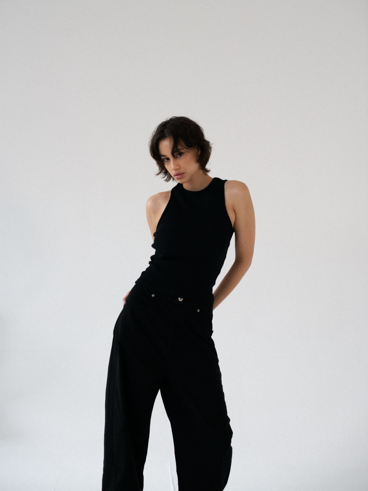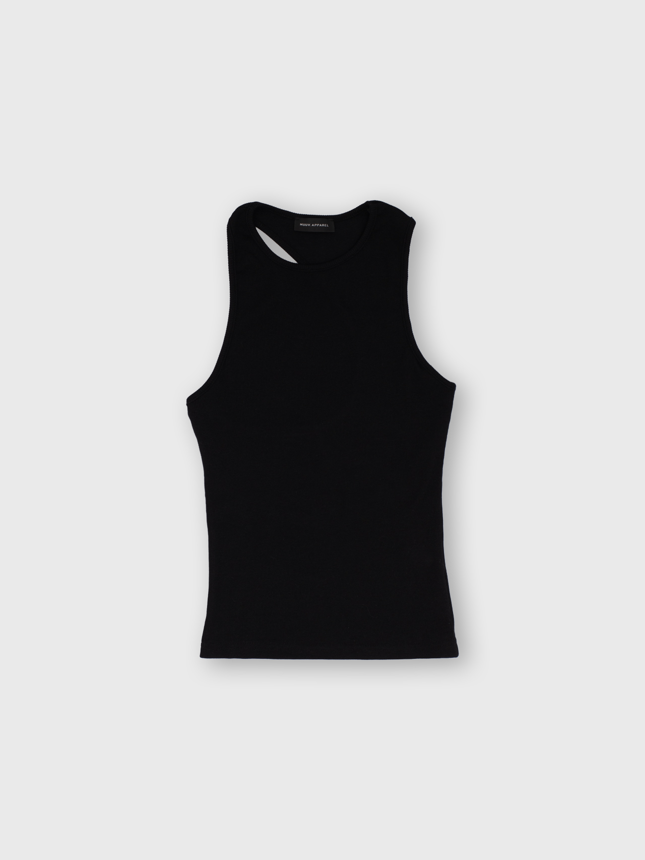 Tanktop uszyty z bawełnianego dżerseju w prążki z asymetrycznym wycięciem na plecach. Prosty krój idealnie dopasowuje się do sylwetki. Świetnie sprawdzi się z każdym rodzajem dołu.