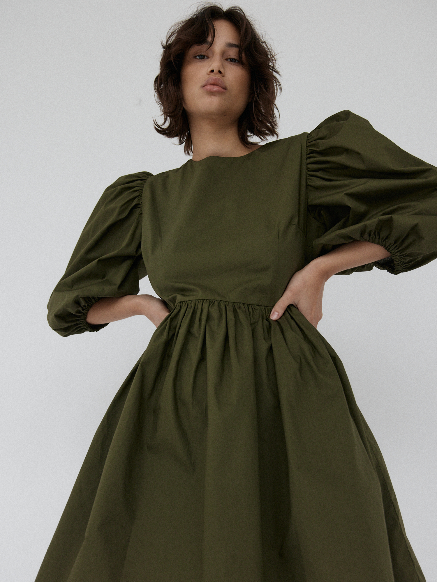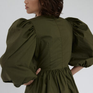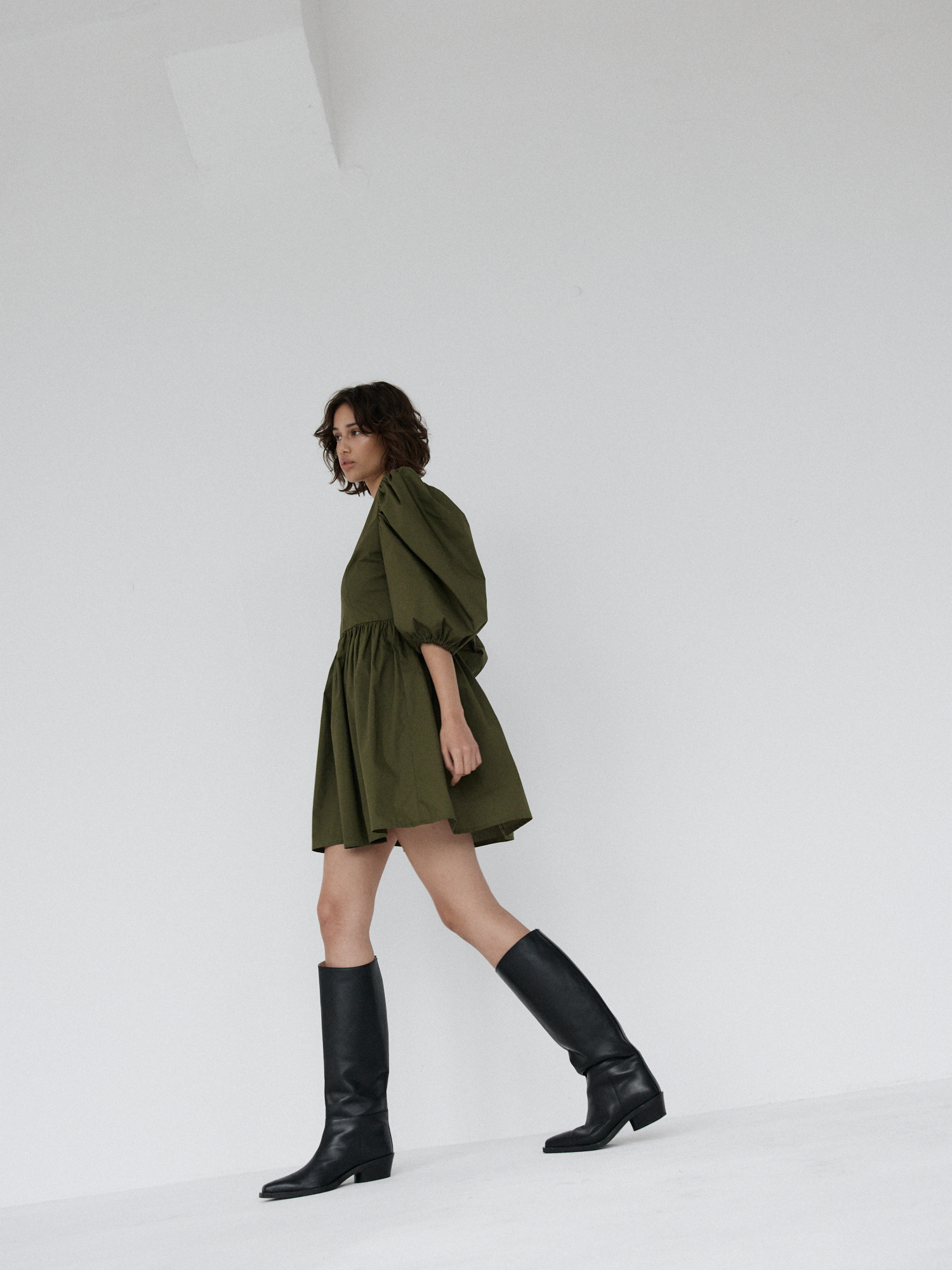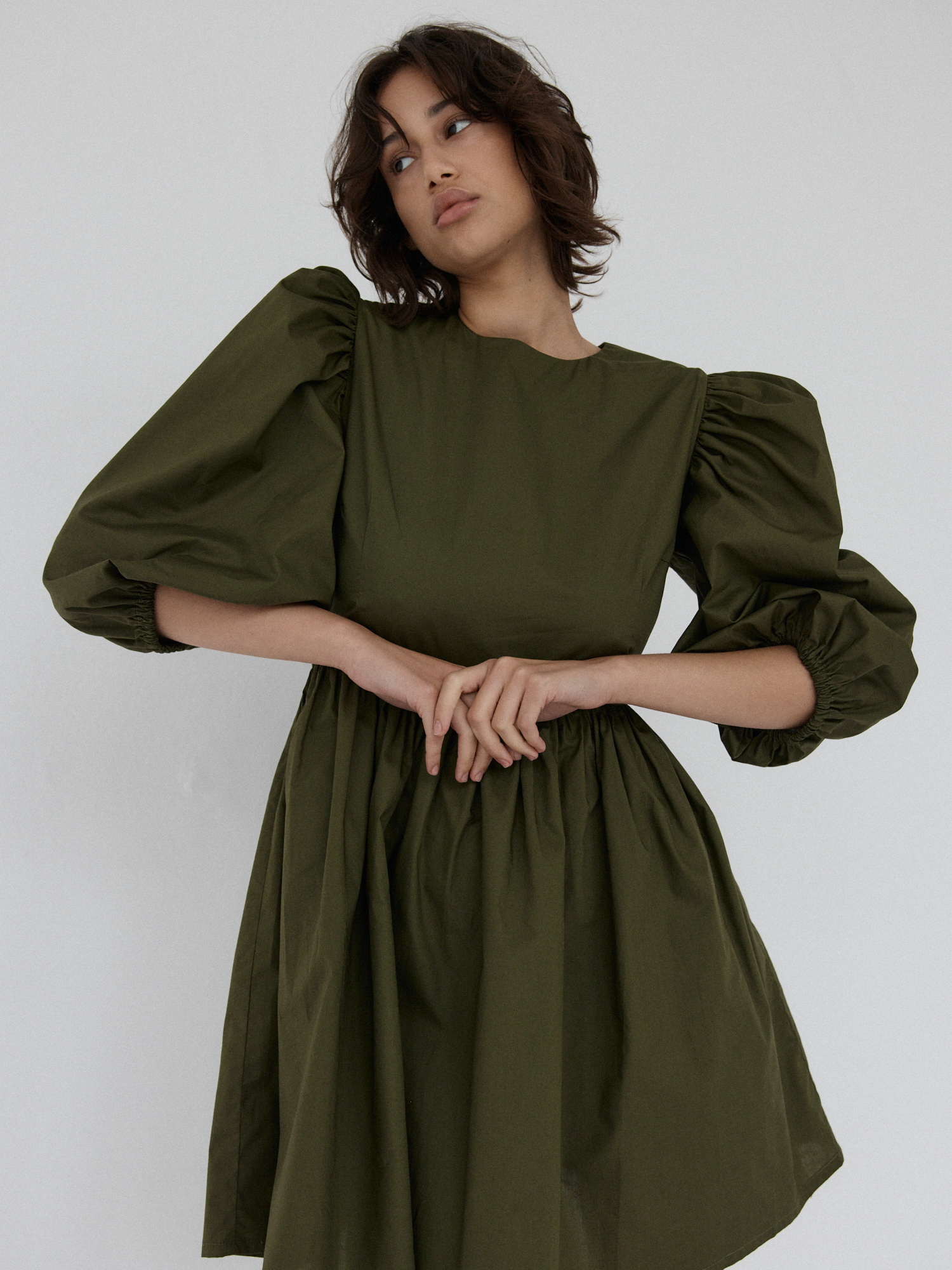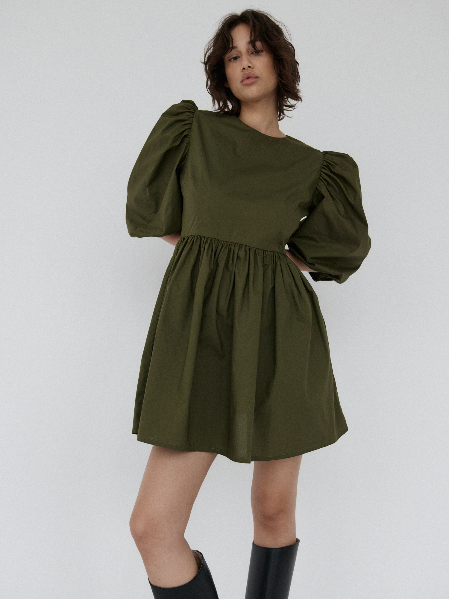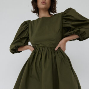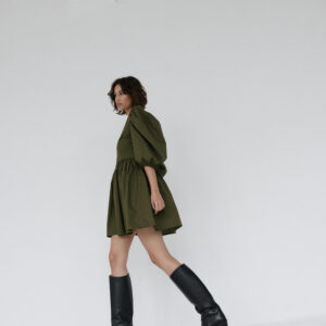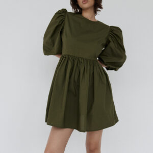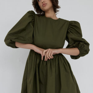 Krótka sukienka. Bufiaste rękawy o długości ¾ wykończone gumką z możliwością podwinięcia, które stanowią ciekawe przełamanie prostej, klasycznej formy. Sukienka ma subtelną talię i szeroki dół, który zapewnia komfort i lekkość. Idealna do stworzenia zarówno casualowych, jak i eleganckich stylizacji, świetnie komponuje się z wysokimi kozakami, jak i sneakersami.