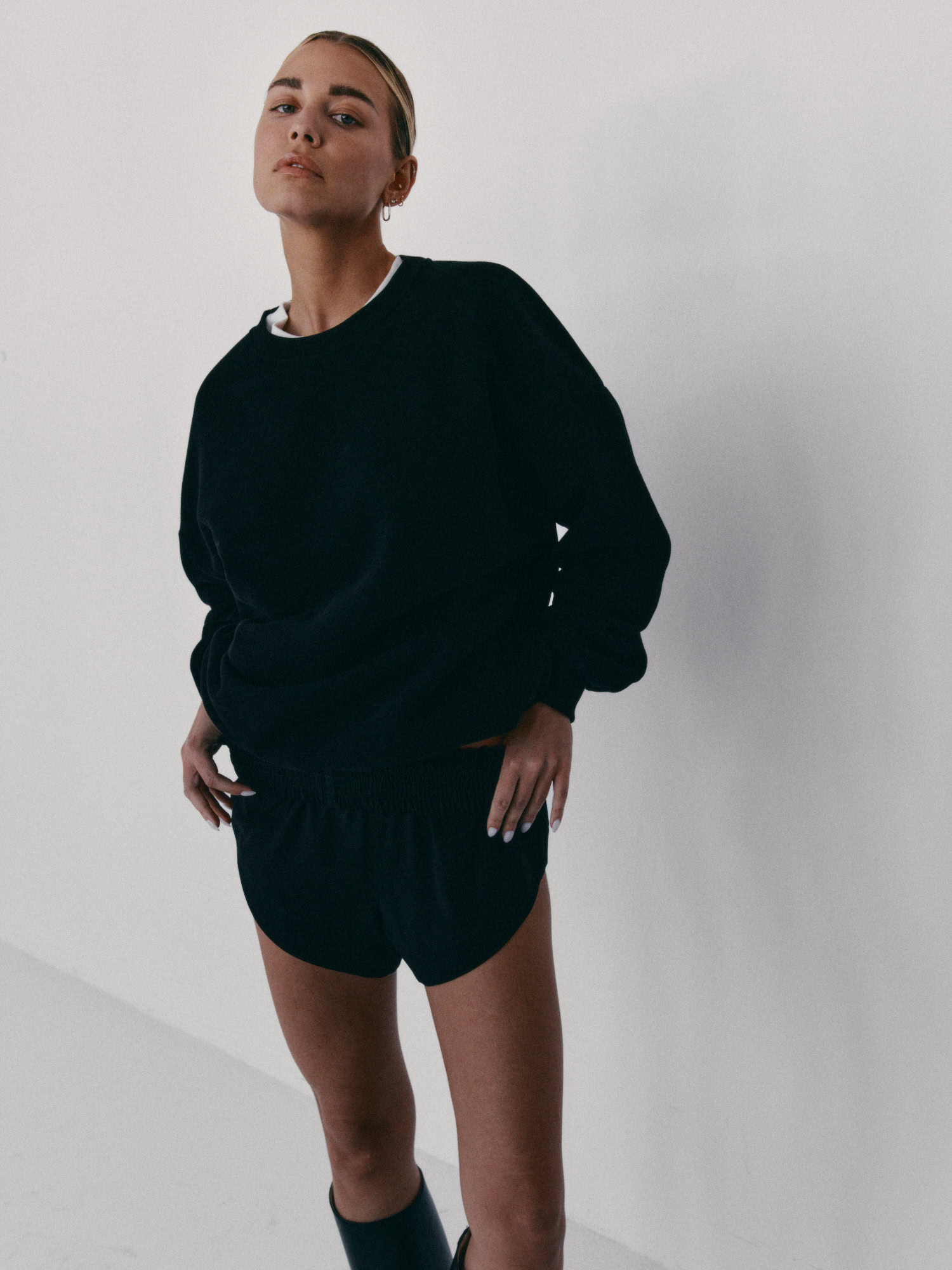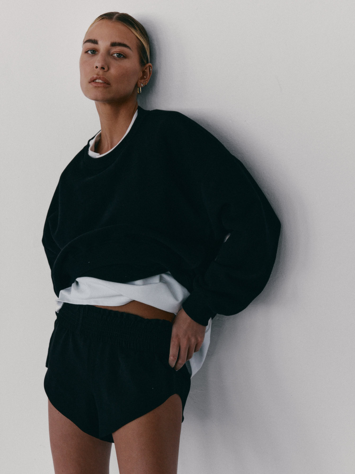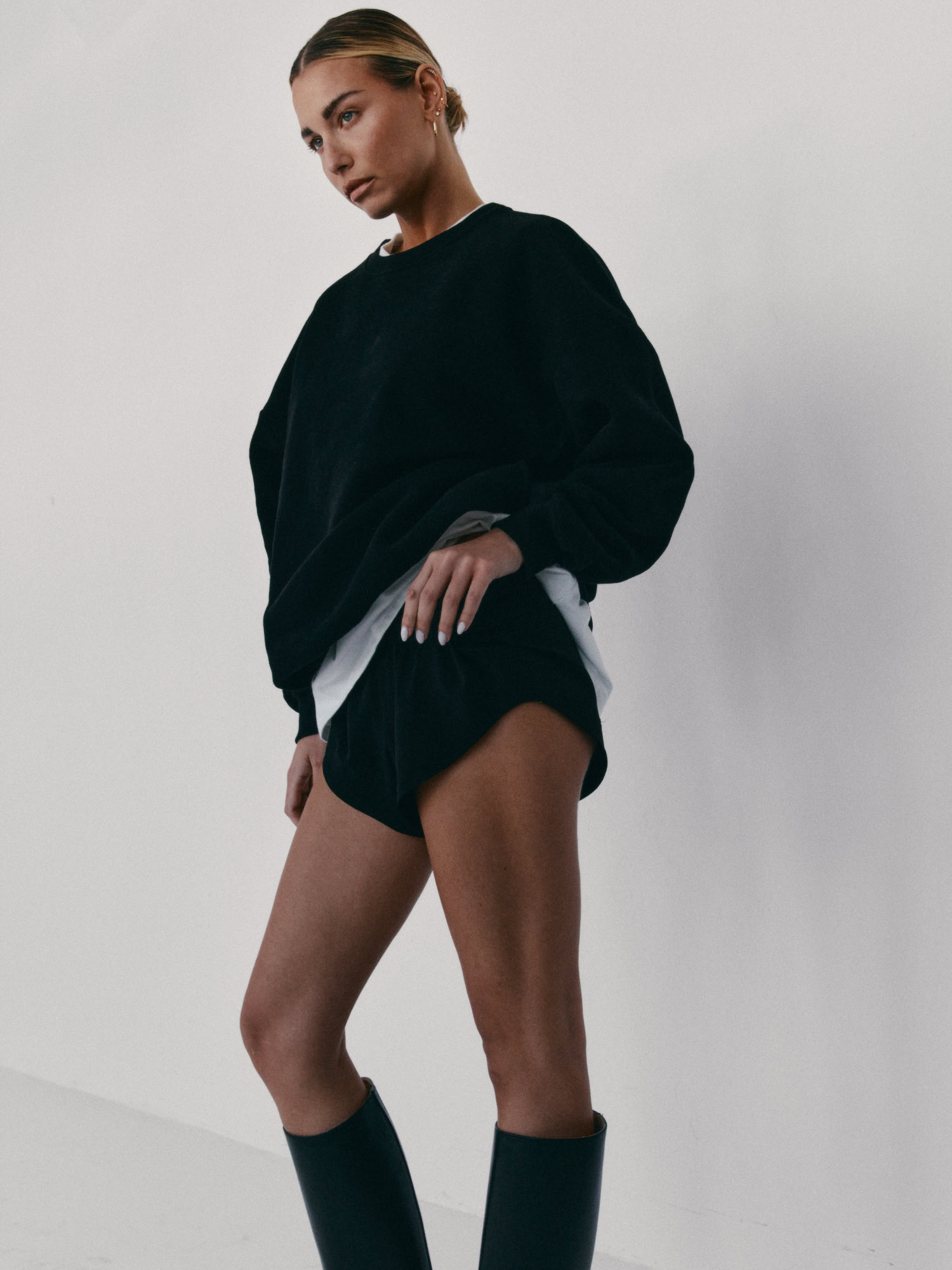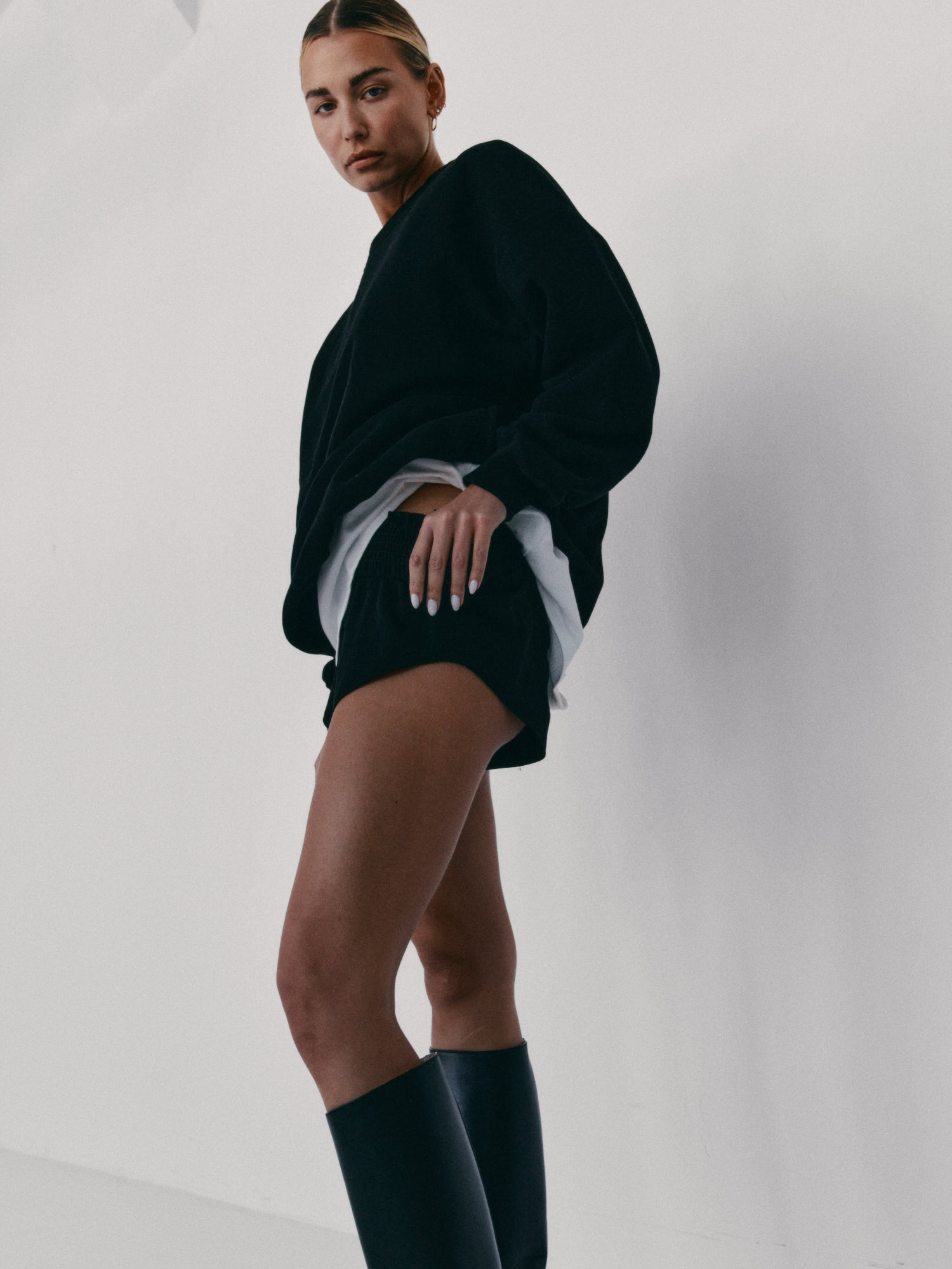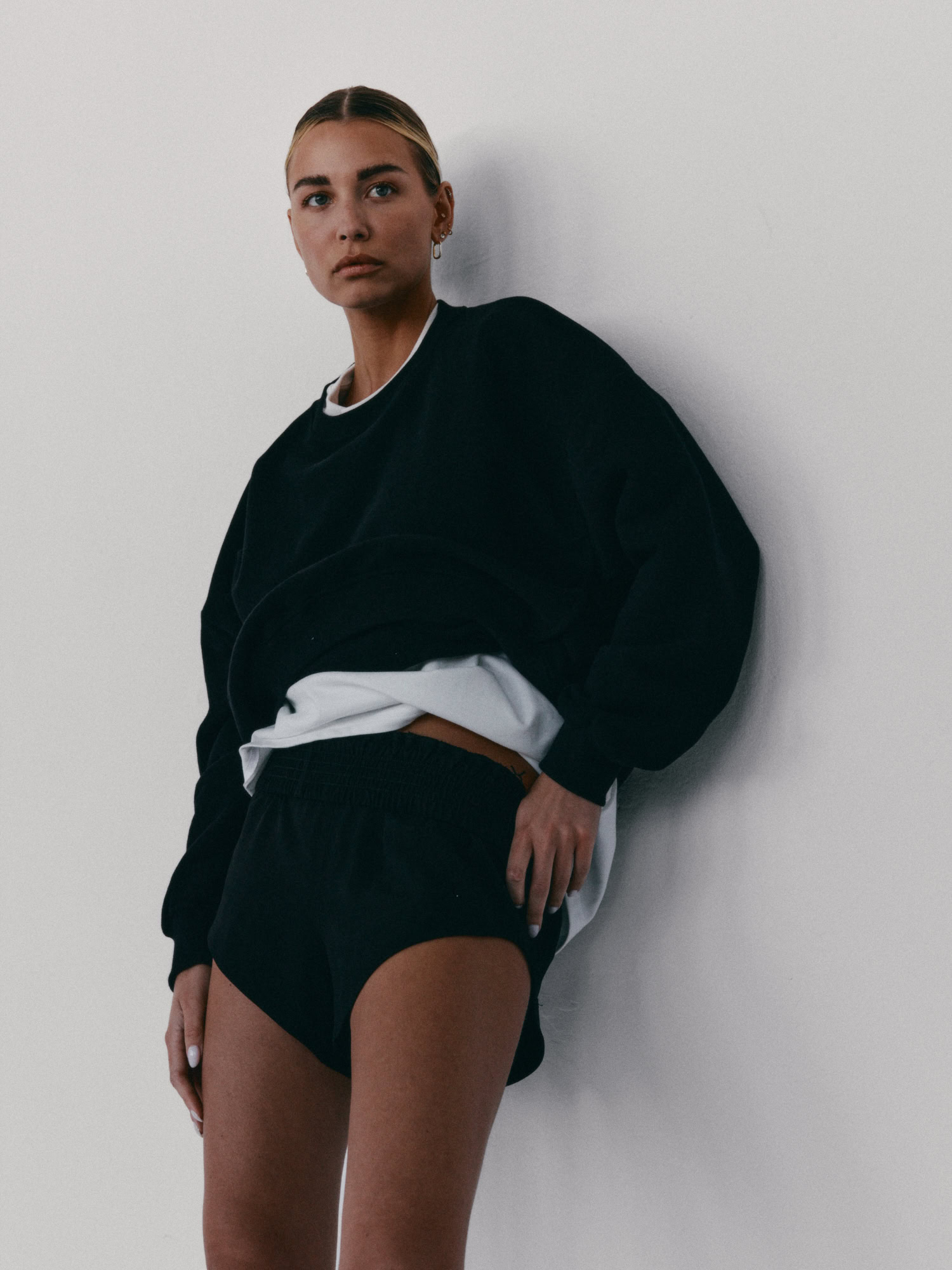 Spodenki z wysokim stanem i głębokimi wycięciami po bokach, które optycznie wydłużają nogi. Szeroka guma w pasie dopełnia całości i jednocześnie pozwala na swobodne dopasowanie do sylwetki. Model nie posiada suwaka. Najlepiej prezentują się w monochromatycznych zestawach. Idealnie komponują się z koszulką DUE w tym samym odcieniu.