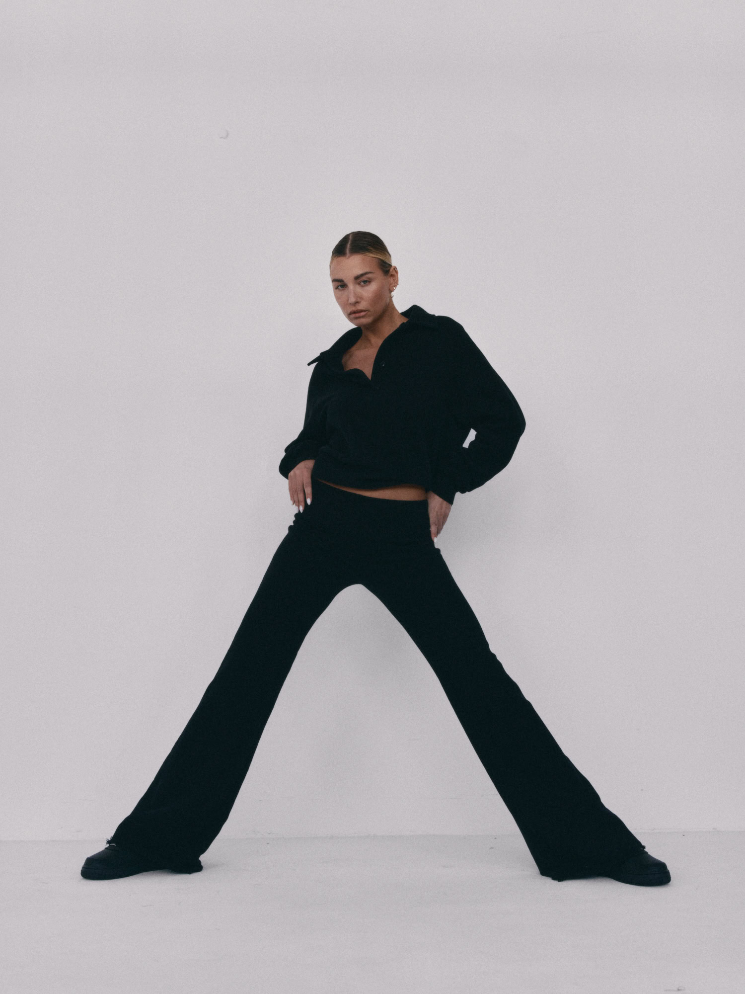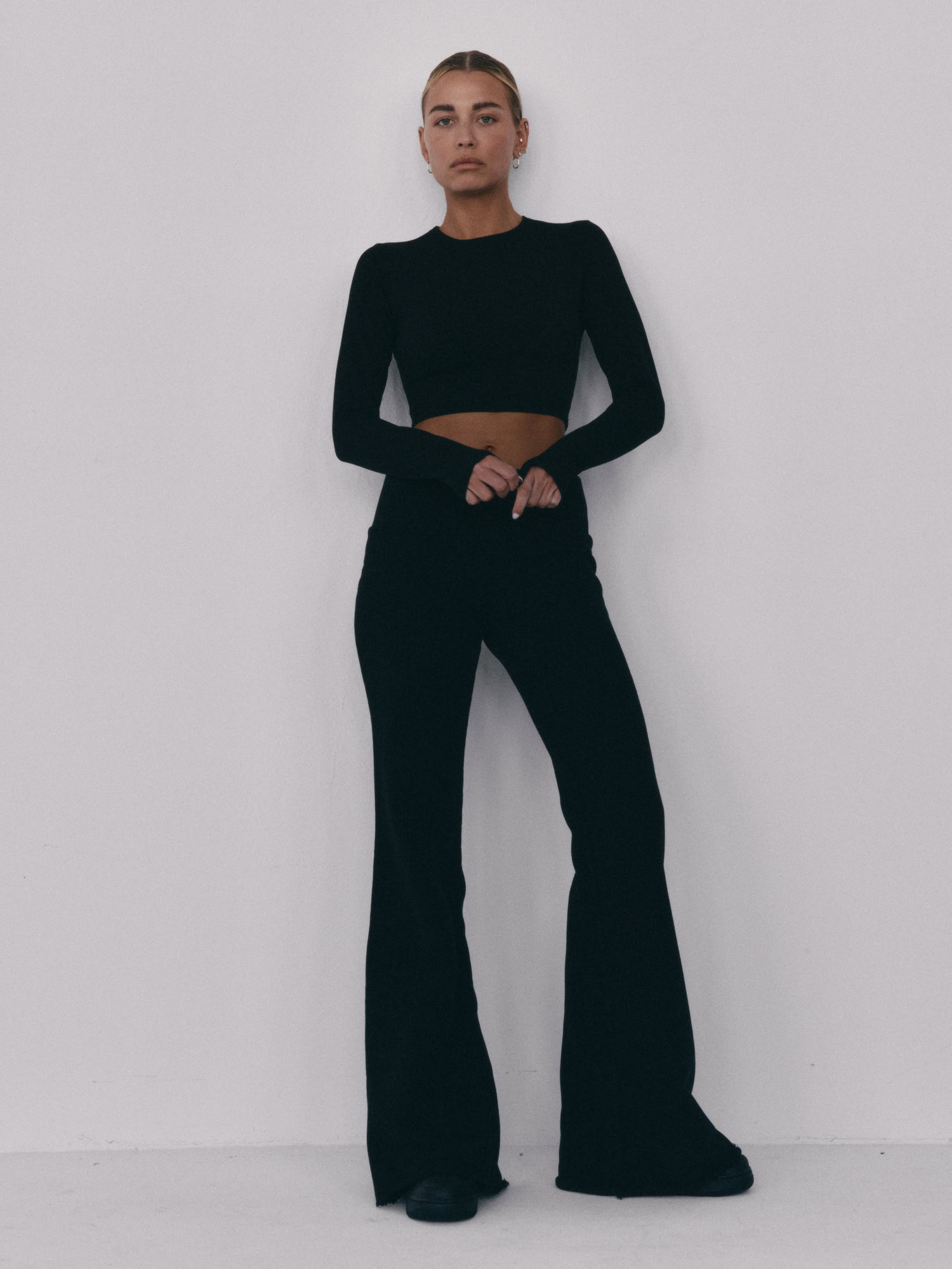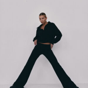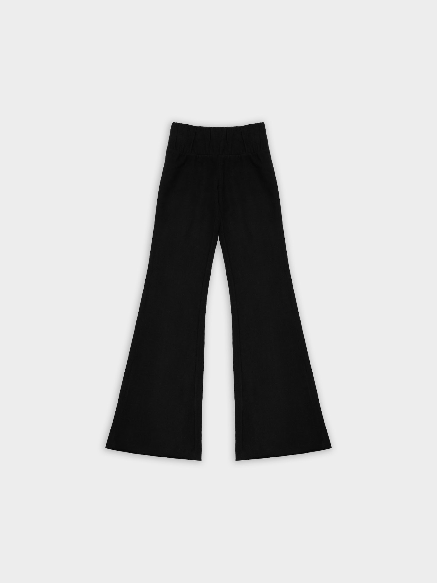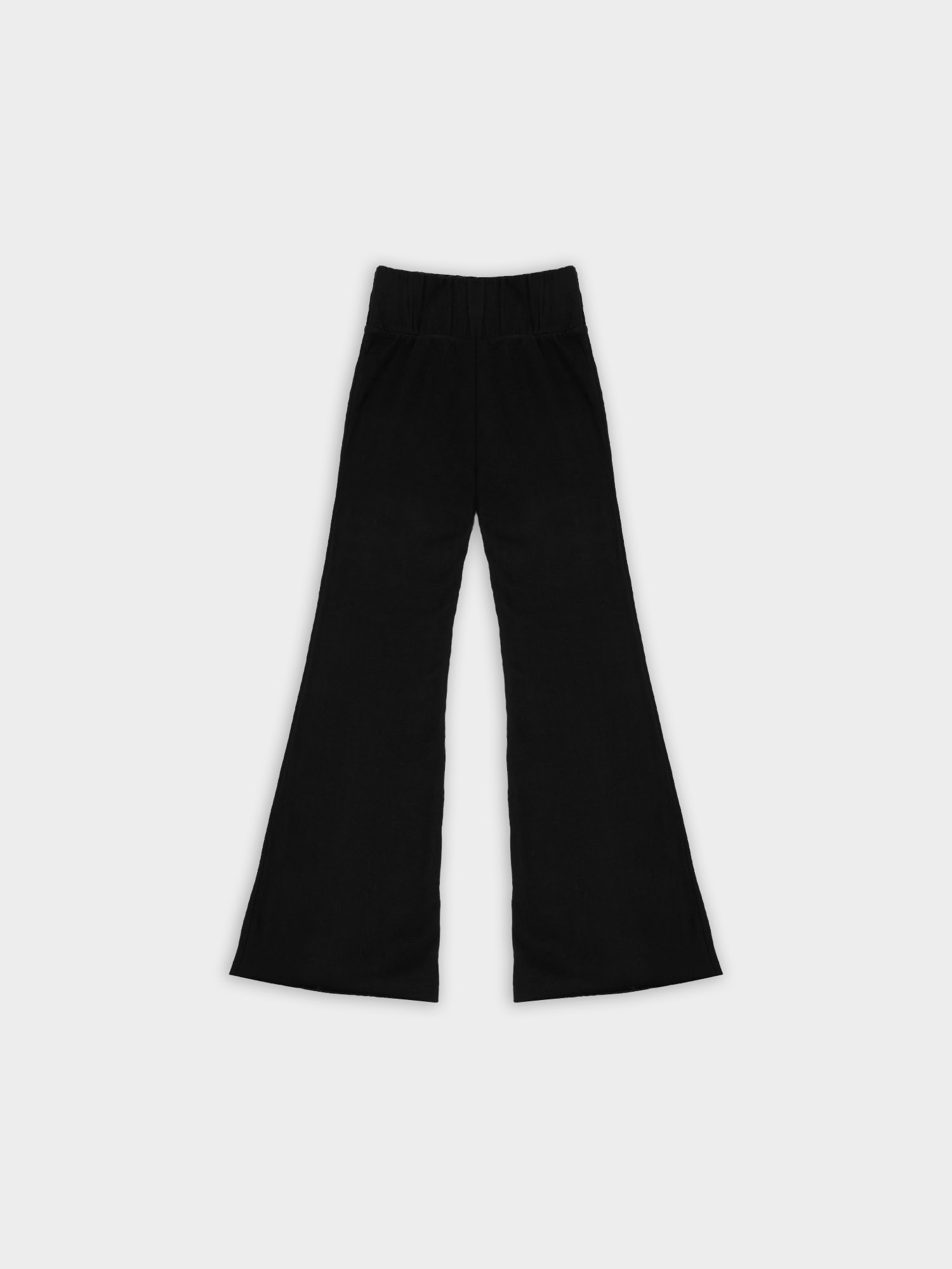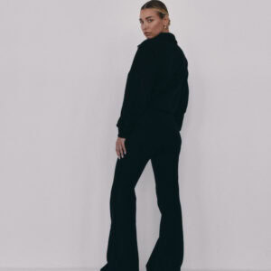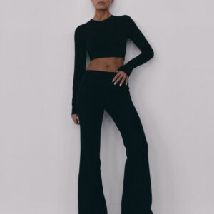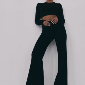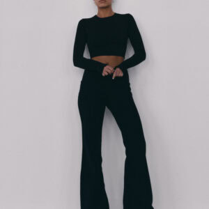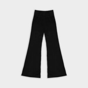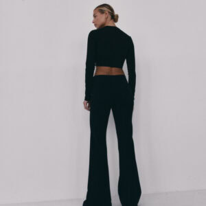 Spodnie typu flare z niskim stanem i nogawkami rozszerzanymi ku dołowi. Model posiada szeroką gumę w pasie, która delikatnie opina ciało. Spodnie idealnie podkreślają sylwetkę.