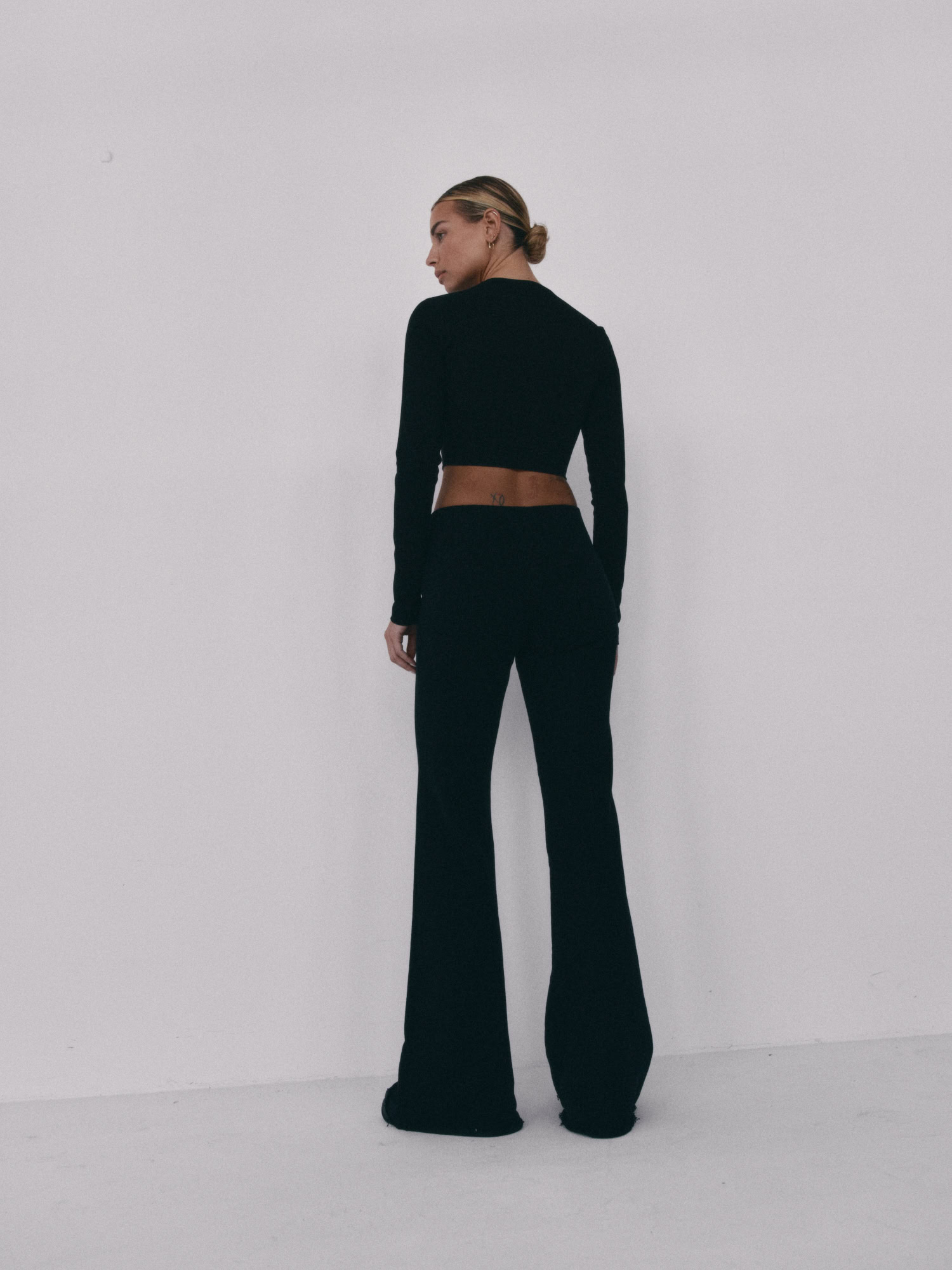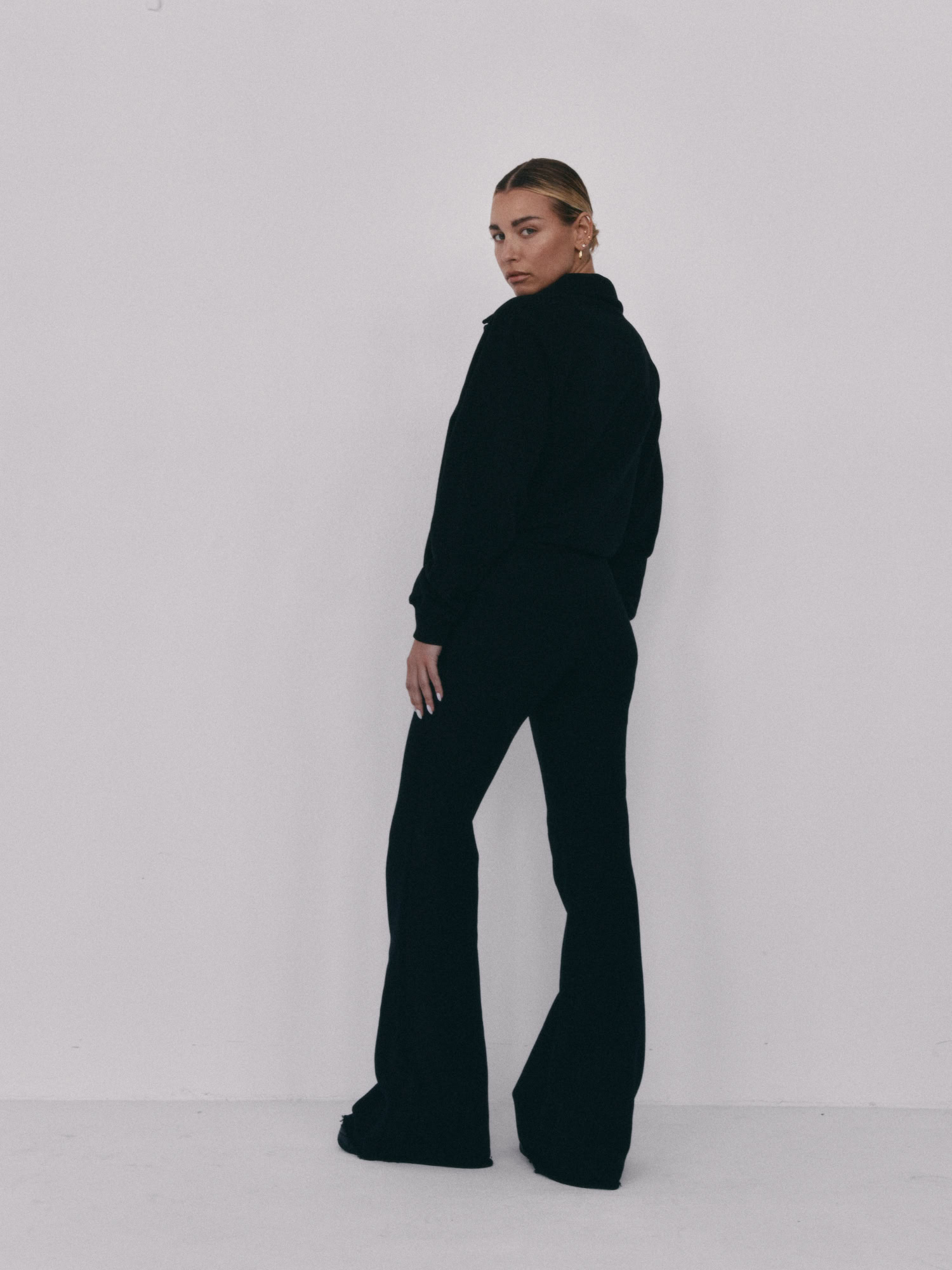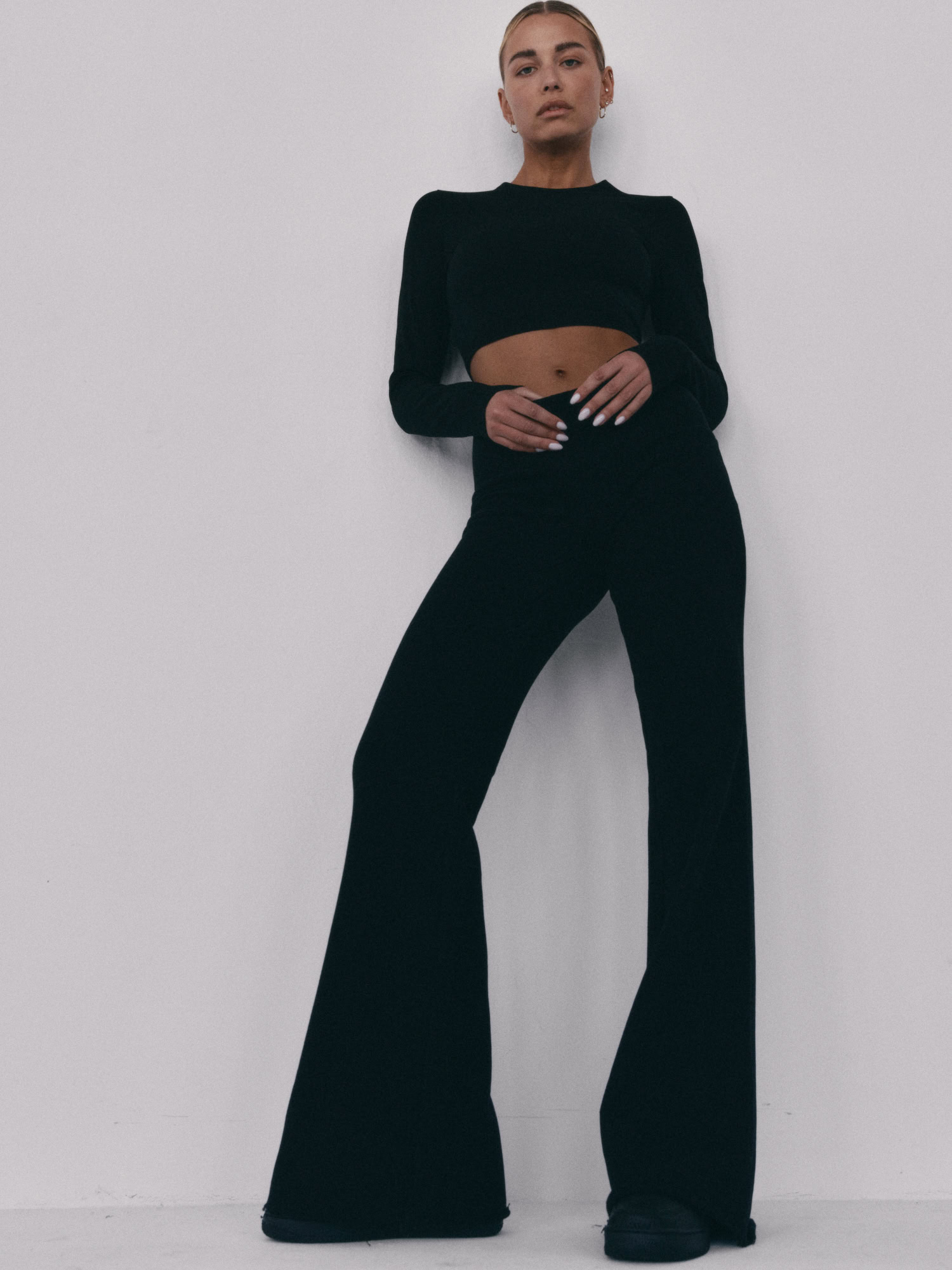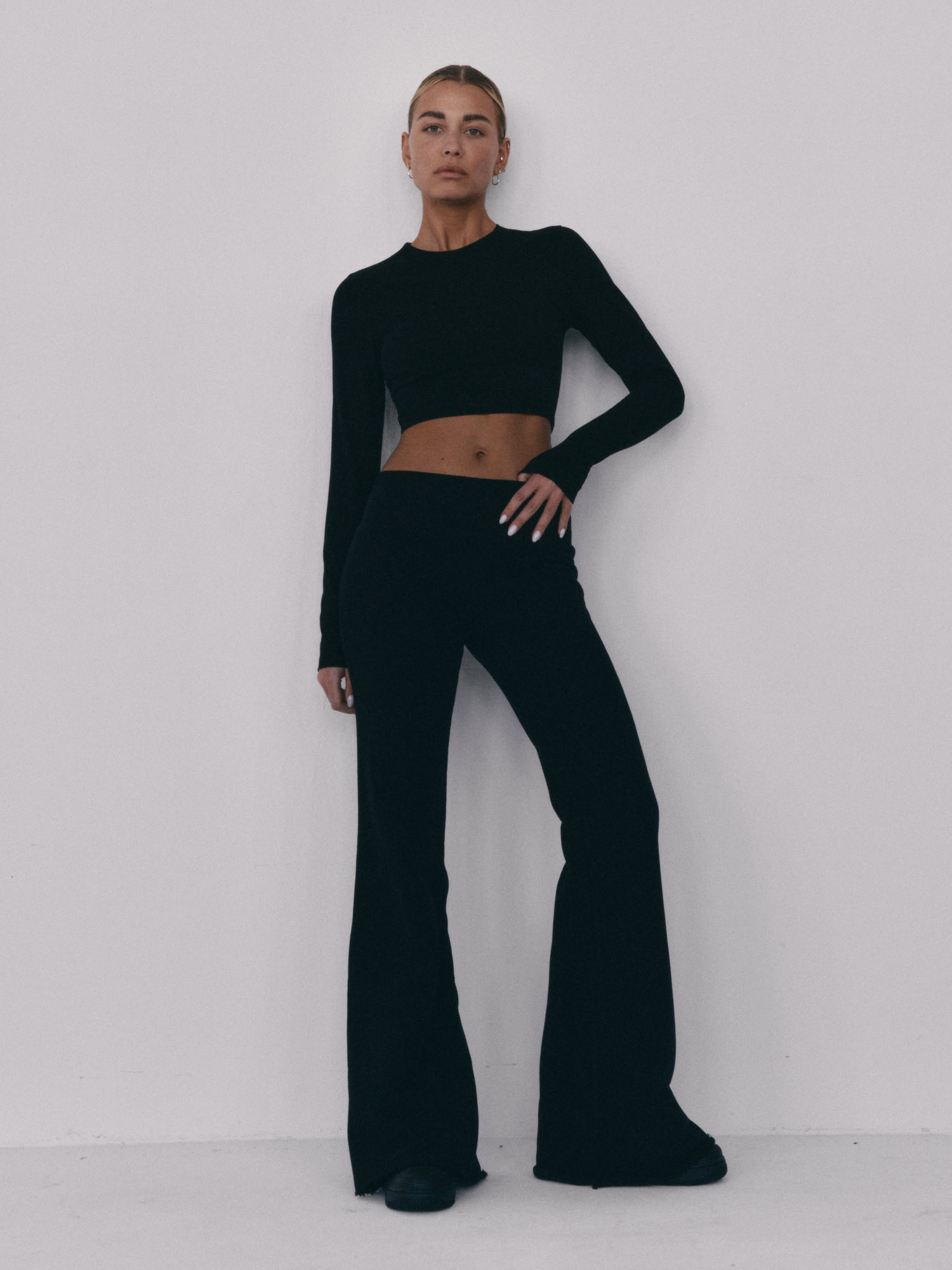 Spodnie typu flare z niskim stanem i nogawkami rozszerzanymi ku dołowi. Model posiada szeroką gumę w pasie, która delikatnie opina ciało. Spodnie idealnie podkreślają sylwetkę.